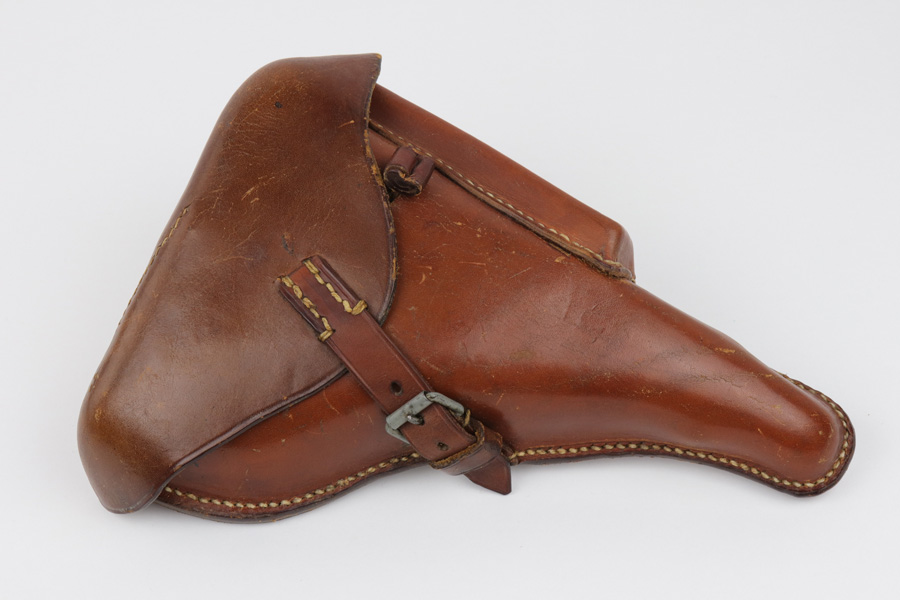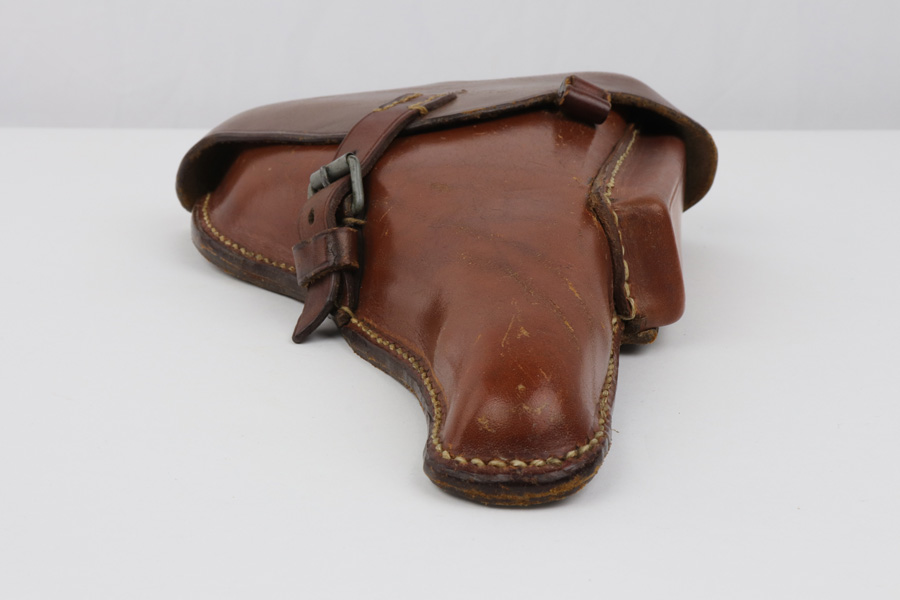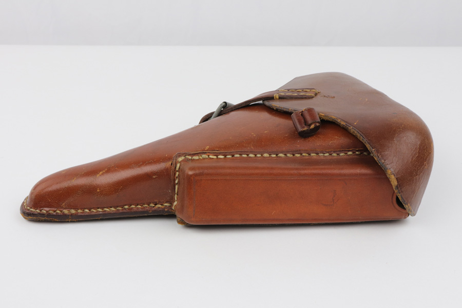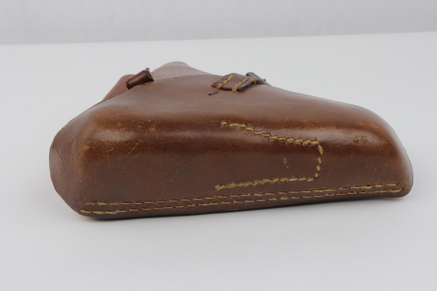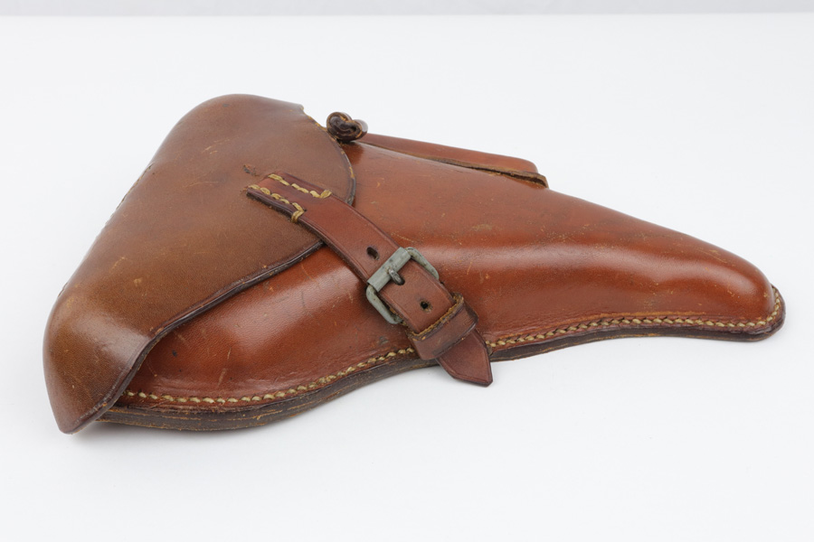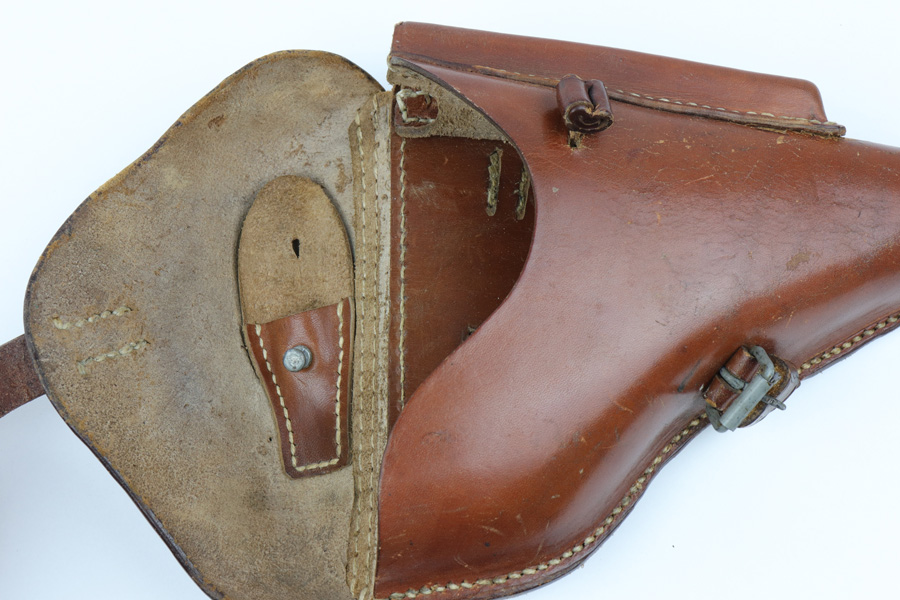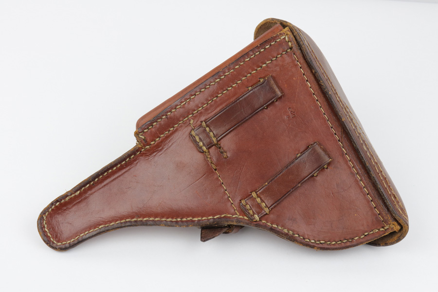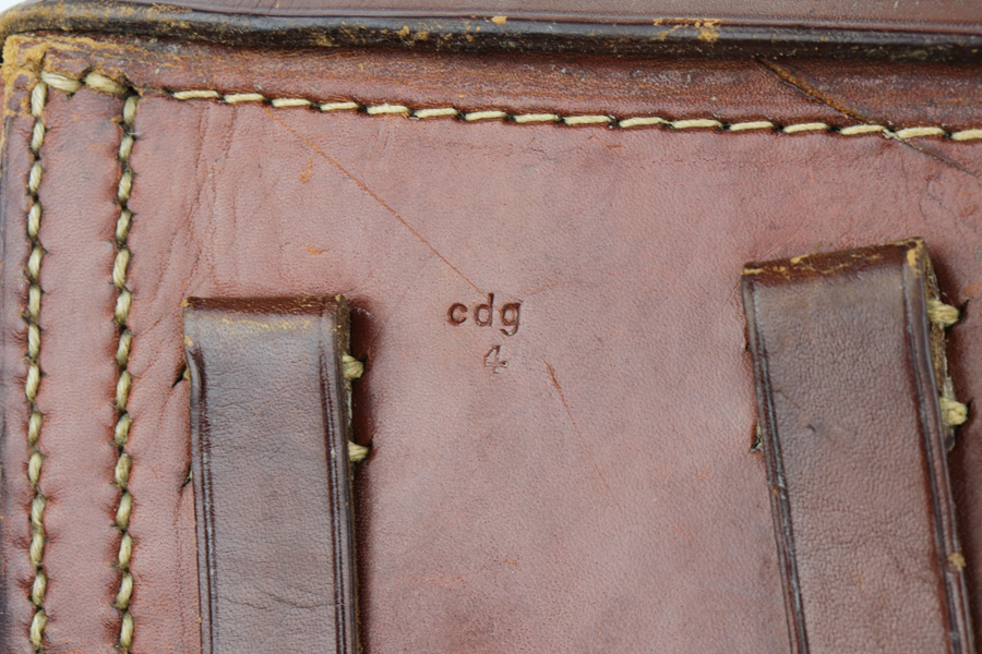 5/22/20 – This is a rare, mint / unissued condition end-of-war production Luger holster. The holster is stamped “cdg 4” on the back leather, which is a maker stamp and date. The leather is light brown and minty, almost unissued condition. It’s likely this holster was never issued as it was made during the final days of the nazi regime. The leather has minor scuffs on the interior but very clean overall. Leather is firm with light pliability.