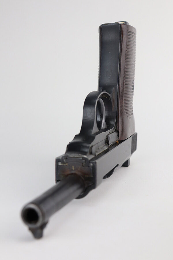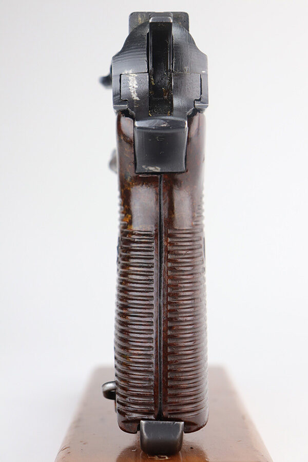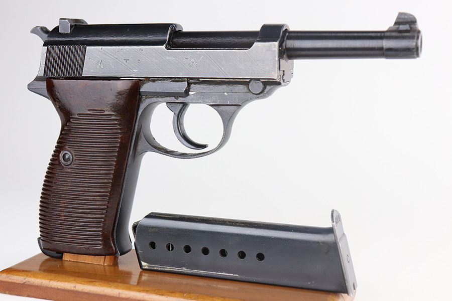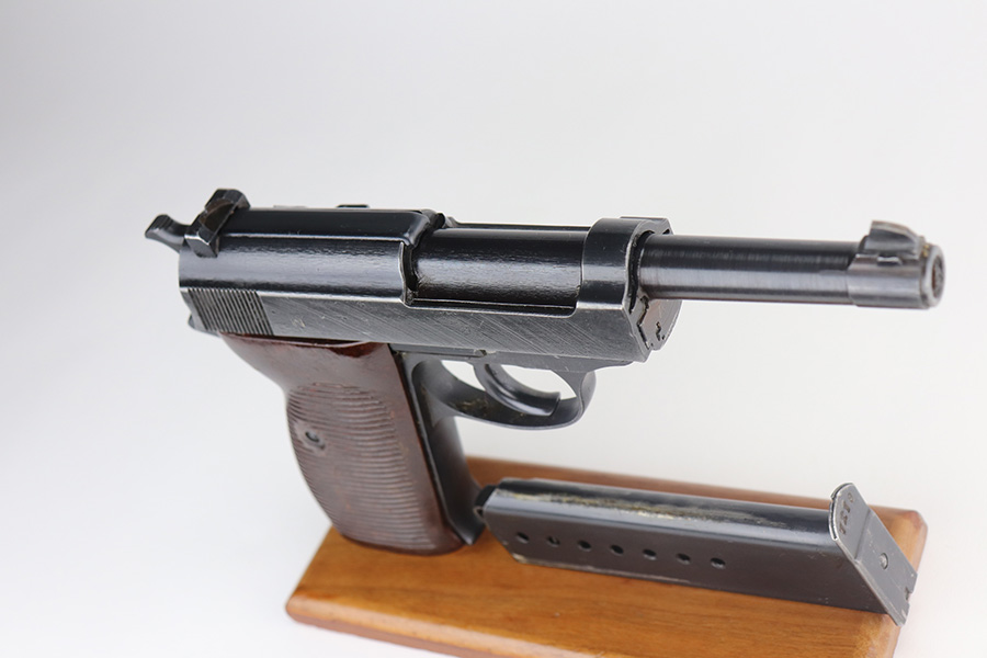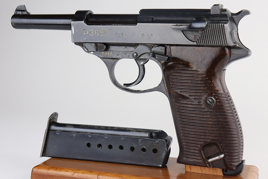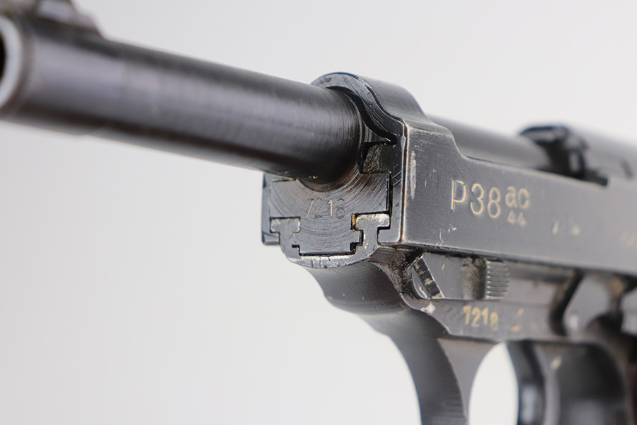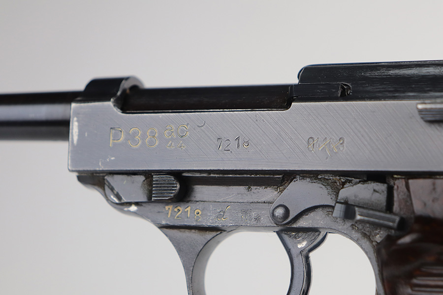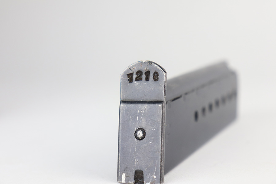 6/3/21 – This is an excellent example of a P.38 that was put together from parts at the end of WW2 and reworked after WW2 by the East German police. It has a “Crown N” marked barrel, a Mauser frame, and a rare “AC 44” FN slide. Every part was numbered or renumbered at the police arsenal to match. Also comes with an arsenal-numbered matching magazine. It has retained about 96-97% of its finish. There are a few small handling marks here and there and very minor thinning on the sides of the slide. A few small areas of minor pitting on the right side of the slide. Excellent late-war grips. Mint bore. De-cocker is functional. The internals are covered in thick grease and could benefit from a good cleaning.