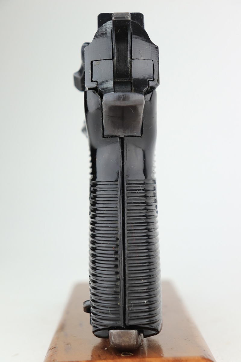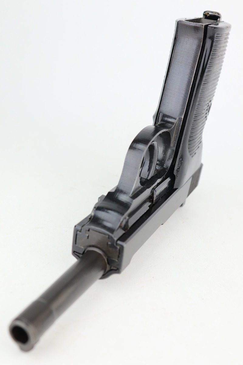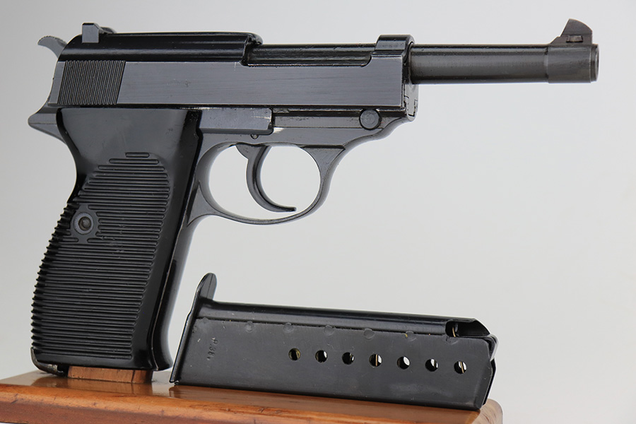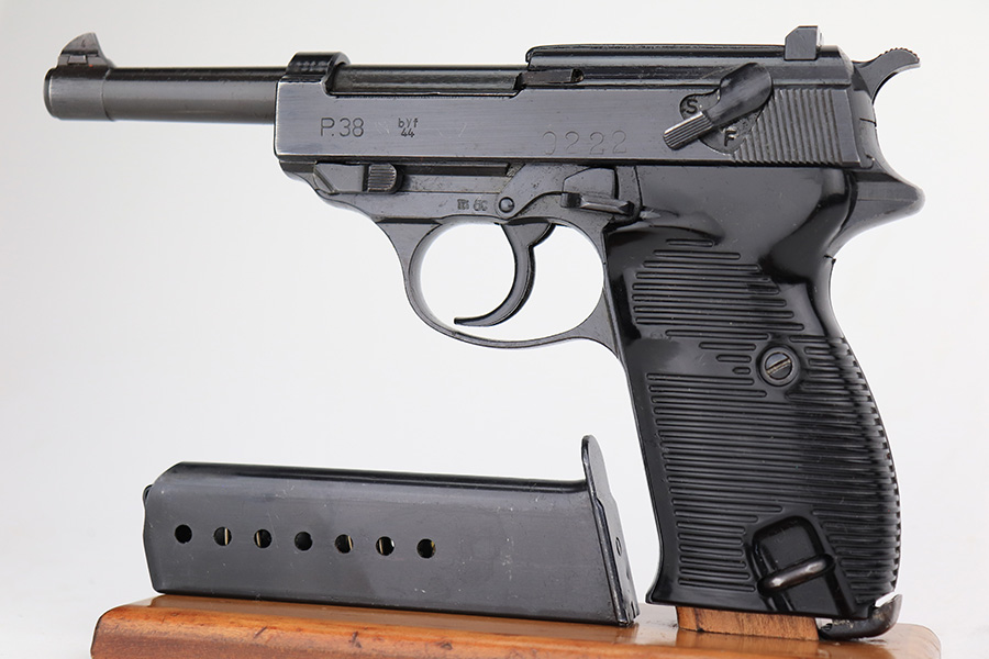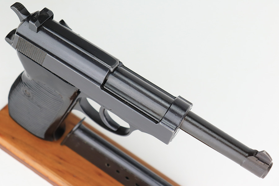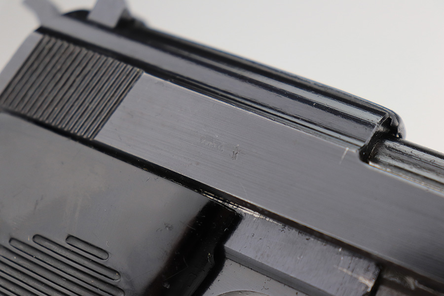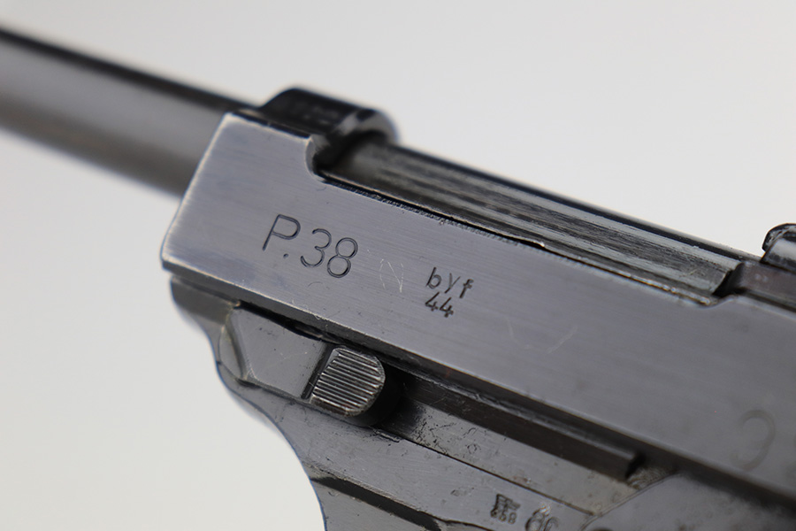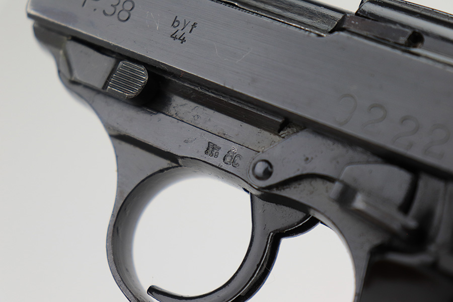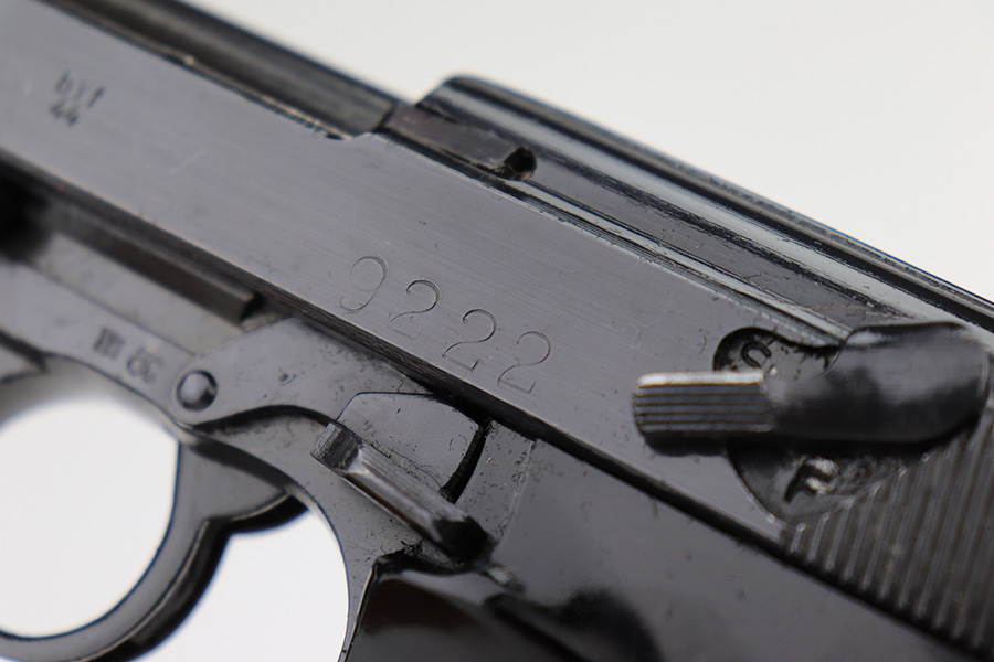 9/6/24 – This is a scarce P.38 put together from parts at the end of WW2. The slide was made by Mauser and is “BYF 44” marked and “Waffen 135” proofed. The frame was made by Walther and is “ac” marked and “Eagle 359” proofed. The barrel is “Waffen 135” proofed. The gun originally had no serial numbers, but one was added on the left side of the slide. This one has been entirely refinished with essentially no actual finish loss. Fitted with nice black plastic Mauser grips. Comes with an “Eagle 359” marked Walther magazine. Like-new bore. De-cocker is not functional.
