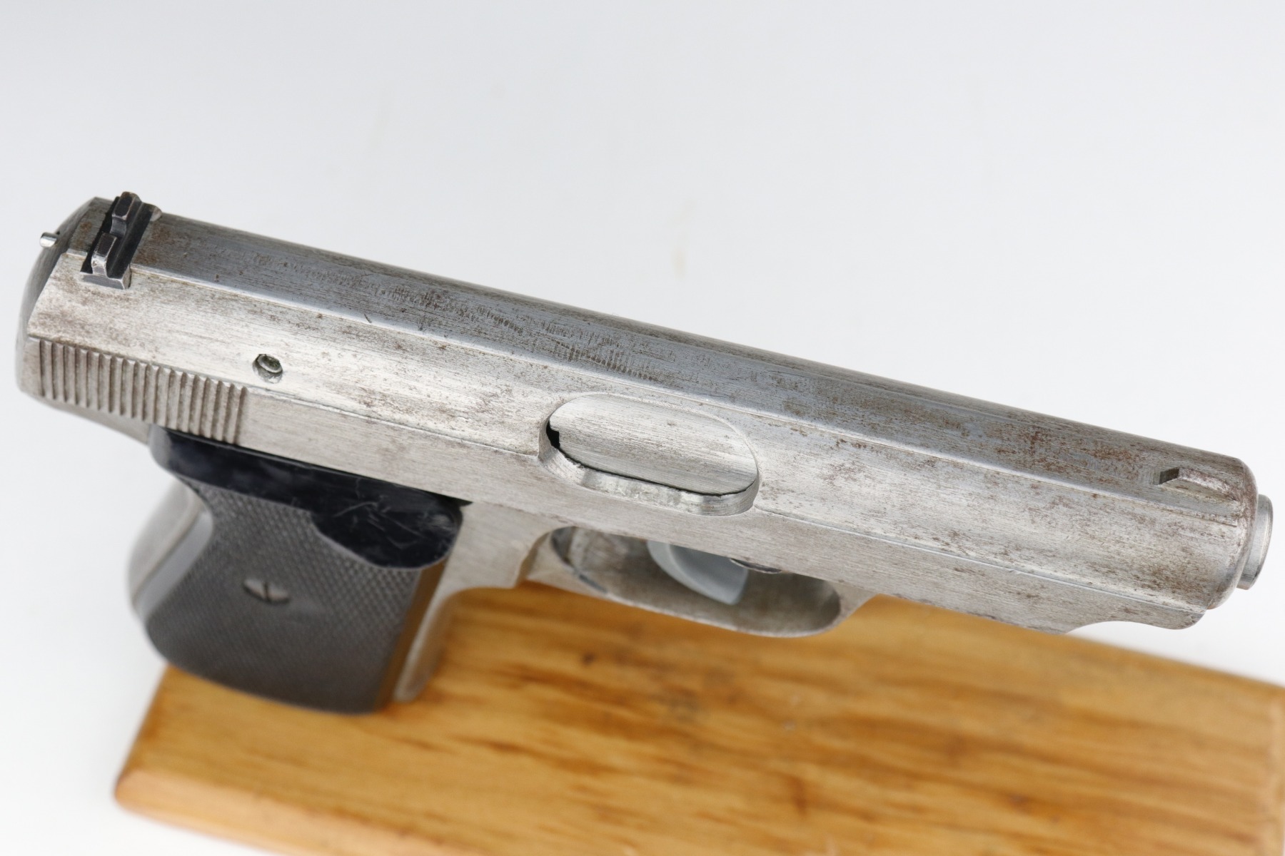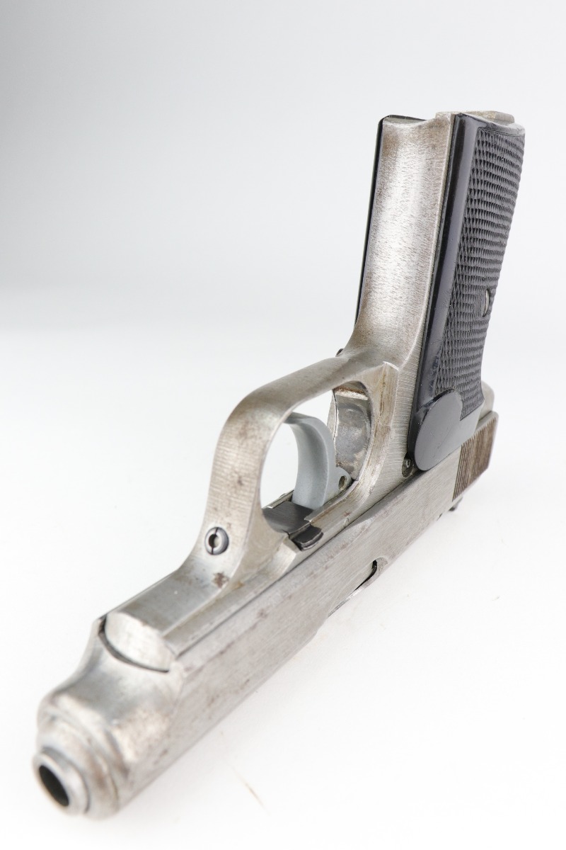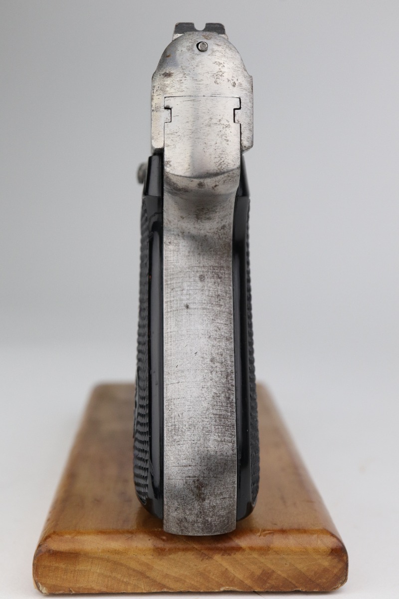 1/11/21 – This is an end-of-WW2 Sauer 38h pistol, chambered in 7.65mm. This gun is matching but was never finish or proof-stamped. This indicates to us that it was captured at the end of WW2 before it was ever finished. The metal is all “in-the-white” and has no finish. It is fully functional and the action is smooth. The metal is completely in tact but there is spotty oxidation throughout. It comes with excellent period-correct grips and one magazine. The rifling in the bore is a little worn and there is pin-pricking throughout.