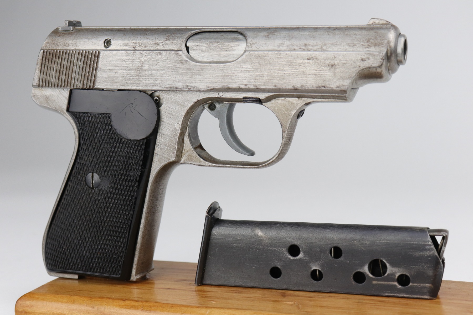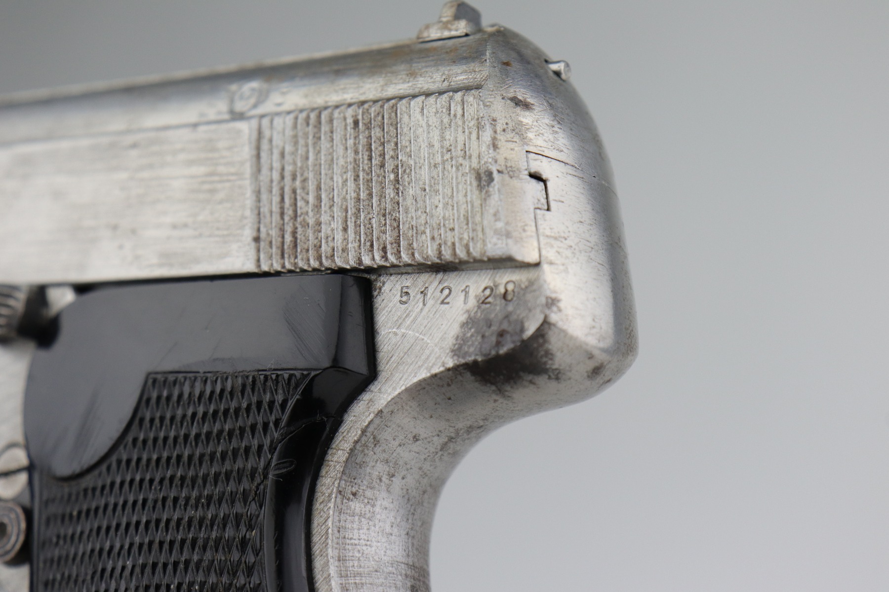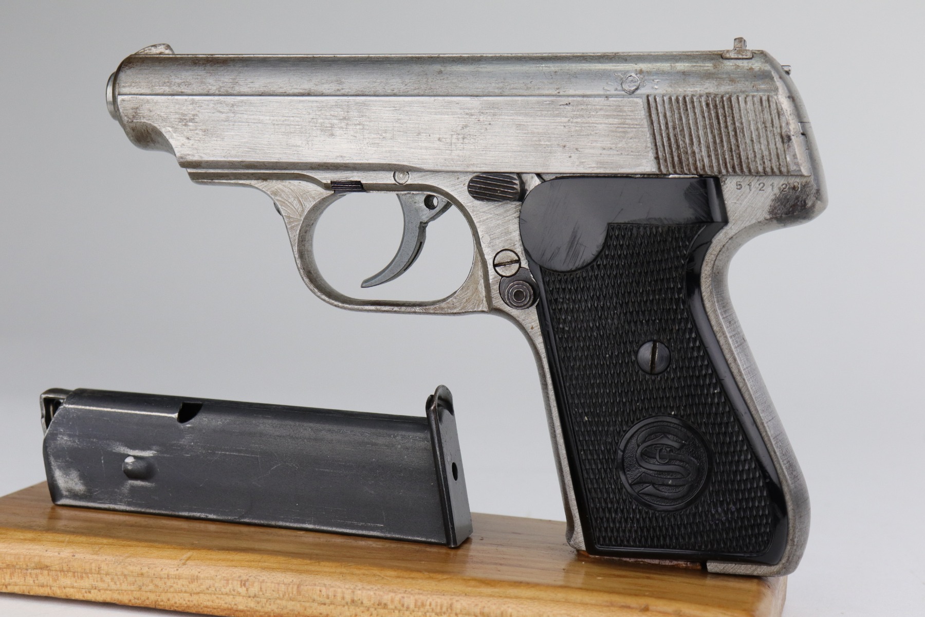 1/11/21 – This is an end-of-WW2 Sauer 38h pistol, chambered in 7.65mm. This gun is matching but was never finish or proof-stamped. This indicates to us that it was captured at the end of WW2 before it was ever finished. The metal is all “in-the-white” and has no finish. It is fully functional and the action is smooth. The metal is completely in tact but there is spotty oxidation throughout. It comes with excellent period-correct grips and one magazine. The rifling in the bore is a little worn and there is pin-pricking throughout.