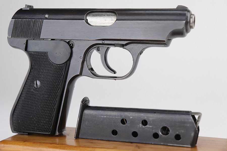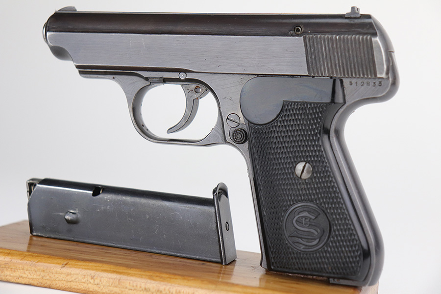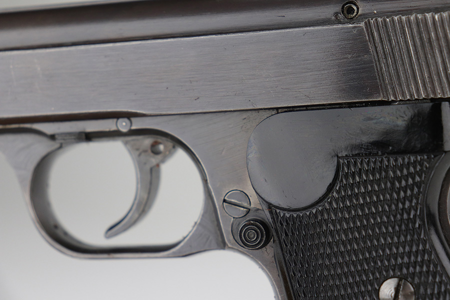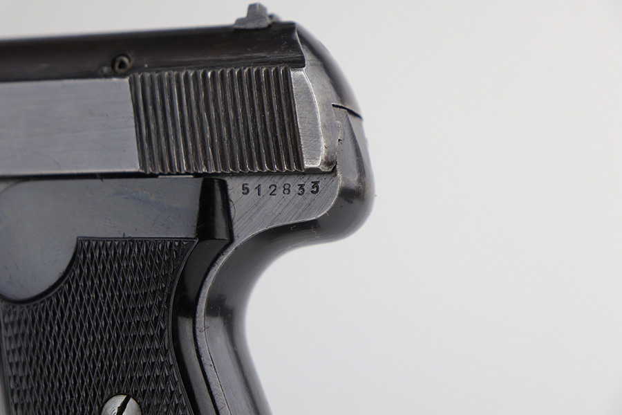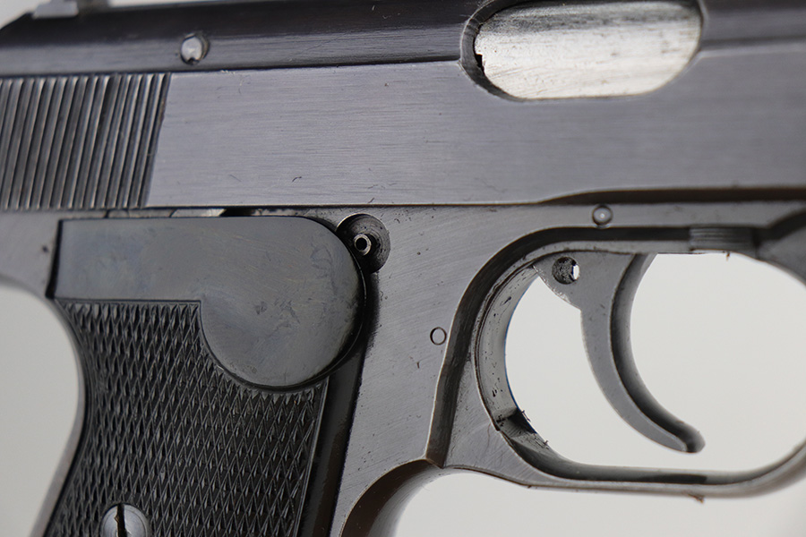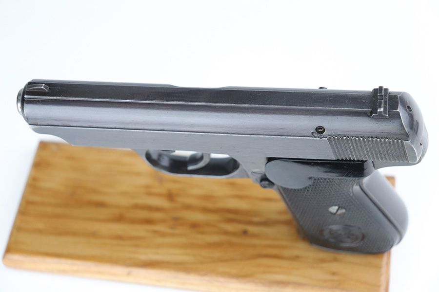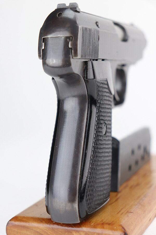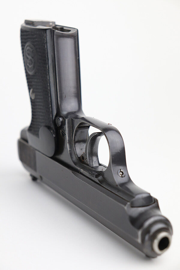 6/28/23 – This is an excellent example of a very late Sauer 38h made at the end of WW2. It is all matching and has no firing or acceptance proofs. It was never issued to the military and likely never made it out of factory before WW2 was over. The gun is excellent, retaining about 96% of its original finish. There are hints of wear on the high edges in general and around the muzzle. There is one small area of wear at the base of the back strap. There are a few very light handling marks on the left side of the slide. Comes with excellent period-correct black bakelite grips. The bore is mint.