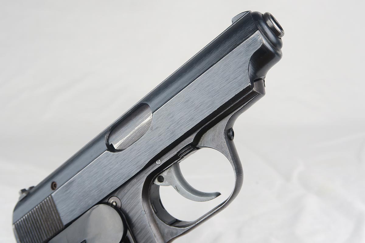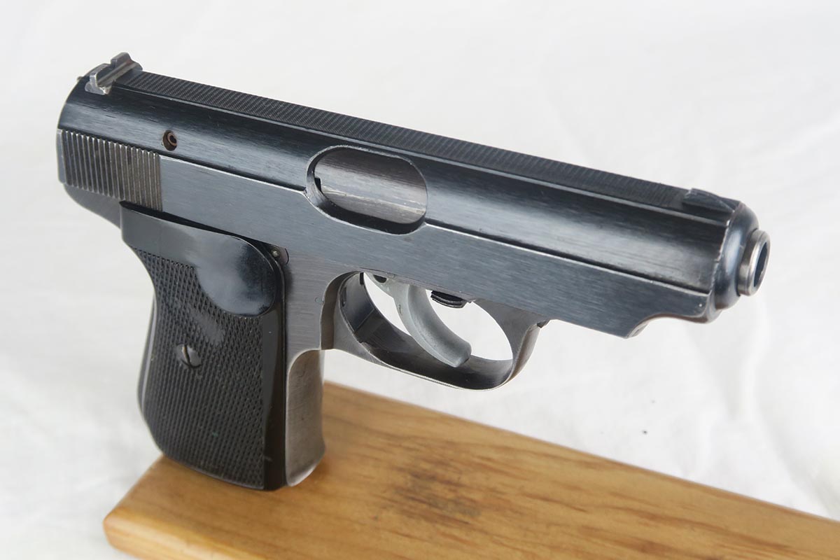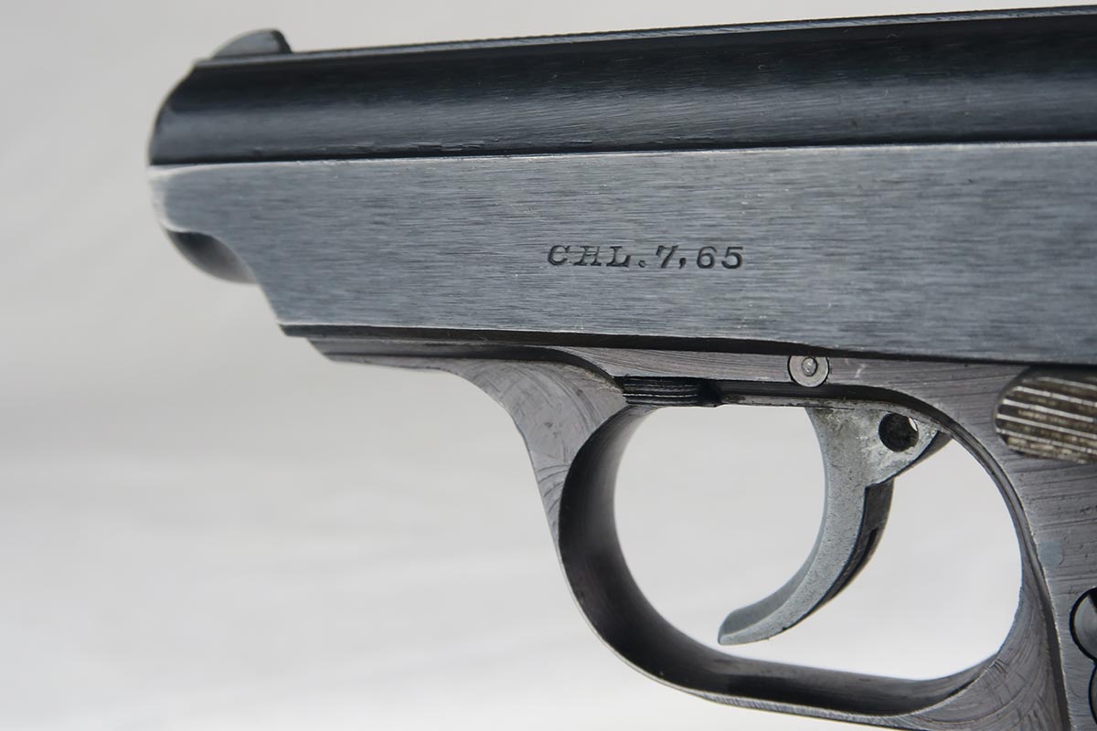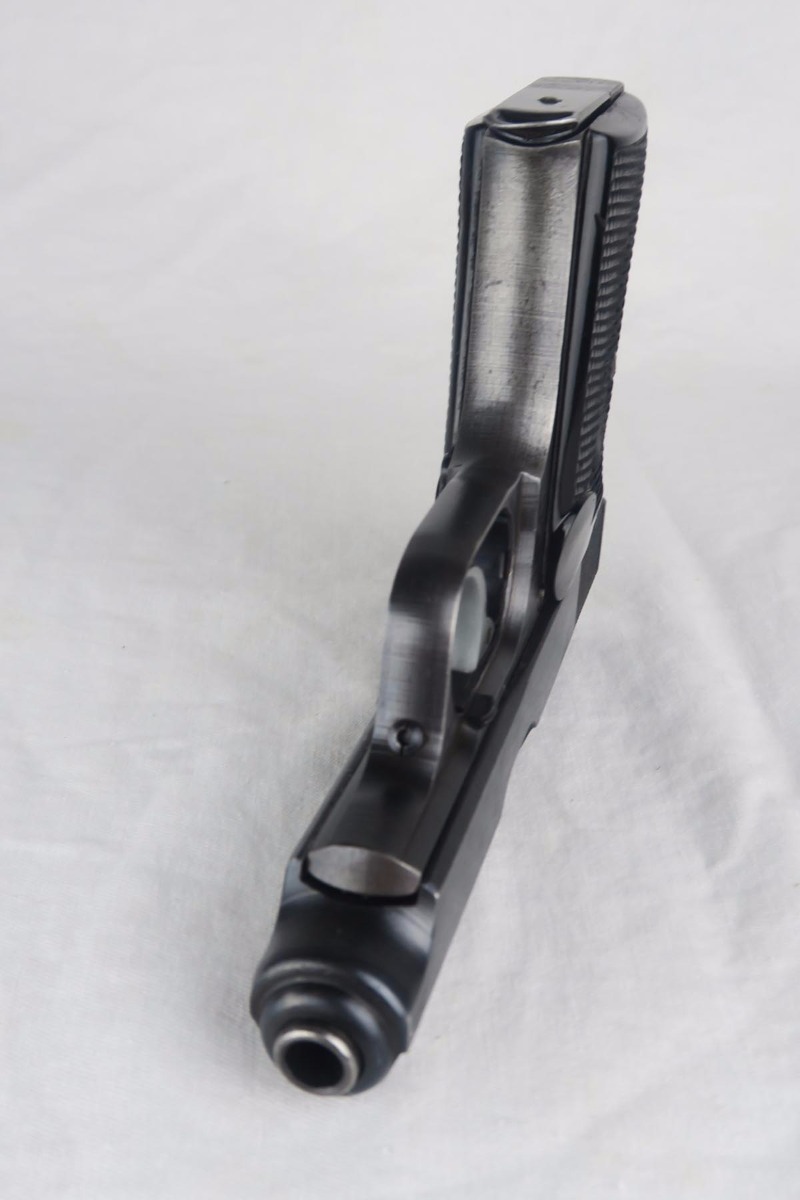 12/1/17 – Just like the Walther PP’s and P38’s, there were some end of war Sauer’s put together in the factory by the GI’s.  I believe this is one of those guns as it has NO firing proofs or any markings at all with the exception of serial numbers.   The 510xxx serial number dates it to 1945 and the top half is not matching to the bottom.   The barrel and slide match each other but the frame is not matching.   Since there are no firing proofs I would assume it never left the factory before the factory was captured.  It has a correct “half moon” late war magazine and the grips are original as well.  Right grip has a hairline crack in it and also an unusual wear spot.  Excellent bore and every thing seems to function well on the gun, including the decocker.  No safety on this late variation.  Original finish is also very nice, with thin straps.