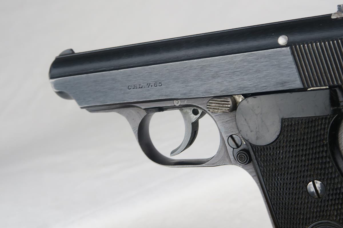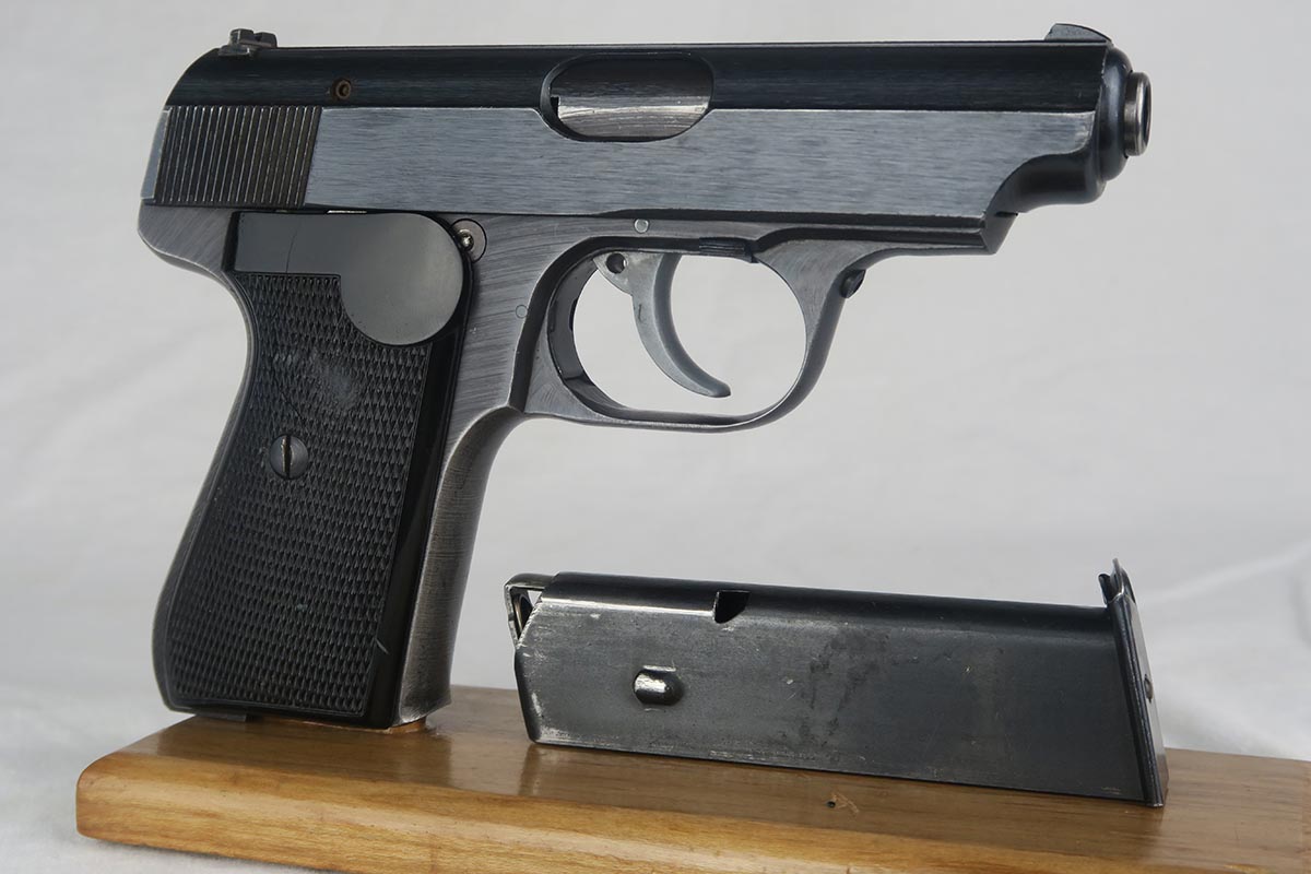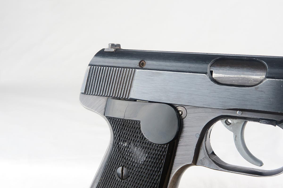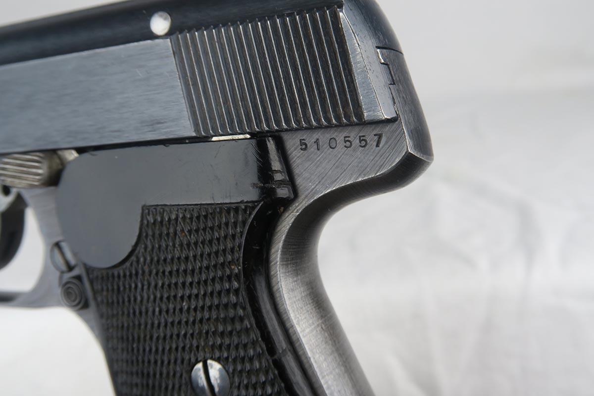 12/1/17 – Just like the Walther PP’s and P38’s, there were some end of war Sauer’s put together in the factory by the GI’s.  I believe this is one of those guns as it has NO firing proofs or any markings at all with the exception of serial numbers.   The 510xxx serial number dates it to 1945 and the top half is not matching to the bottom.   The barrel and slide match each other but the frame is not matching.   Since there are no firing proofs I would assume it never left the factory before the factory was captured.  It has a correct “half moon” late war magazine and the grips are original as well.  Right grip has a hairline crack in it and also an unusual wear spot.  Excellent bore and every thing seems to function well on the gun, including the decocker.  No safety on this late variation.  Original finish is also very nice, with thin straps.