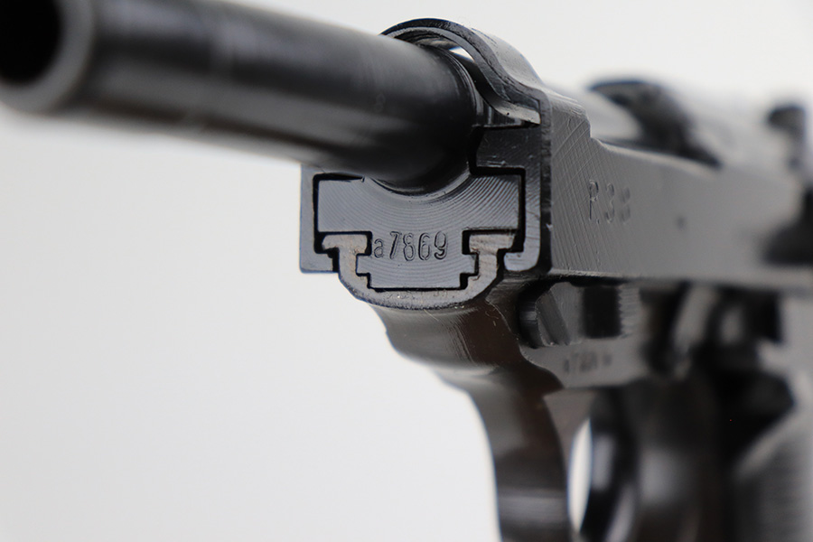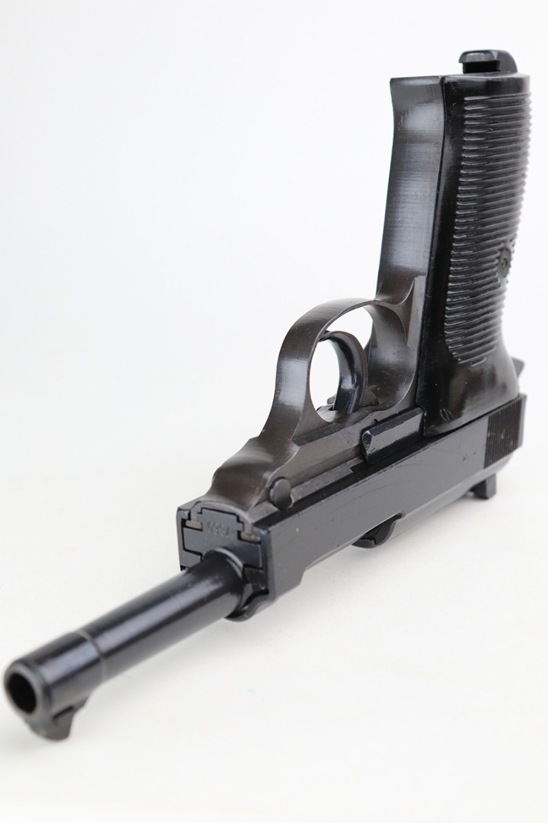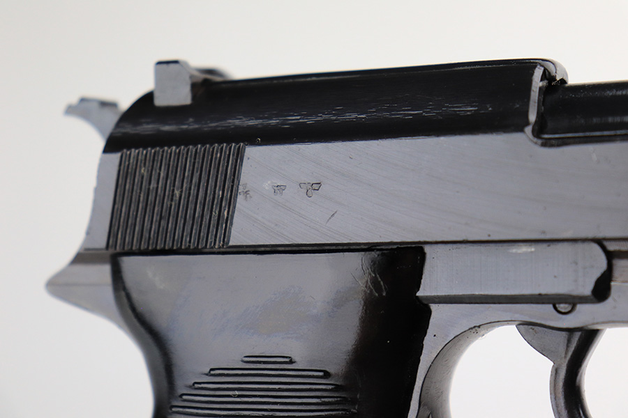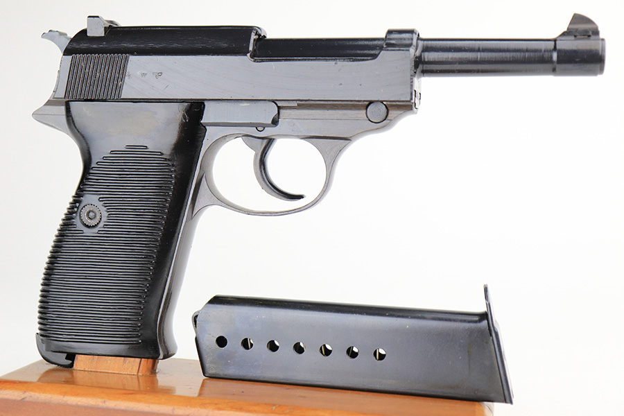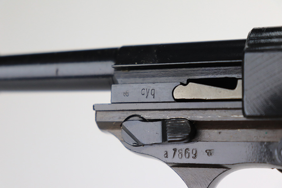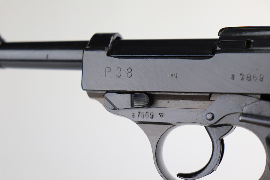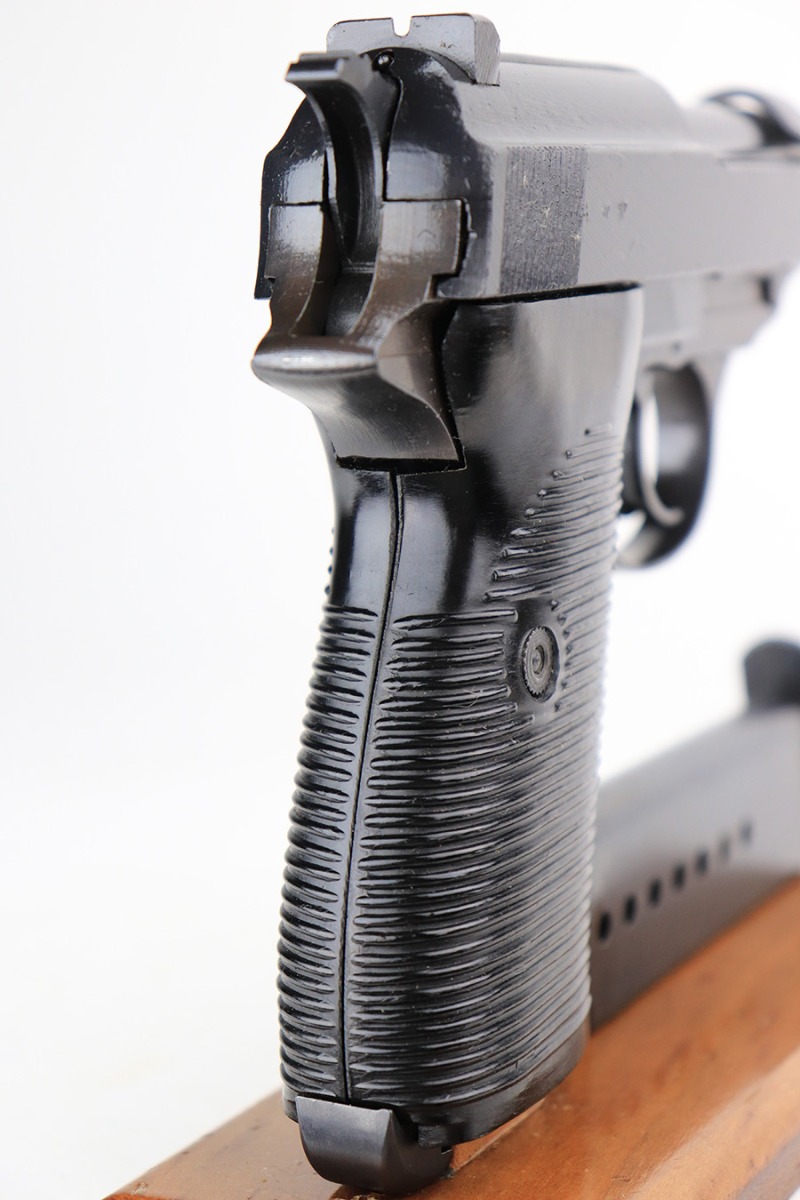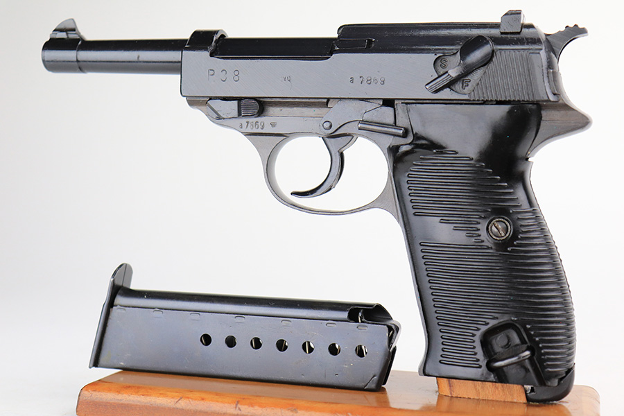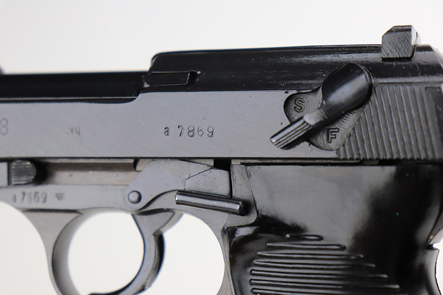 6/1/22 – This is an excellent example of an end-of-war “a” prefix Spreewerk P.38 issued to the Nazi military at the end of WW2, in March of 1945. It is all matching and has the proper “Eagle 88” military acceptance proofs throughout. It also has the proper late-war cog hammer. The finish is dark on this gun, so we believe it has been “dipped”. In any case, there is virtually no actual finish loss. There are just a few tiny handling marks on the right side of the slide. Comes with very nice black plastic grips and a period-correct “Eagle 88” marked Spreewerk magazine. Stone-mint bore. De-cocker is functional.