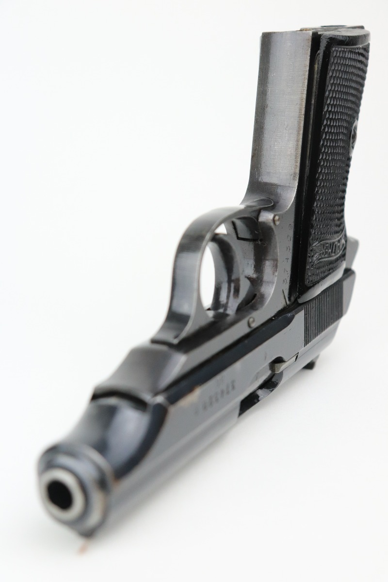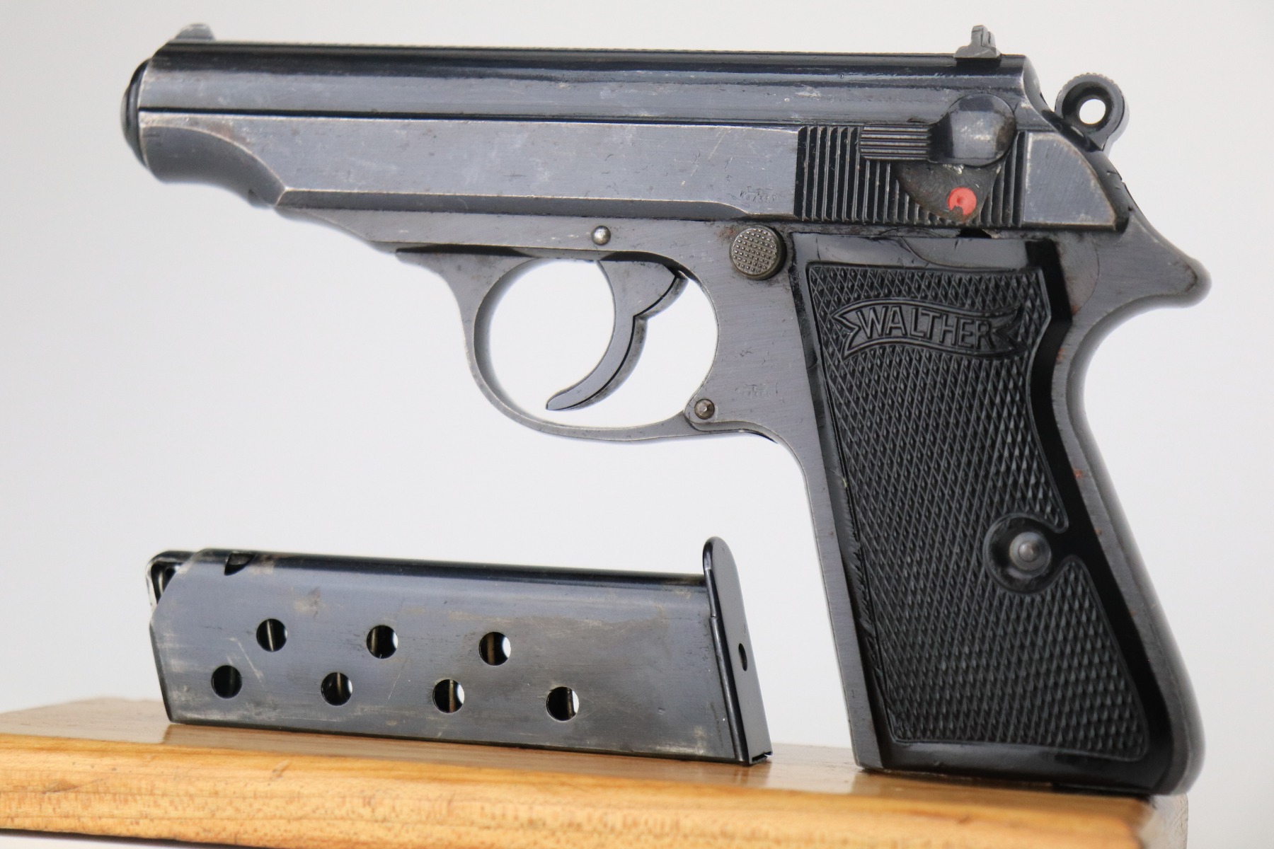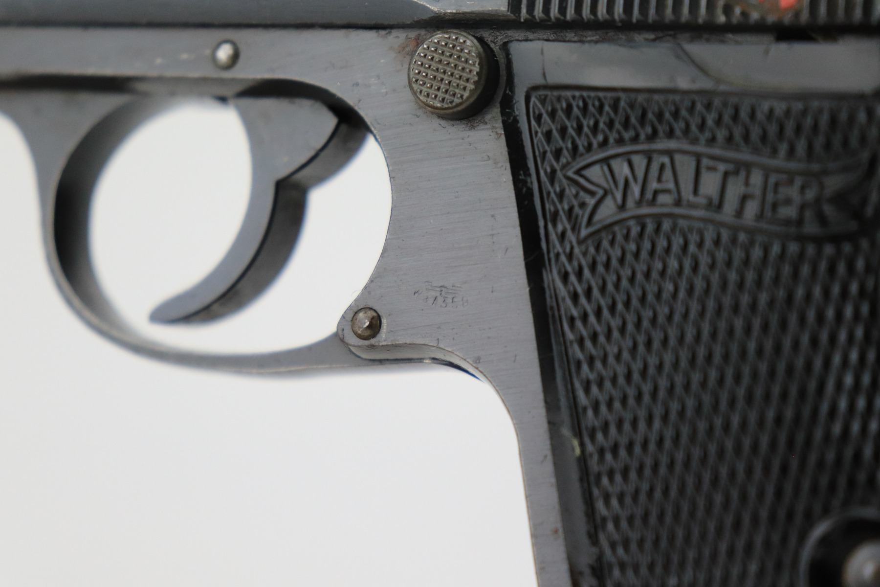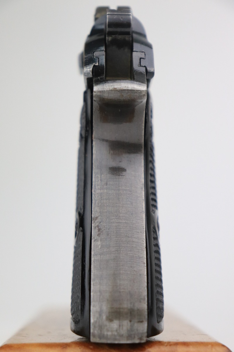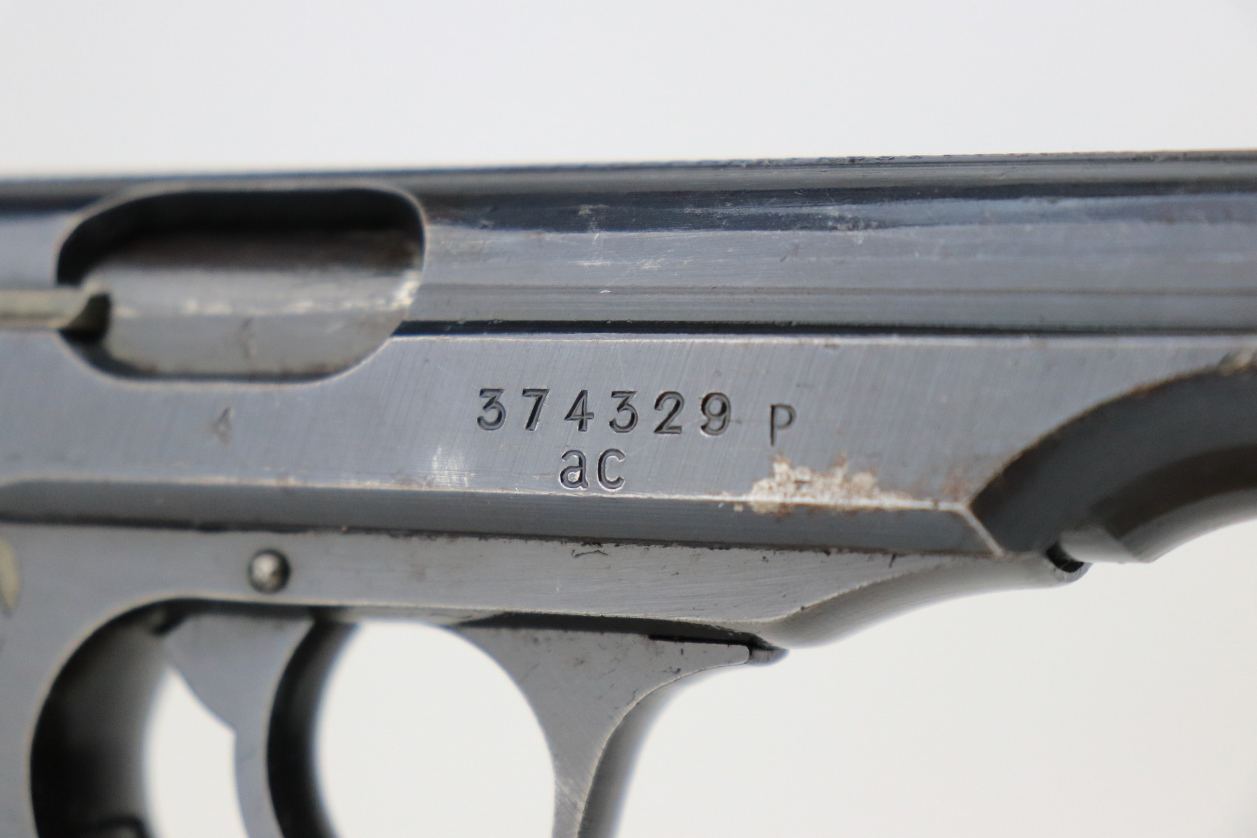 4/6/21 – This is a very nice example of a Walther PP issued to the Nazi military at the end of the war, in 1945. The gun has no slide legend and an “ac” Walther factory code on the slide. It is matching and has the proper “Waffen 359” military proofs. It has retained about 90% of its original finish. There is thinning on the straps, wear around the muzzle and high edges of the slide. Small handling marks down the length of the side. One area of discoloration on the right side of the slide. Tiny dots of oxidation here and there. It comes with nice grips and a banner-only magazine. There is cracking on the left grip panel. Bore is near-mint.