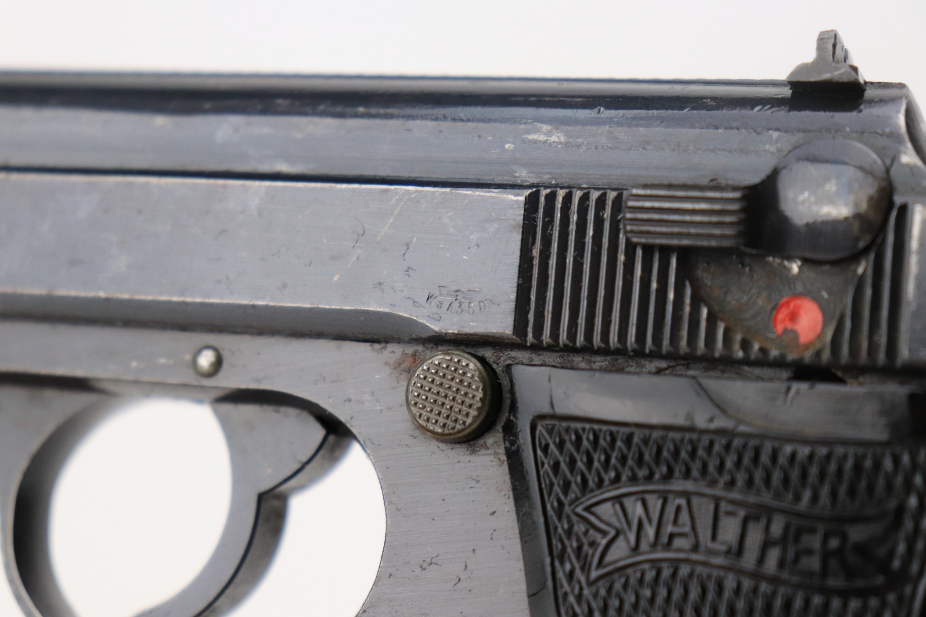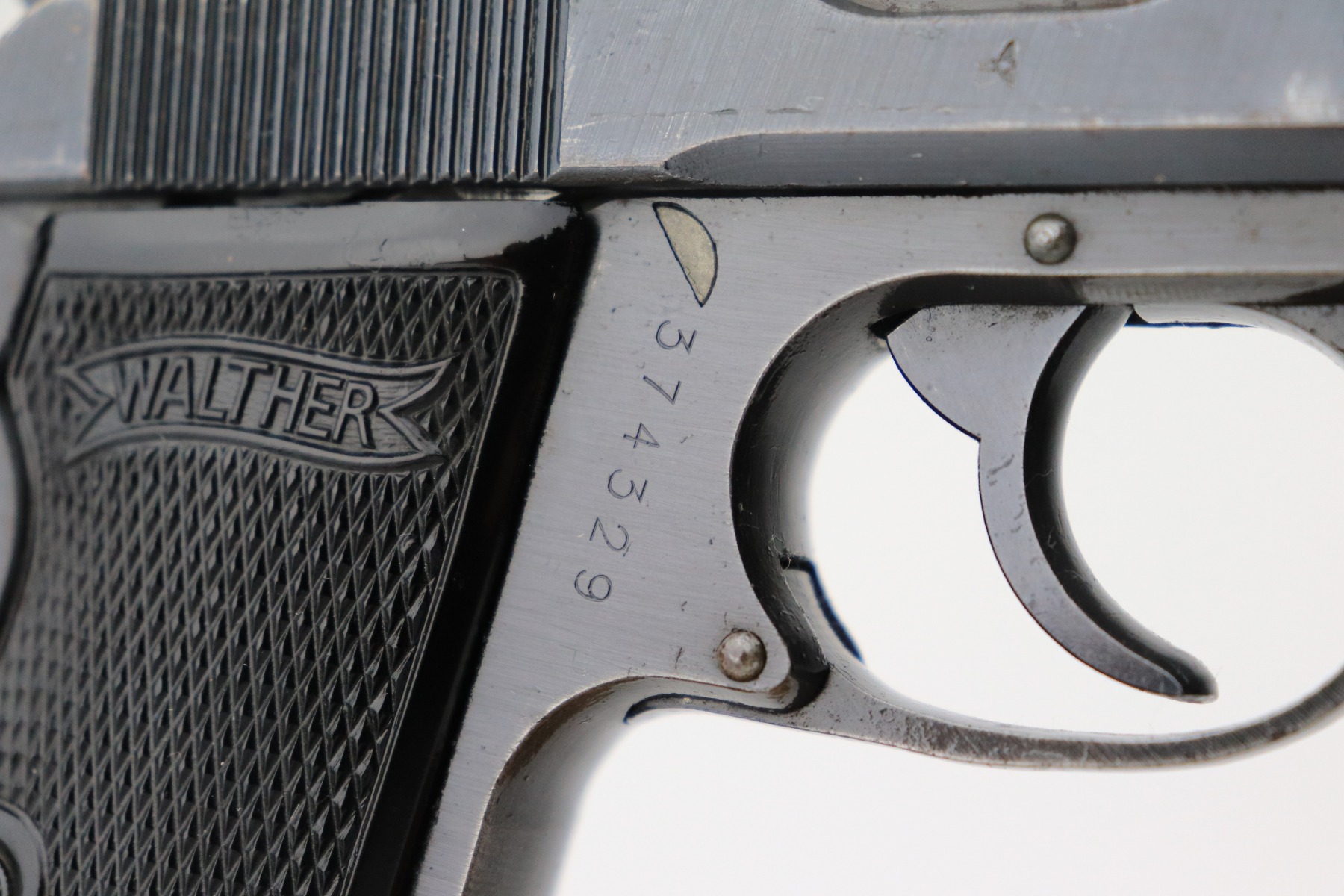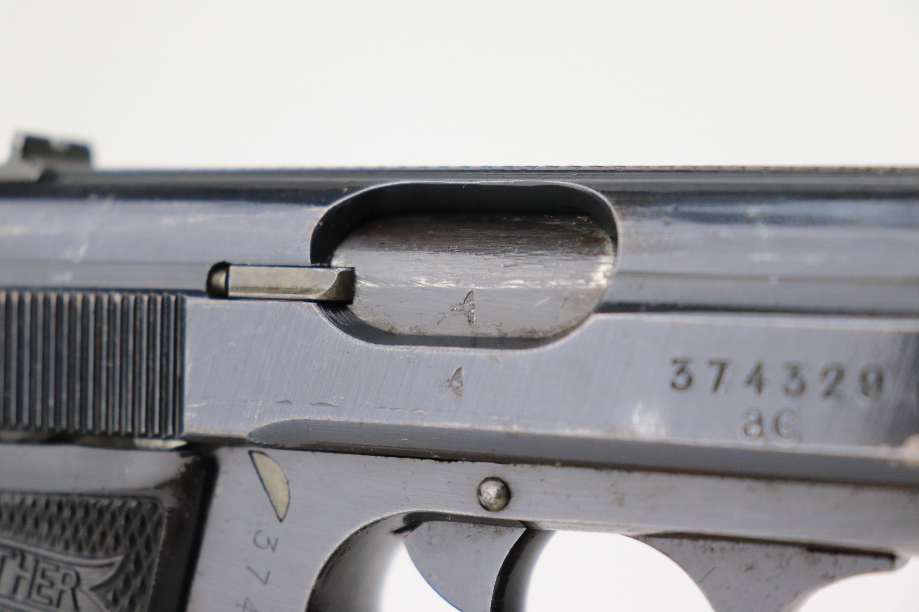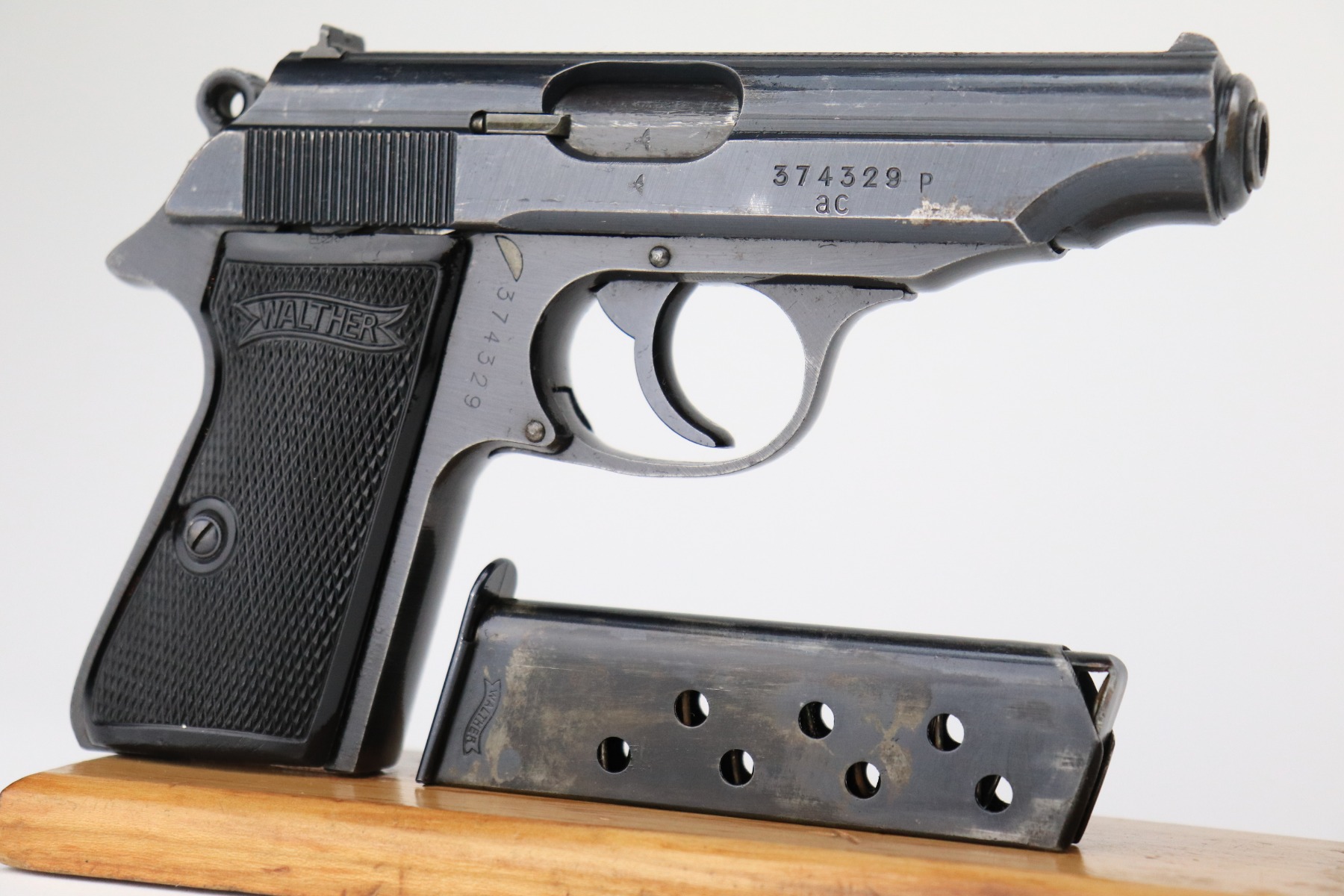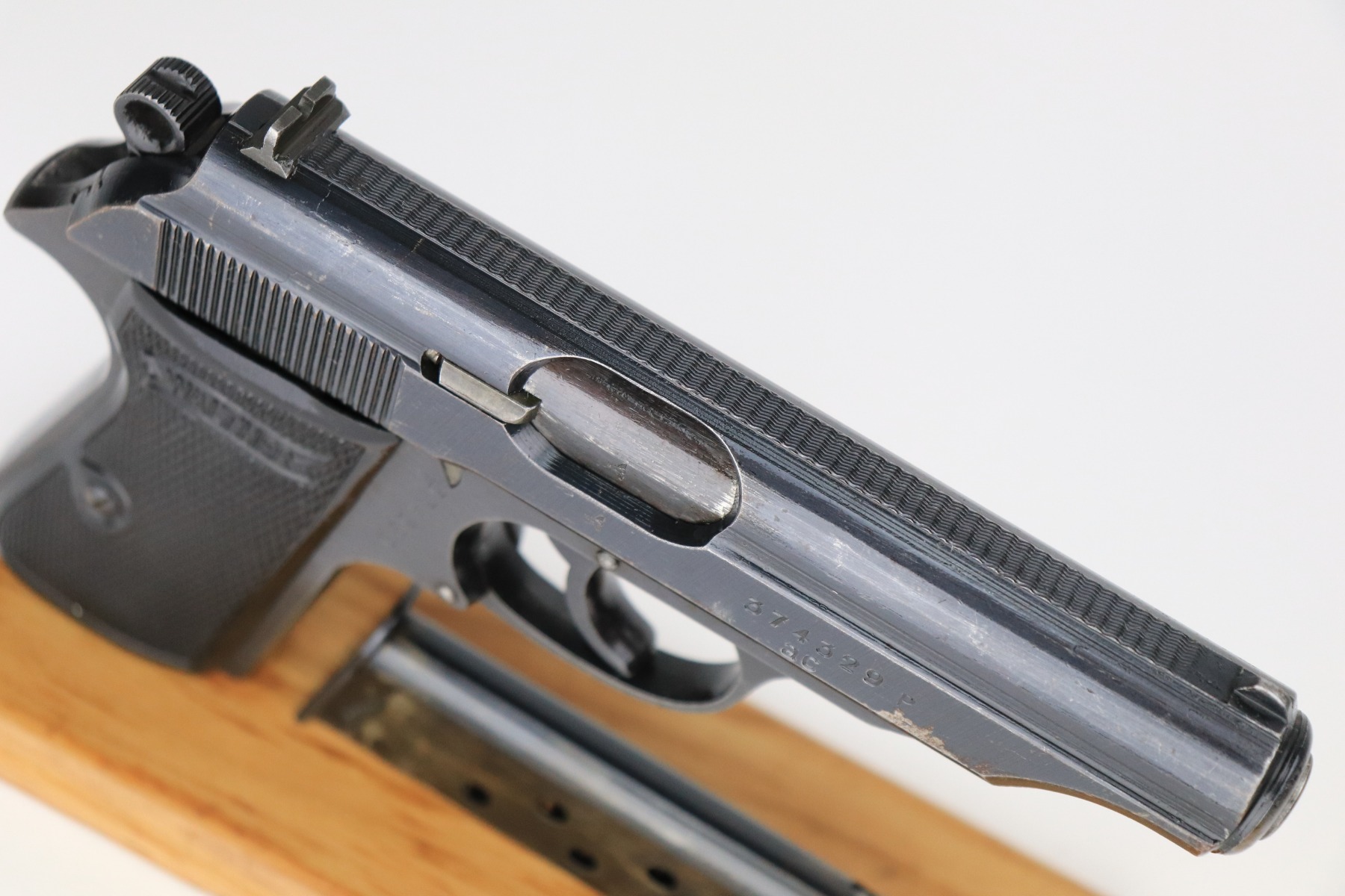 4/6/21 – This is a very nice example of a Walther PP issued to the Nazi military at the end of the war, in 1945. The gun has no slide legend and an “ac” Walther factory code on the slide. It is matching and has the proper “Waffen 359” military proofs. It has retained about 90% of its original finish. There is thinning on the straps, wear around the muzzle and high edges of the slide. Small handling marks down the length of the side. One area of discoloration on the right side of the slide. Tiny dots of oxidation here and there. It comes with nice grips and a banner-only magazine. There is cracking on the left grip panel. Bore is near-mint.