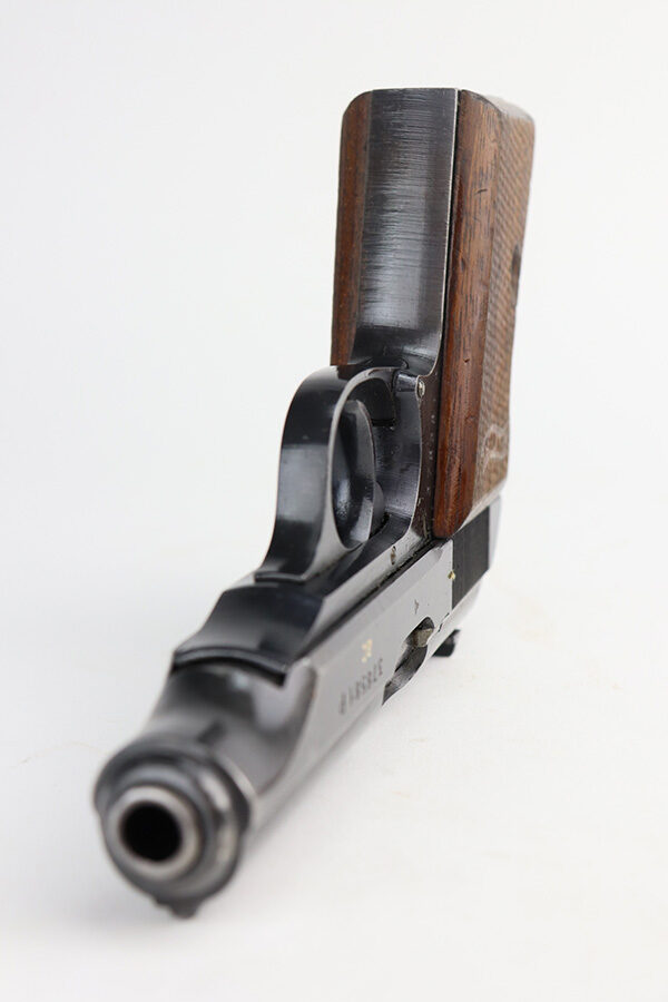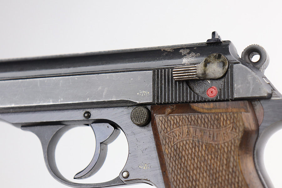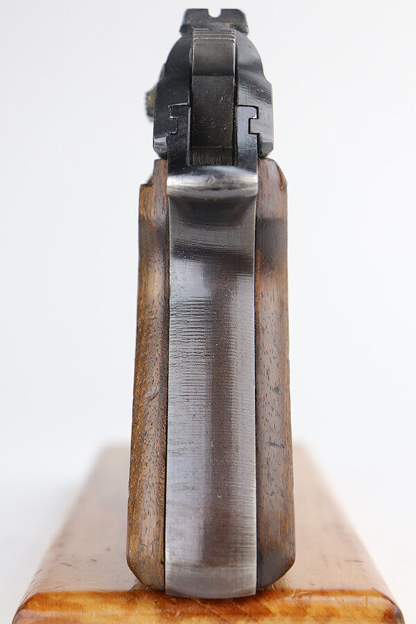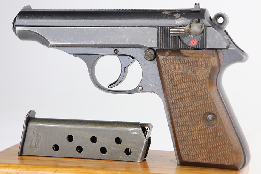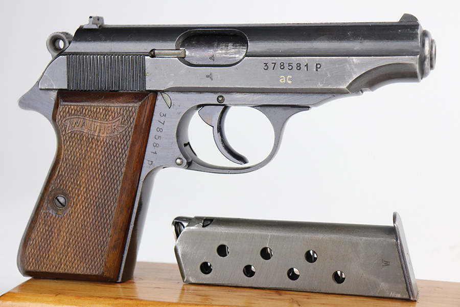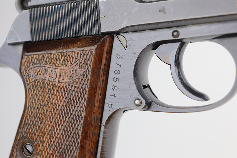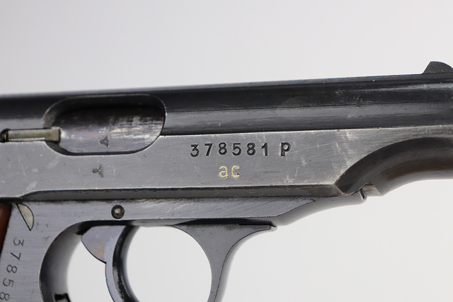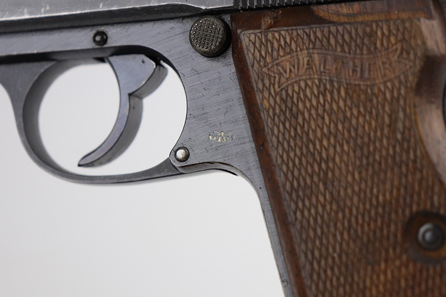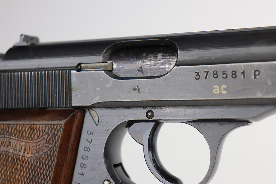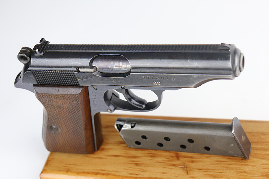 6/8/21 – This is an excellent example of an End-of-War Walther PP issued to the Nazi military in 1945. It is all matching, has no slide legend, an “ac” Walther factory code on the right side of the slide, and has the proper “Waffen 359” military proofs. It also comes with end-of-war wooden grips. The gun has retained about 95% of its original finish. There is minor scratchy wear on the high edges of the slide and around the muzzle. Some small dots of wear on the right side of the slide. Very minor patina on the straps. An area of splotchy discoloration at the back of the left side of the slide. Comes with a rare late-war “W” marked magazine. Mint bore.
