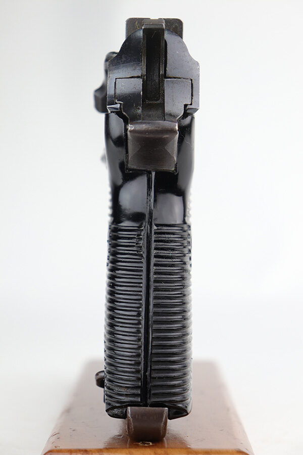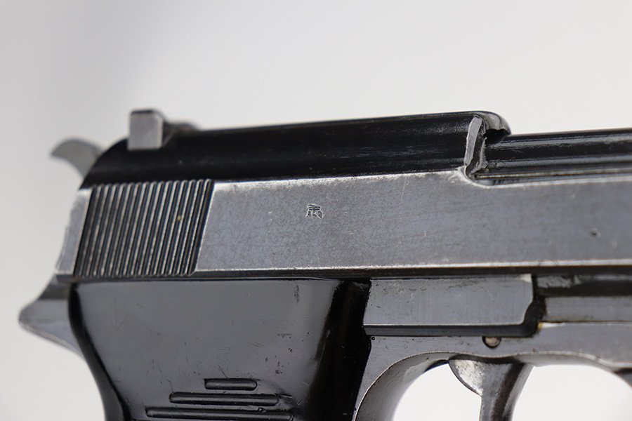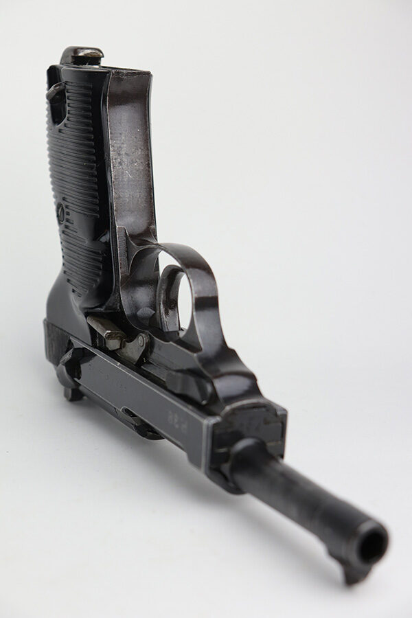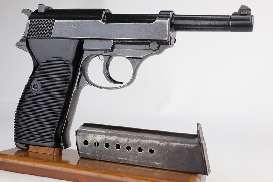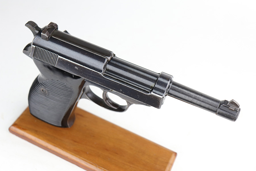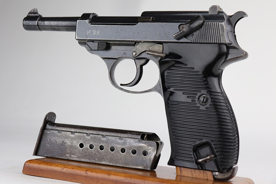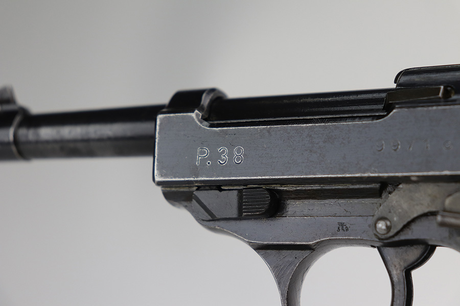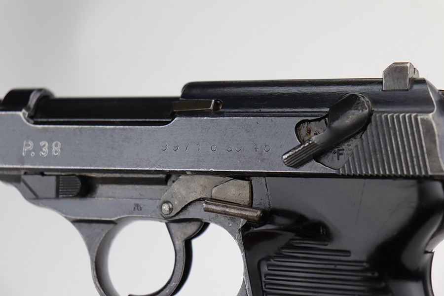 .10/4/21 – This is a nice example of a Walther P.38 put together at the end of the war in 1945. The gun is mismatched, and the frame has no serial number. The right side of the slide has only one “Eagle 359” military proof, indicating the gun was never actually issued. Some of the small parts have a phosphate finish – typical for these end-of-war guns. It has retained somewhere between 85-90% of its finish. There is thinning on the front strap and on the barrel and minor wear around the muzzle and around the high edges of the slide. Minor pitting on the underside of the barrel. Thee is spotty oxidation throughout, most noticeable on the barrel, underside of the frame, and on the front strap. Comes with nice grips (a couple of light scratches on the left side) and a period-correct magazine. Excellent bore with strong rifling. The de-cocker does not function properly and the slide does not lock back on its own.