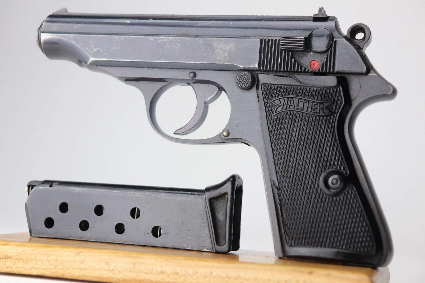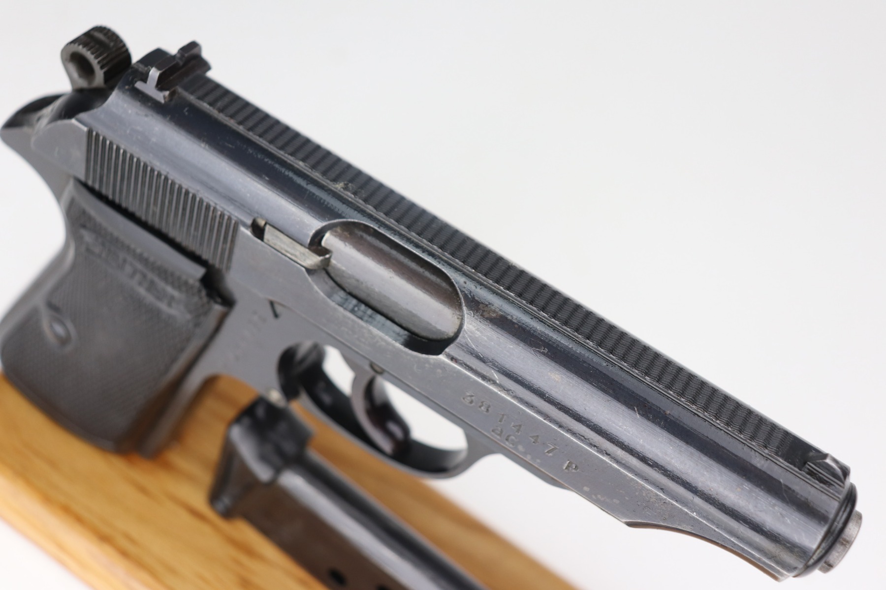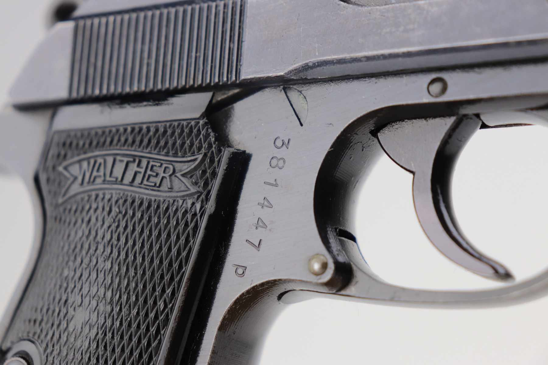 2/15/21 – This is an end-of -war Walther PP, made in 1945. The gun is all matching and has the “ac” code under the serial number on the slide but has no proof marks. That means this gun was never finished. No slide legend. There isn’t much actual finish loss but there is splotchy discoloration on both sides of the slide. Minor wear on the high edges of the slide. It has retained about 95% of its original finish. It comes with period correct grips – there is a chip in the right grip and a crack in the left panel. It comes with a black finger extension magazine. Minty bore.
