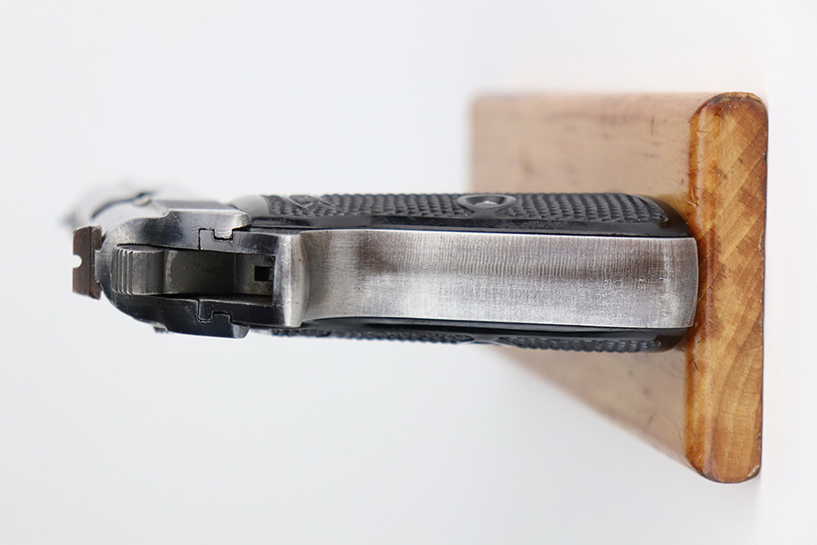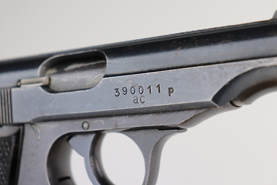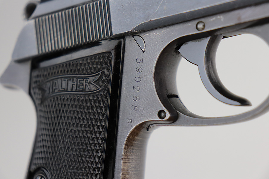 5/6/21 – This is a nice example of an end-of-war Walther PP manufactured in 1945. It is a 5th variation gun, characterized by no slide legend, an “ac” Walther factory code on the right side of the slide, and no proof marks. The gun is mismatched, never issued, and was put together by a GI after the liberation of the factory. The gun has retained about 90% of its original finish. It has pretty nice profile views as most of the wear is on the back strap. There is minor wear around the muzzle and small dings and handling marks along the slide. Comes with excellent grips and a satin-nickel plated magazine. The bore is near-mint.