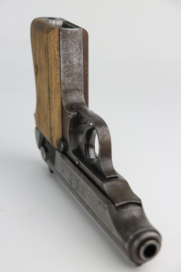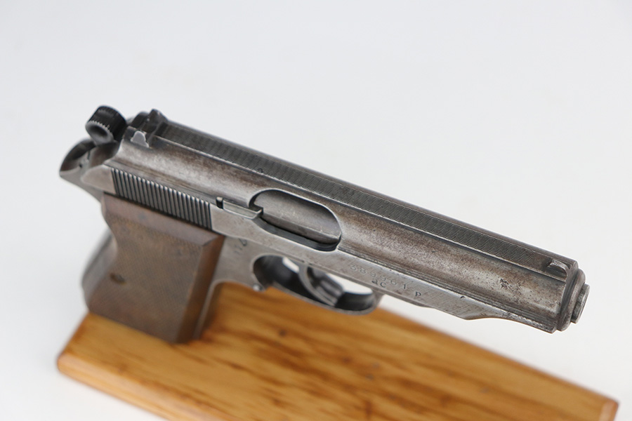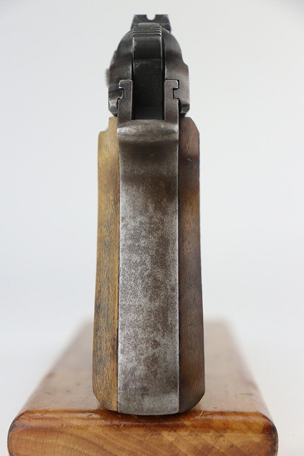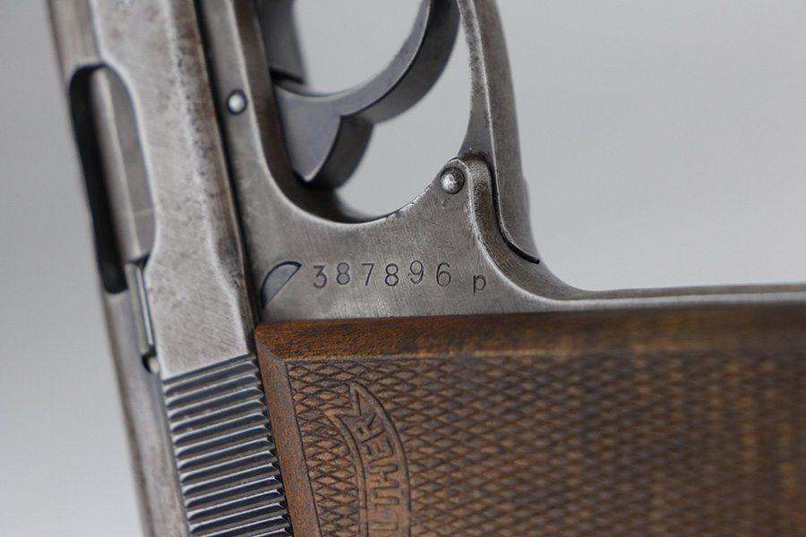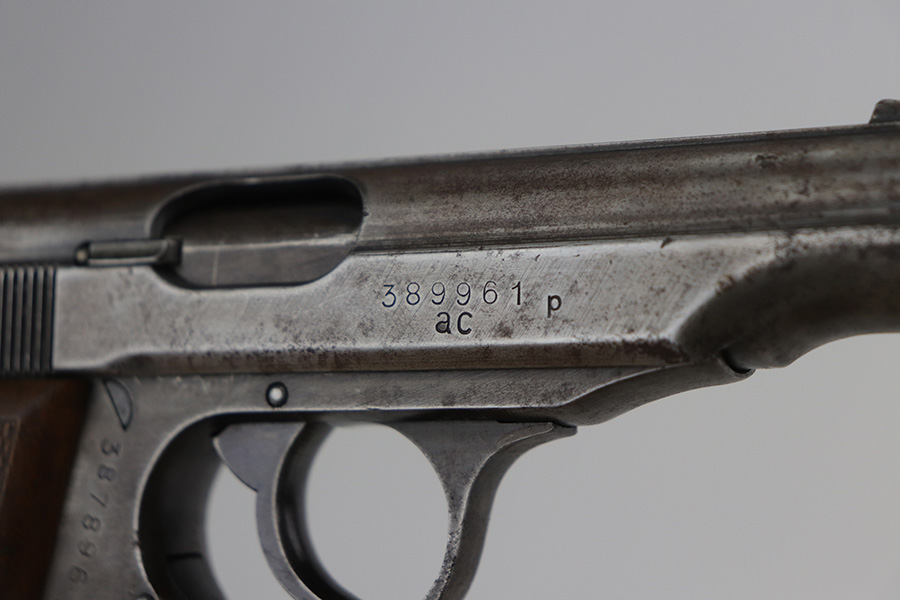 9/17/21 – This is a nice example of a Walther PP made at the very end of WW2, in 1945. It is a GI mismatch. The slide and frame are not matching and were put together by an American GI at the end of the war. There are no proof marks, meaning the gun never made it out of the factory. The left grip panel is a replacement – the right grip panel is a late-war wood grip. The gun has lost virtually all of its original finish with spotty oxidation throughout and areas of minor pitting here and there. Comes with a proper wartime magazine. The bore is mint. The safety lever has been cut down but still works.