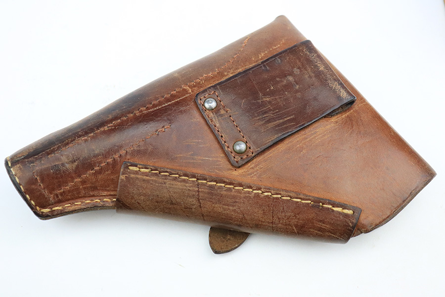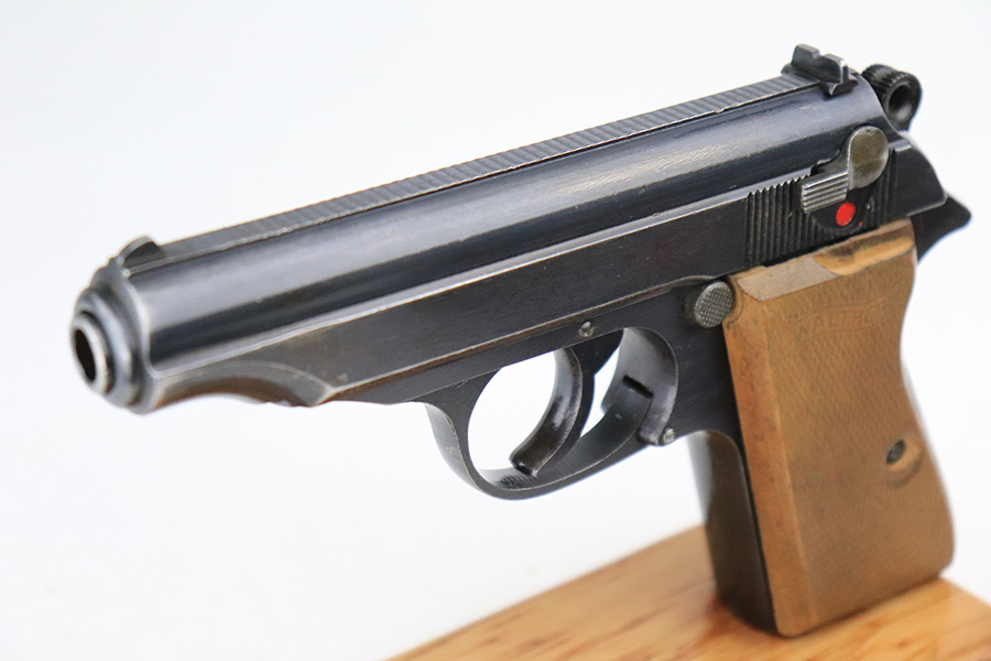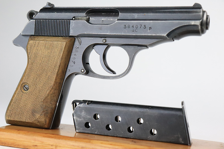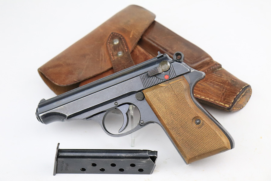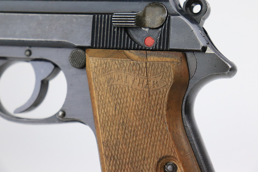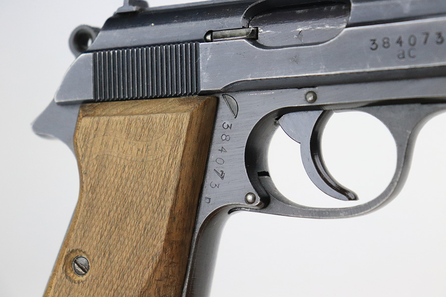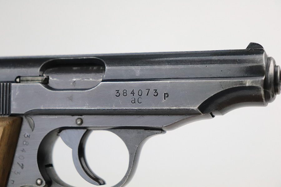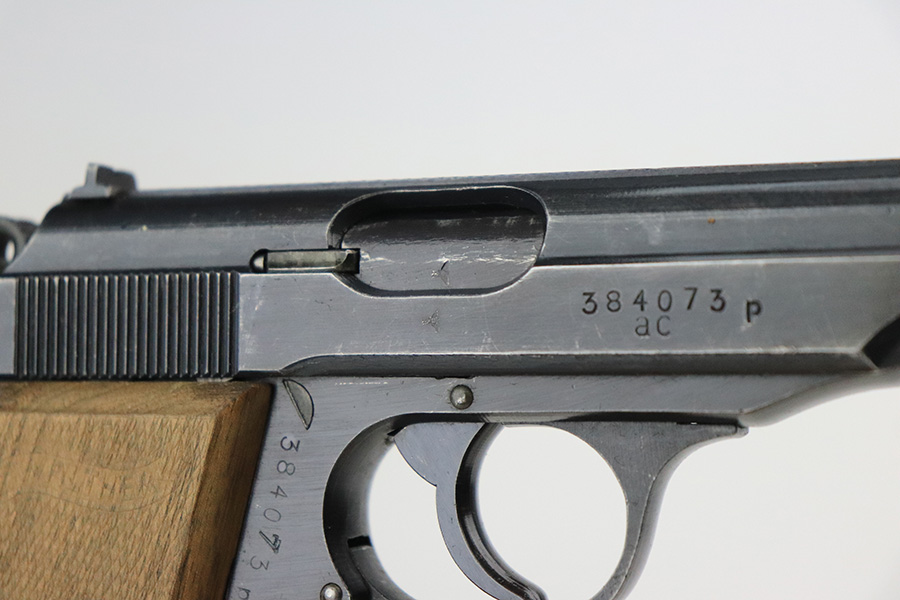 6/16/22 – This is an excellent example of a end-of-war Walther PP manufactured in 1945. It is all matching and has the proper characteristics for this variation: no slide legend and an “ac” Walther factory code on the right side of the slide. It comes as a rig with a wartime magazine and a nice post-war holster. The gun itself has retained about 95% of its original late-war finish. Generally, there is minor muzzle wear, minor wear concentrated around the high edges of the slide, and a streak of wear on the left side of the slide. Comes with end-of-war wood grips – there is a hairline crack on the left side and a noticeable gouge on the right side. Excellent, shiny bore with strong rifling.