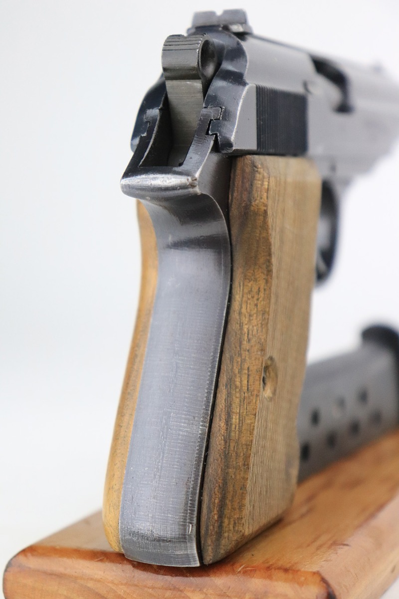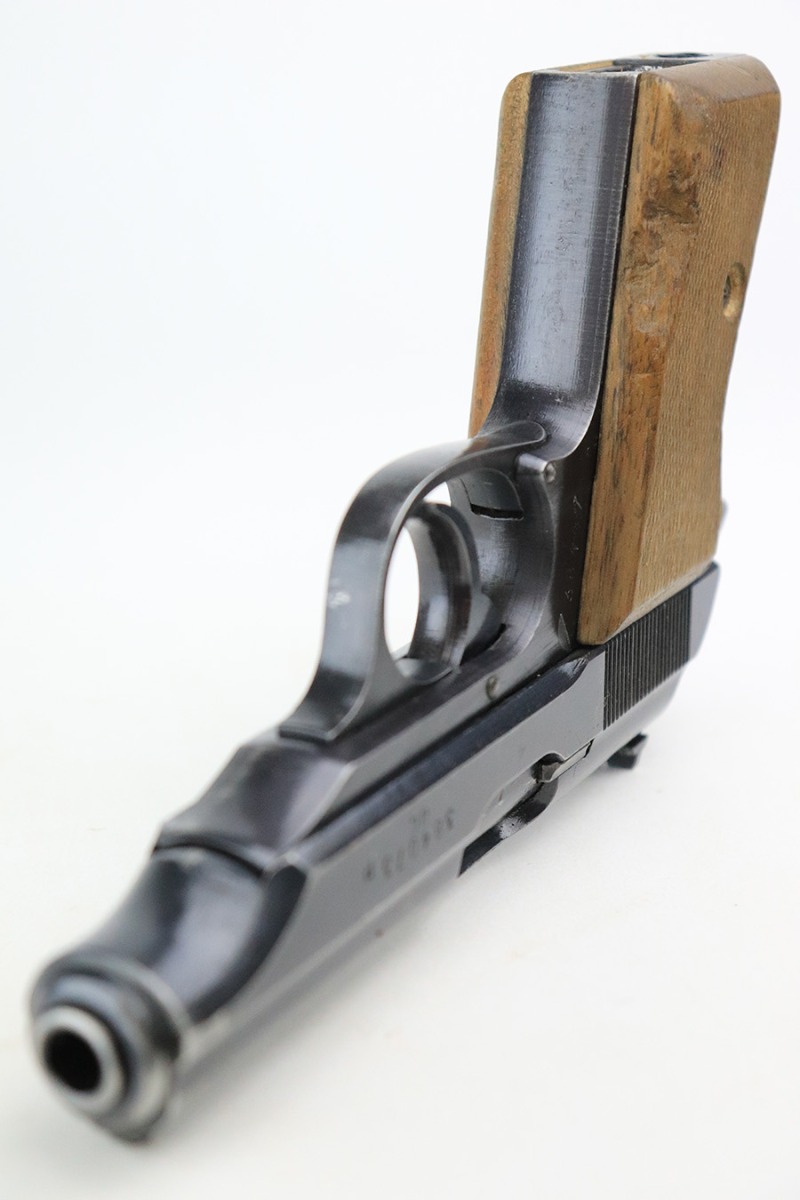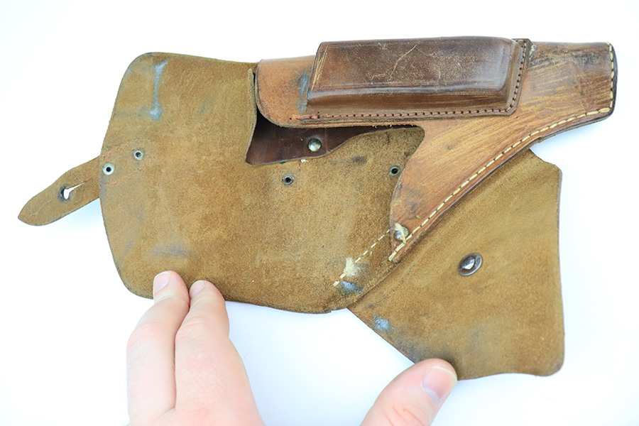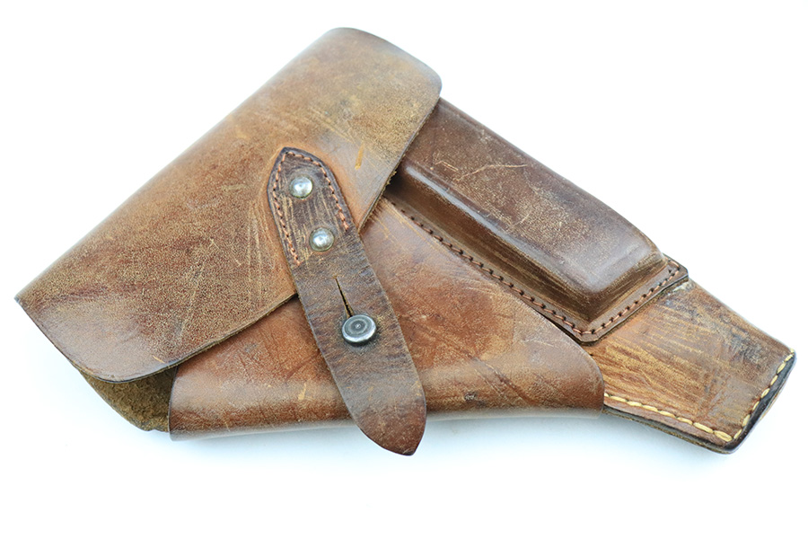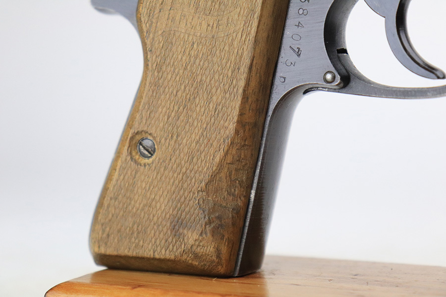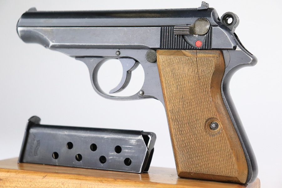 6/16/22 – This is an excellent example of a end-of-war Walther PP manufactured in 1945. It is all matching and has the proper characteristics for this variation: no slide legend and an “ac” Walther factory code on the right side of the slide. It comes as a rig with a wartime magazine and a nice post-war holster. The gun itself has retained about 95% of its original late-war finish. Generally, there is minor muzzle wear, minor wear concentrated around the high edges of the slide, and a streak of wear on the left side of the slide. Comes with end-of-war wood grips – there is a hairline crack on the left side and a noticeable gouge on the right side. Excellent, shiny bore with strong rifling.