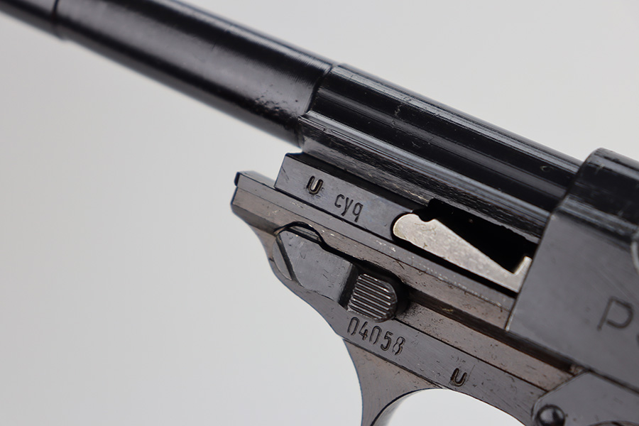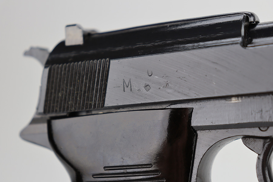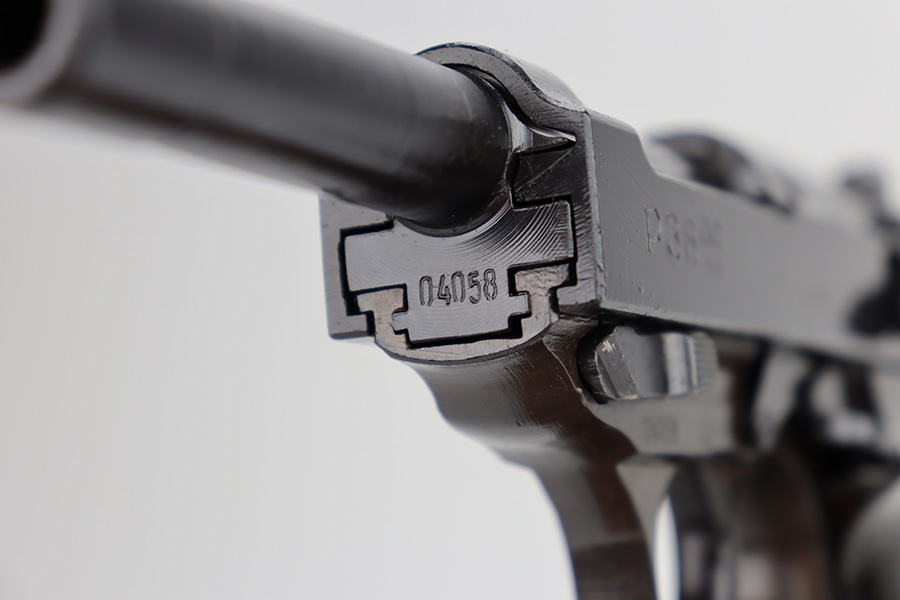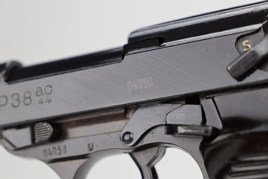 11/13/23 – This is a minty example of a rare Zero Series Spreewerk P.38 manufactured at the very end of WW2, in 1945. The gun is all matching and has the proper Zero Series proofs throughout. This particular gun is especially rare because it has a rare FN-made slide. It has retained essentially all of its finish, but it appears to have a dark “dipped” finish. Fitted with excellent blackish-brown bakelite grips. Comes with a period-correct jvd magazine. Mint bore. De-cocker is functional.