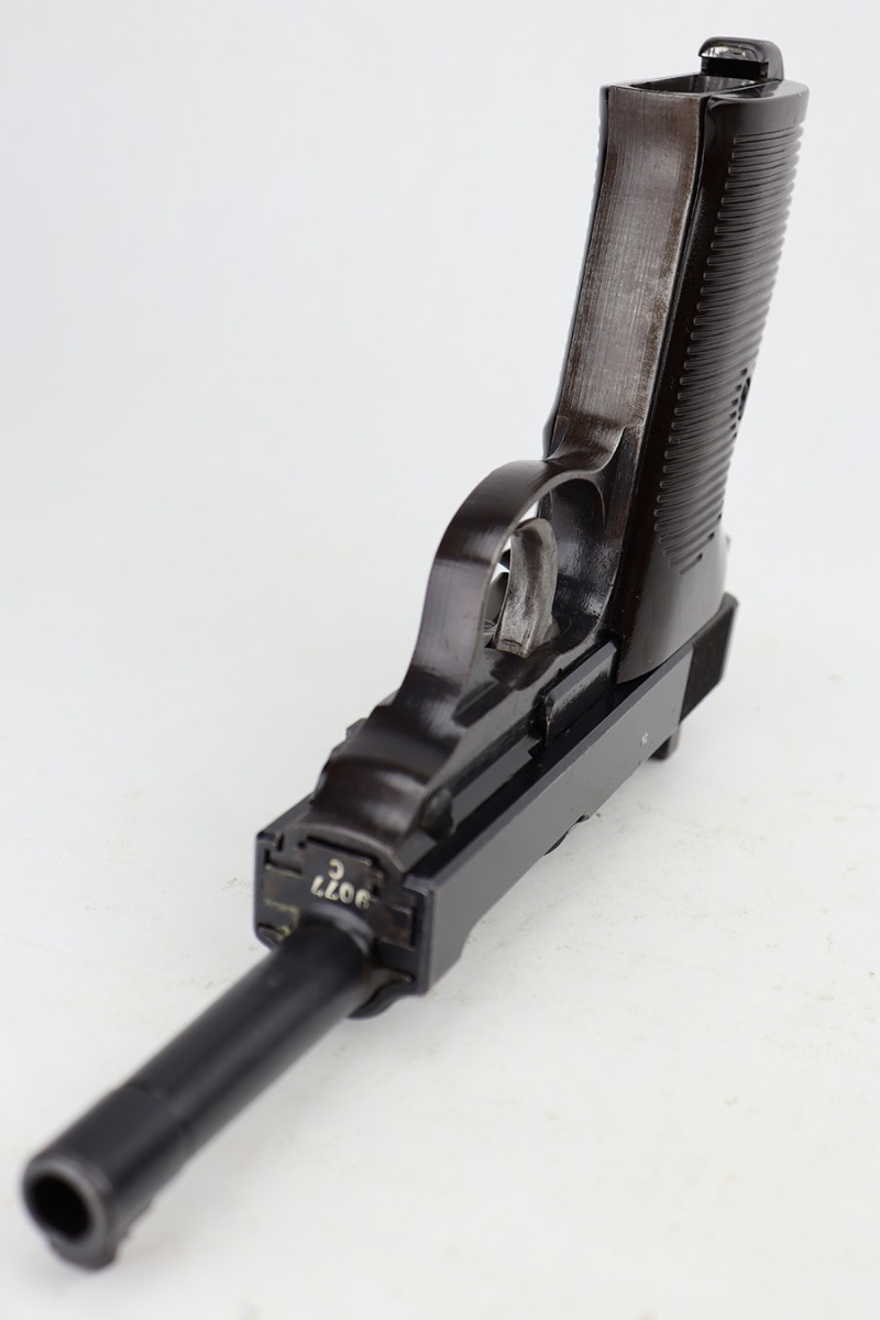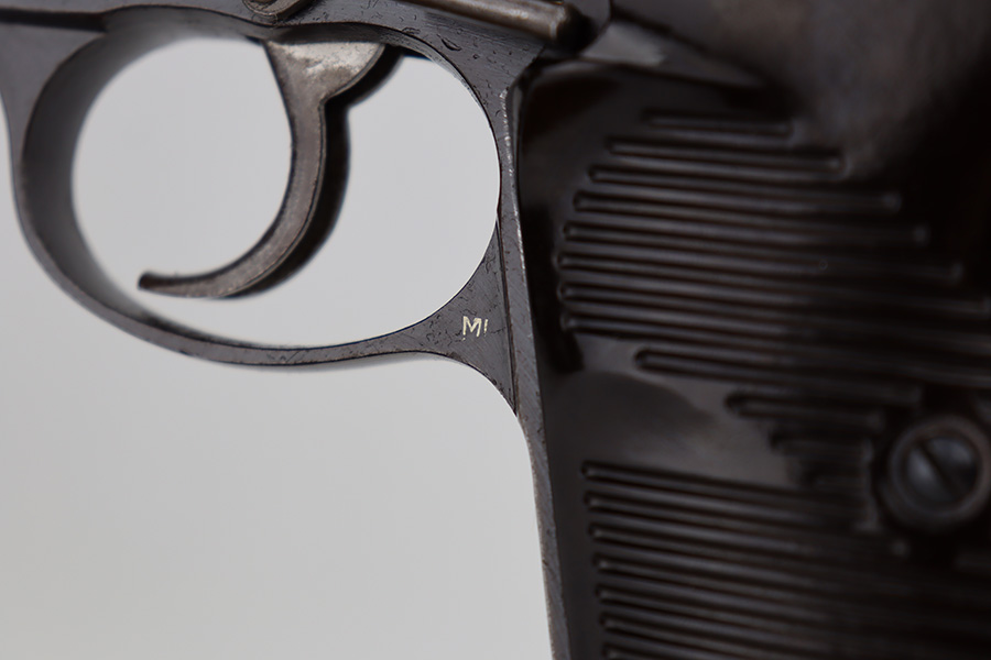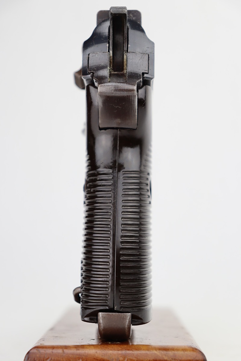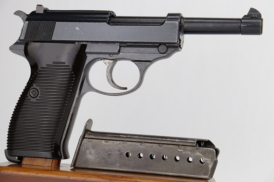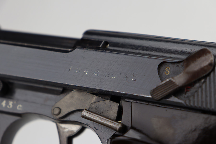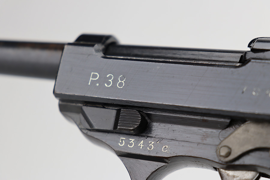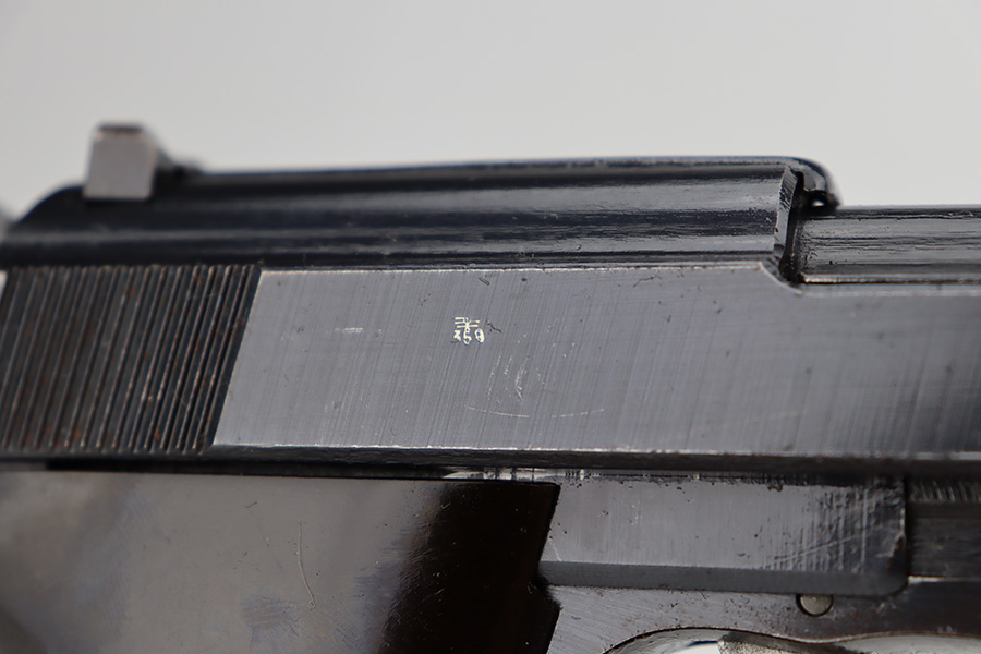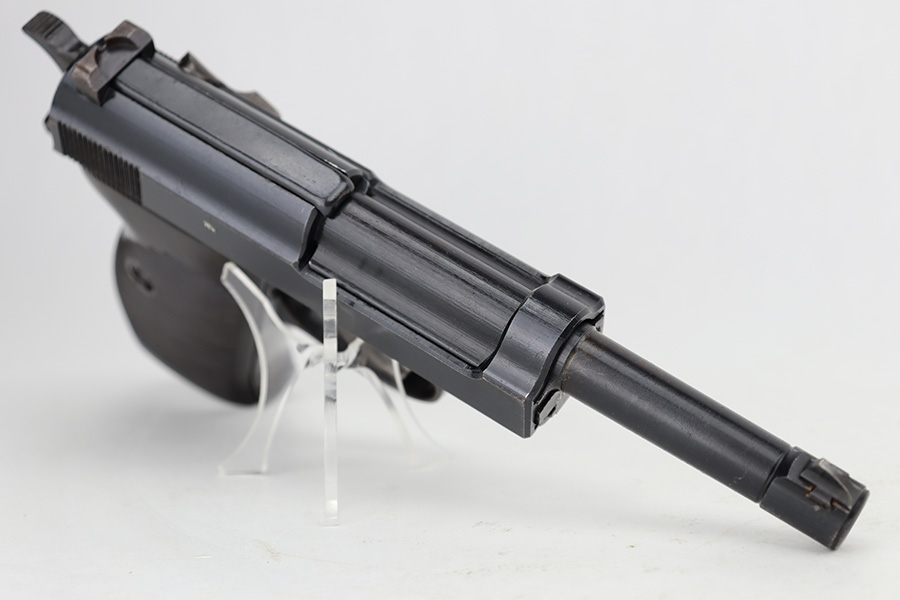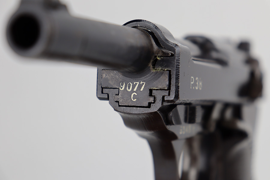 6/14/23 – This is an excellent example of an AC 45 Walther P.38 made at the very end of WW2. This is a GI mismatched gun, put together by an American GI when the Walther factory was liberated. The parts are mismatched and in the proper “c-d” serial block, correct for this variation. It also only has one “Eagle 359” military acceptance proof on the right side of the slide, indicating it was never issued. This one also has a rare “Eagle 140” marked frame, indicating it was manufactured at the FN factory. This particular gun has retained about 96% of its finish. Minor thinning and spotty brown patina on the front strap. Some spotty discoloration on the barrel. Fitted with very nice blackish-brown bakelite grips and comes with a rare “U” marked magazine. The bore is mint. De-cocker functions properly. The barrel sticks out a little bit from the front of the slide.