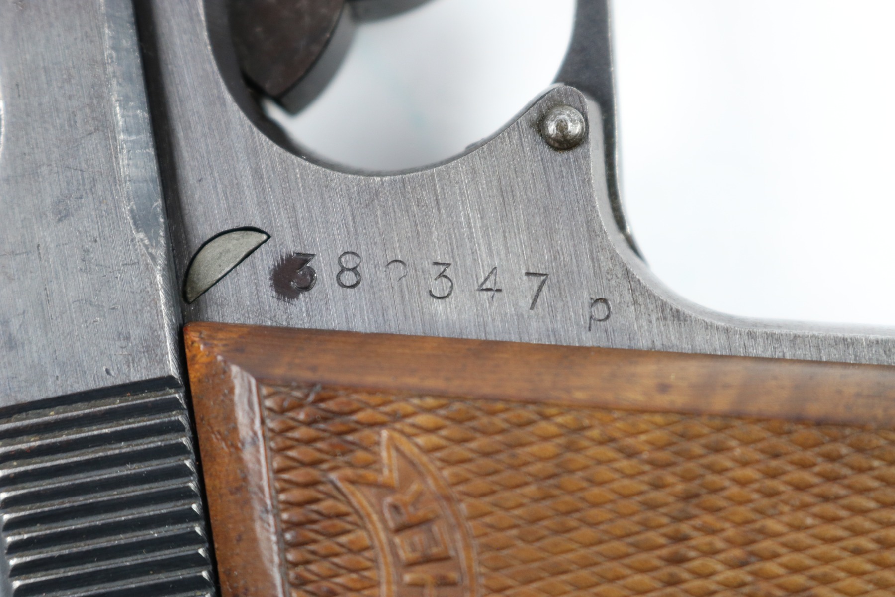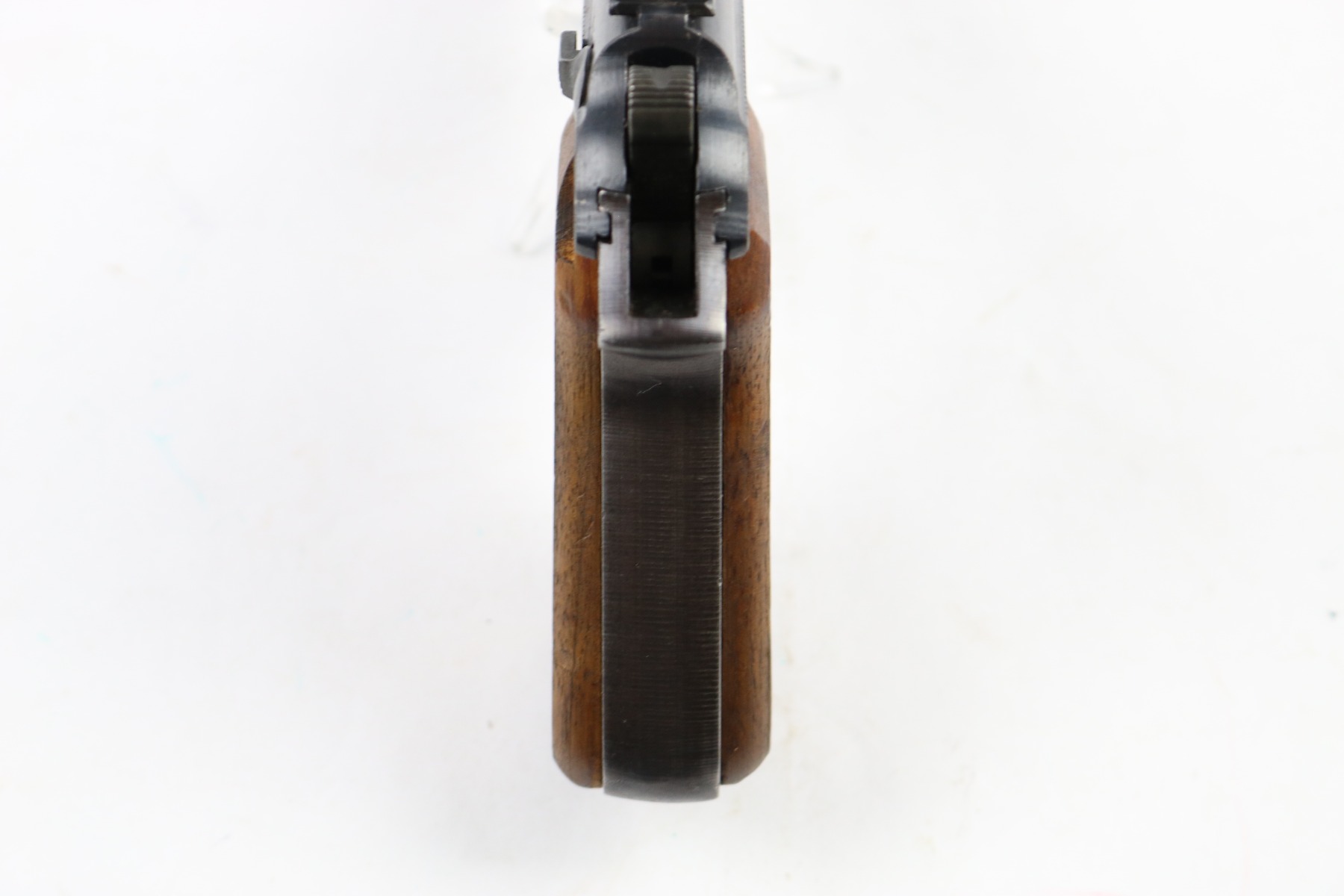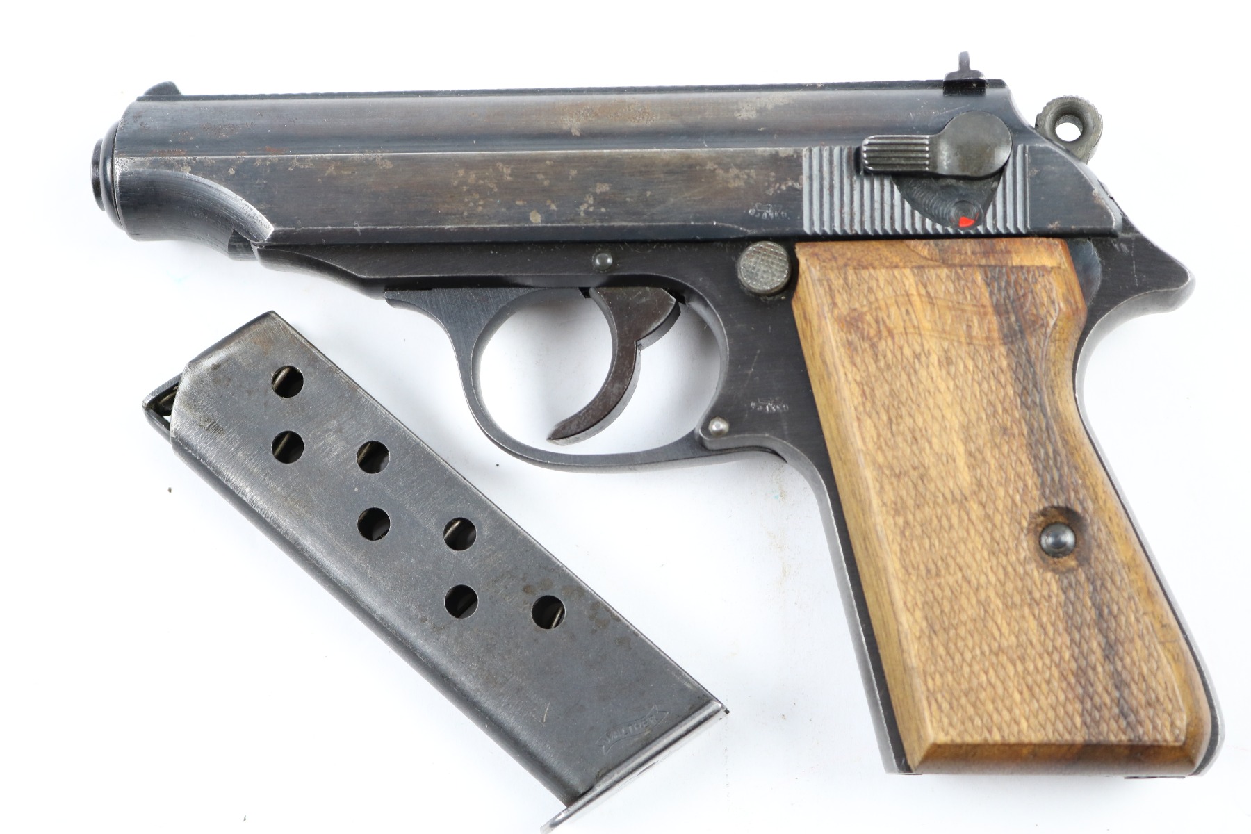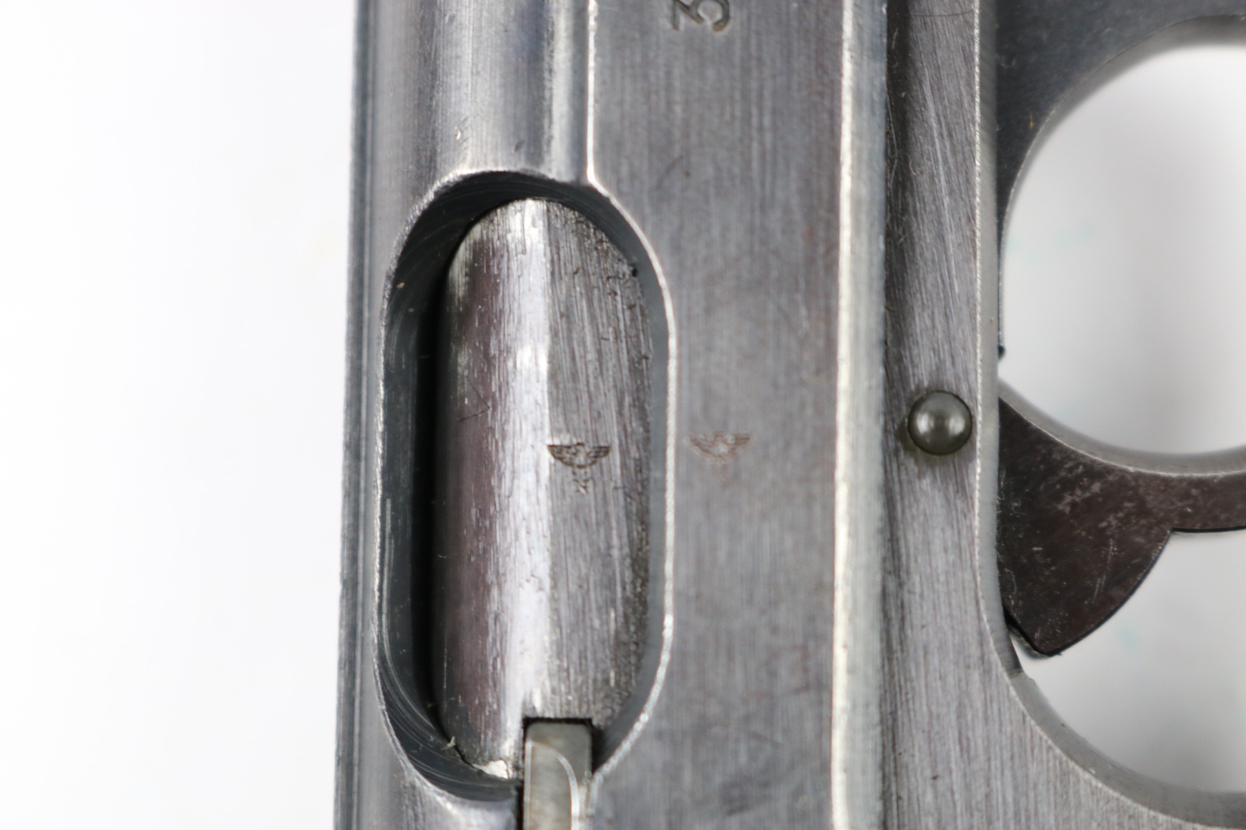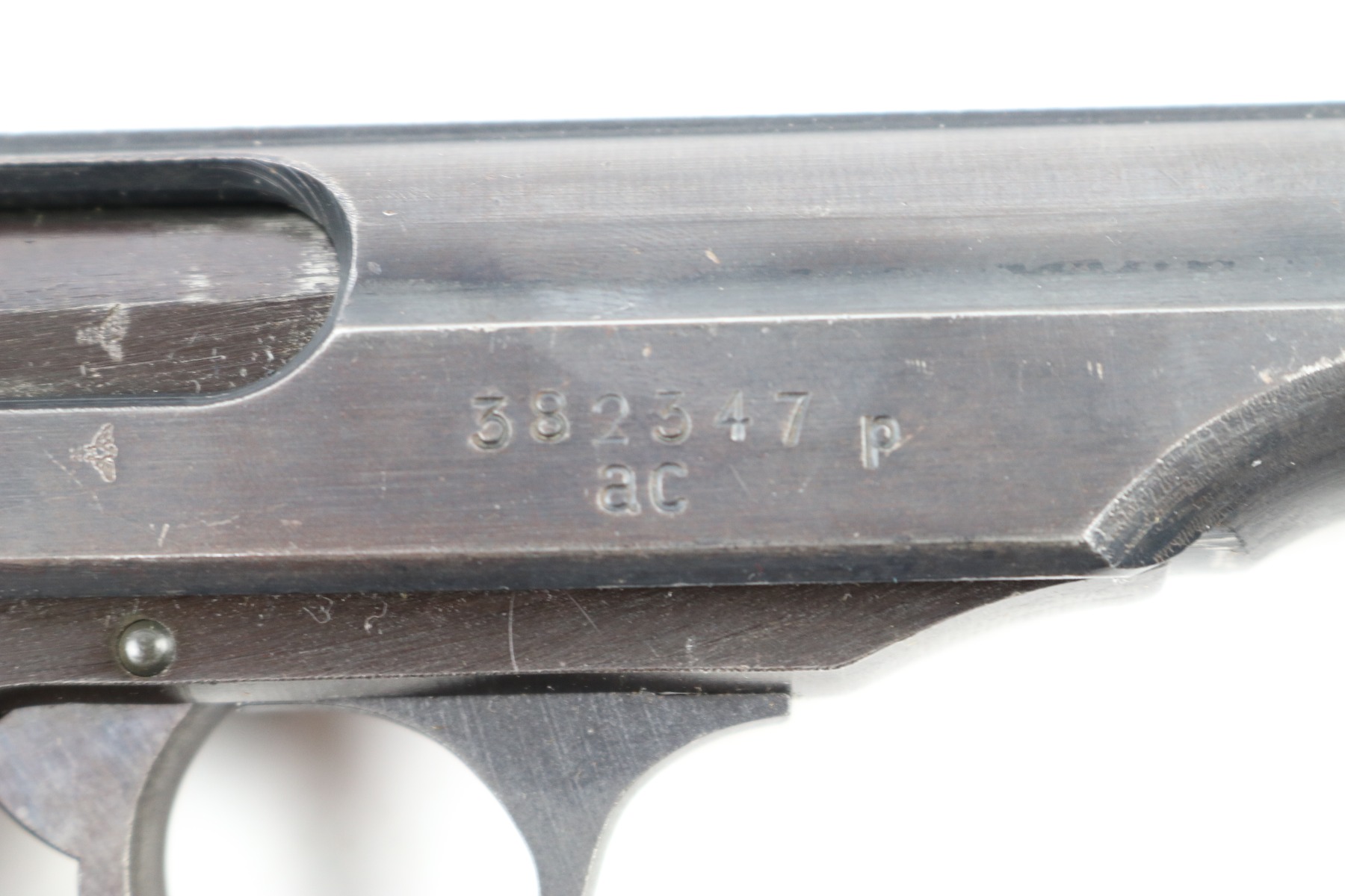 5/22/18 – This is an interesting, very late war production Walther PP. The pistol was rush-built, with no slide legend and a rougher, dull blued finish. The pistol slide has “ac” added under the serial number, and is matching to the frame. The pistol is also waffen WaA359 military proof stamped, meaning this was made for military issue. The bore is very clean and excellent. The pistol has about 85% finish in tact, with almost all of the wear being present on the left side of the slide – see photos. The slide has browning as well as pin pricking on the left slide. Guaranteed original and fully functional. A cool piece of history.