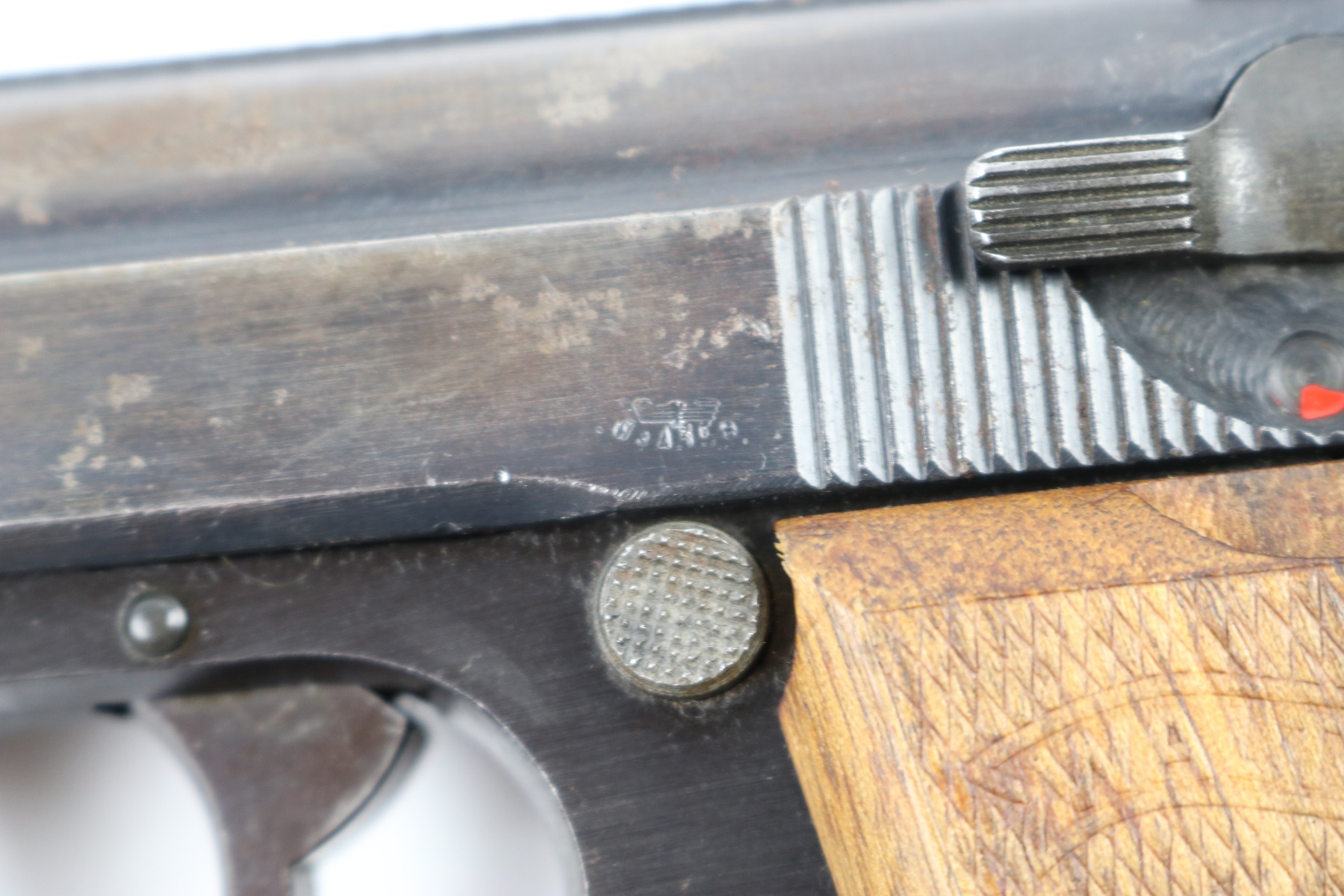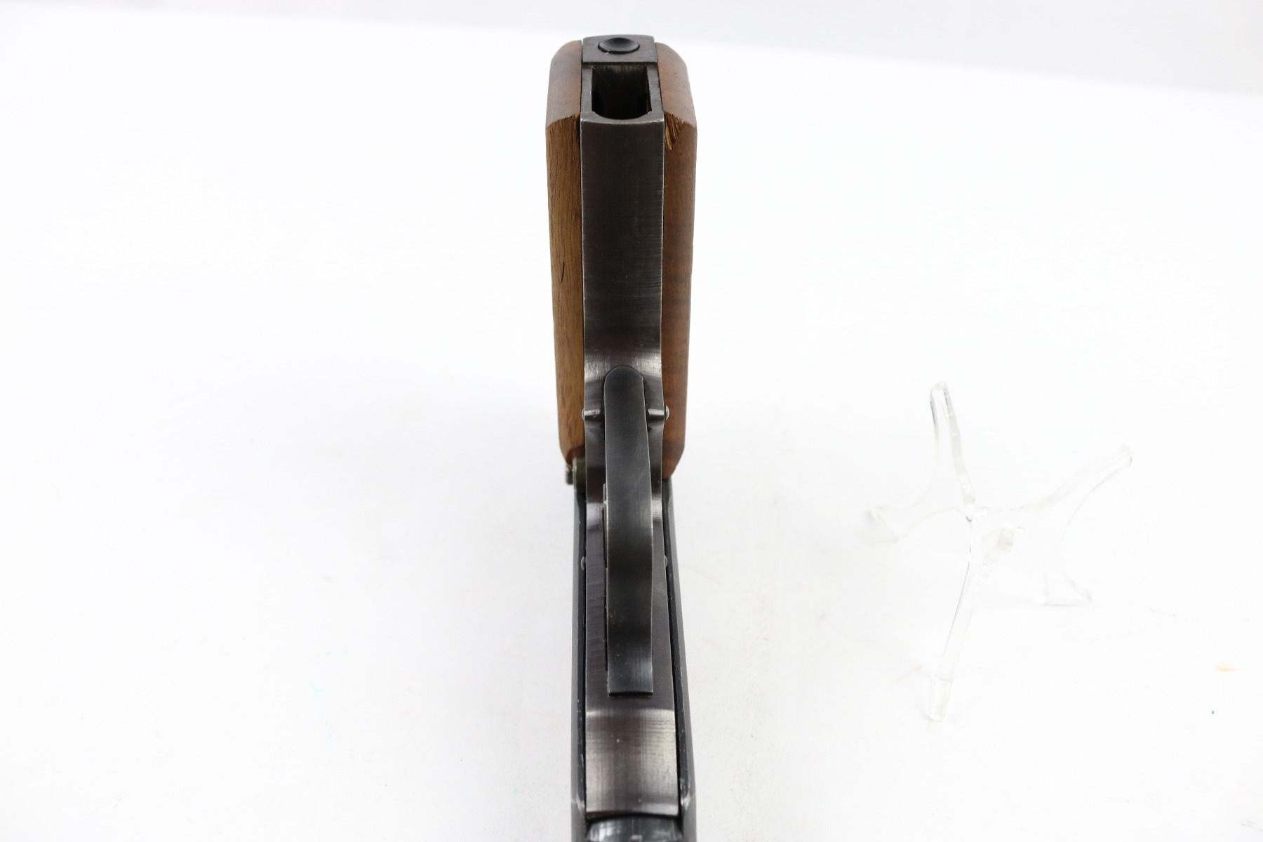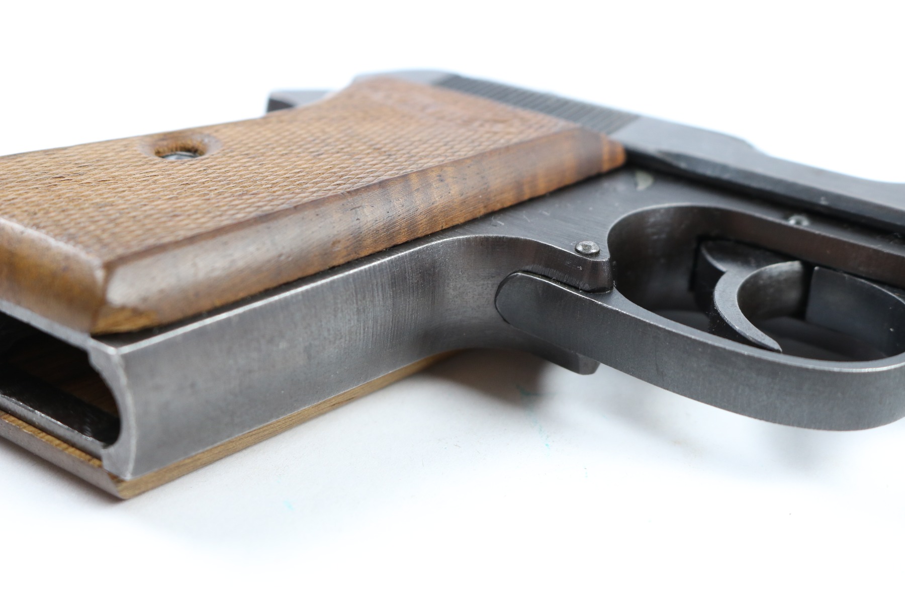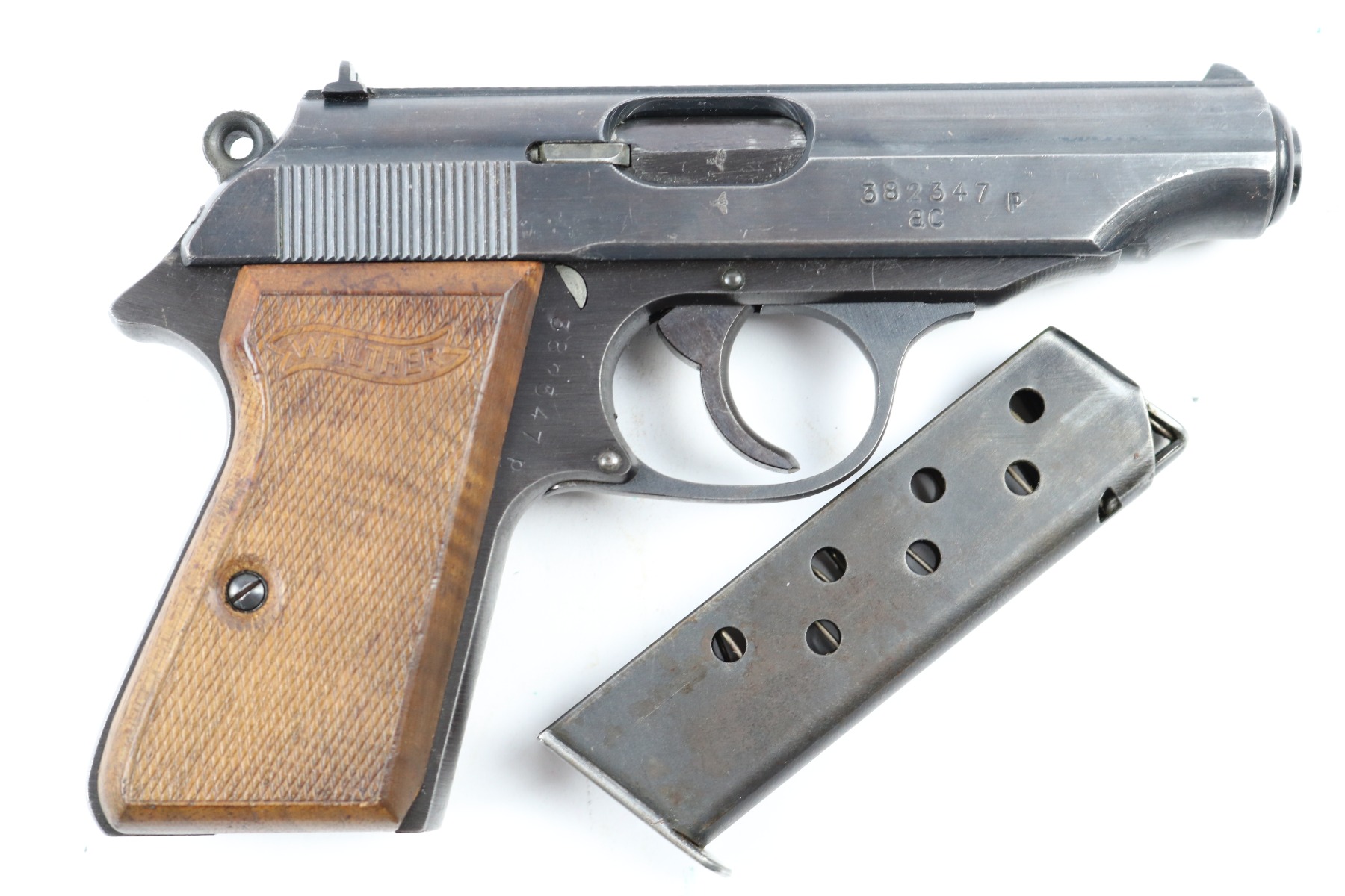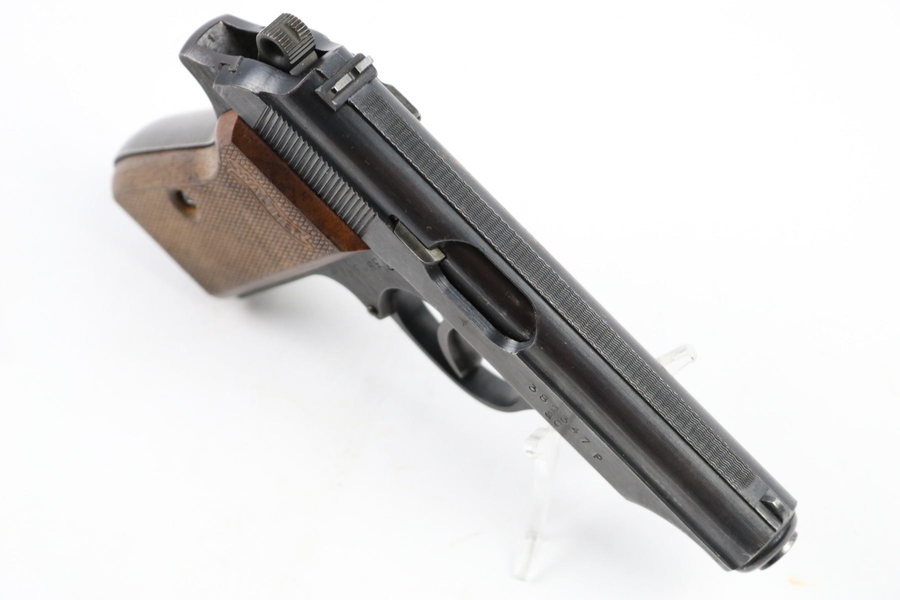 5/22/18 – This is an interesting, very late war production Walther PP. The pistol was rush-built, with no slide legend and a rougher, dull blued finish. The pistol slide has “ac” added under the serial number, and is matching to the frame. The pistol is also waffen WaA359 military proof stamped, meaning this was made for military issue. The bore is very clean and excellent. The pistol has about 85% finish in tact, with almost all of the wear being present on the left side of the slide – see photos. The slide has browning as well as pin pricking on the left slide. Guaranteed original and fully functional. A cool piece of history.