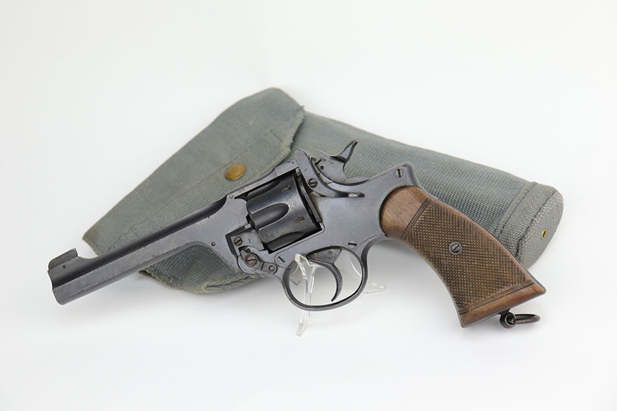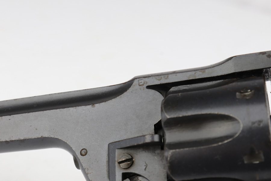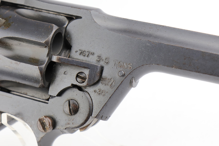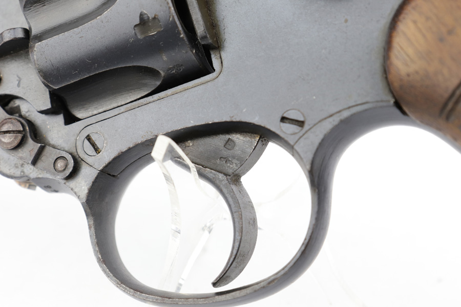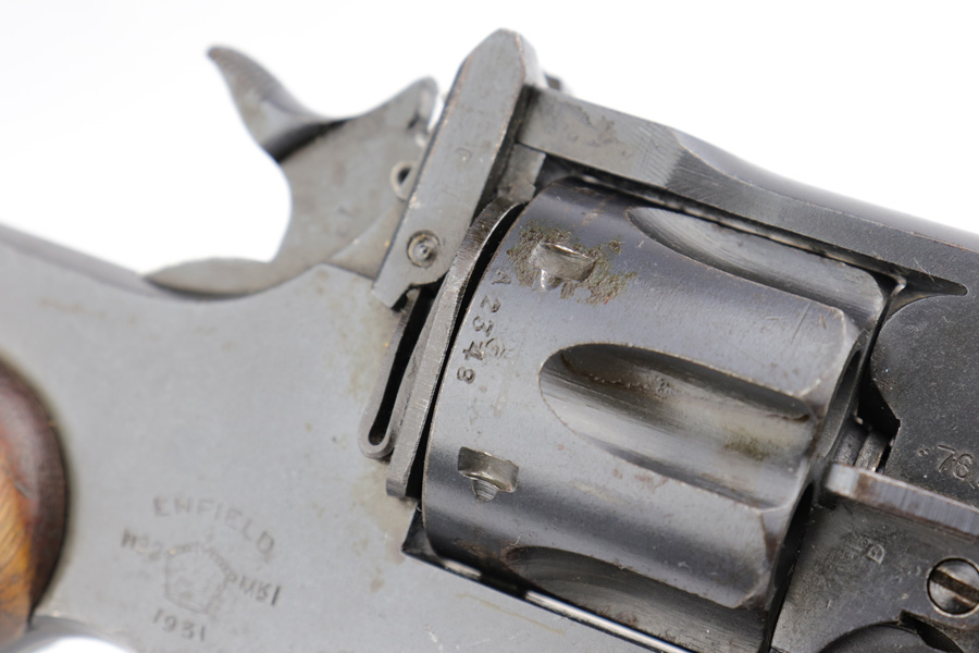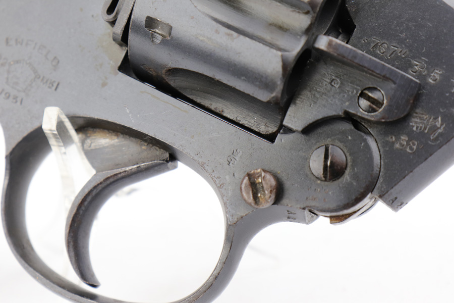 9/16/20 – This is a near-mint Enfield No 2 Mk I revolver, manufactured in 1931 with all original, matching parts. The gun retains 99% blue, with minimal bluing loss but a few small areas of surface pinpricking, mostly along the barrel. Minty bore. Excellent grips. Good timing/action. Comes with an original canvas holster with internal inkstamp dated to 1951.