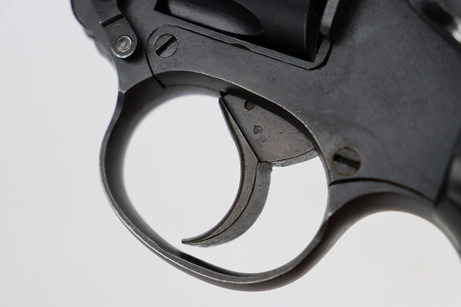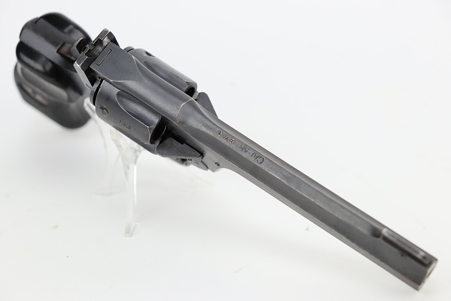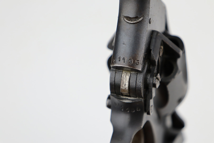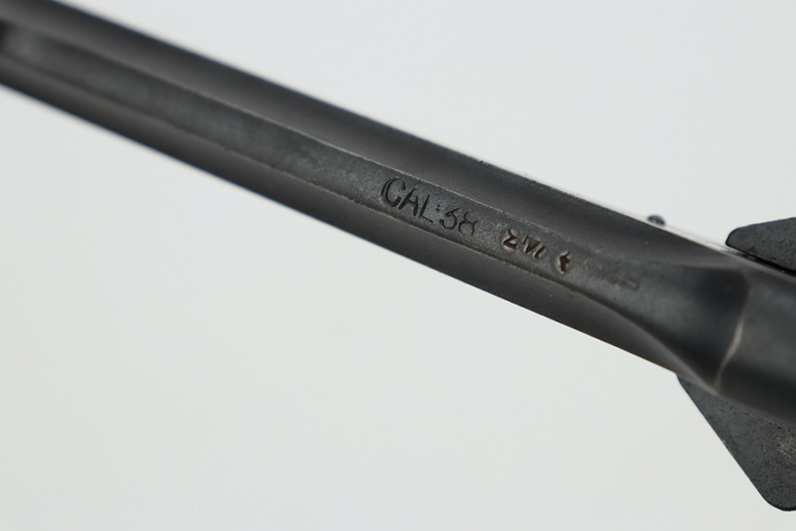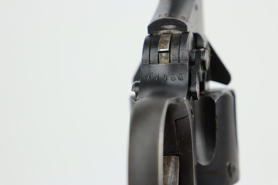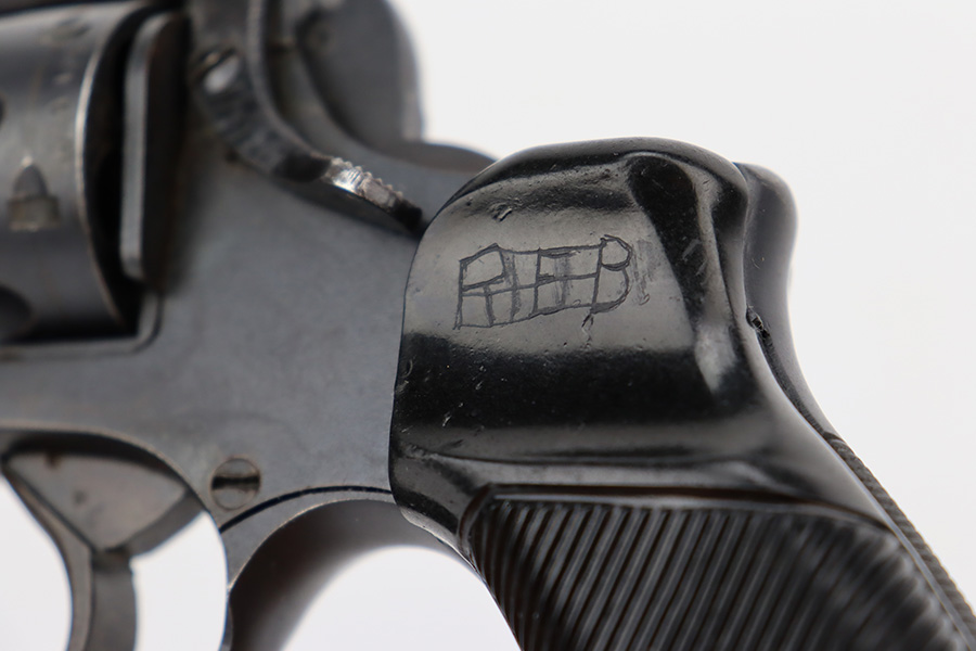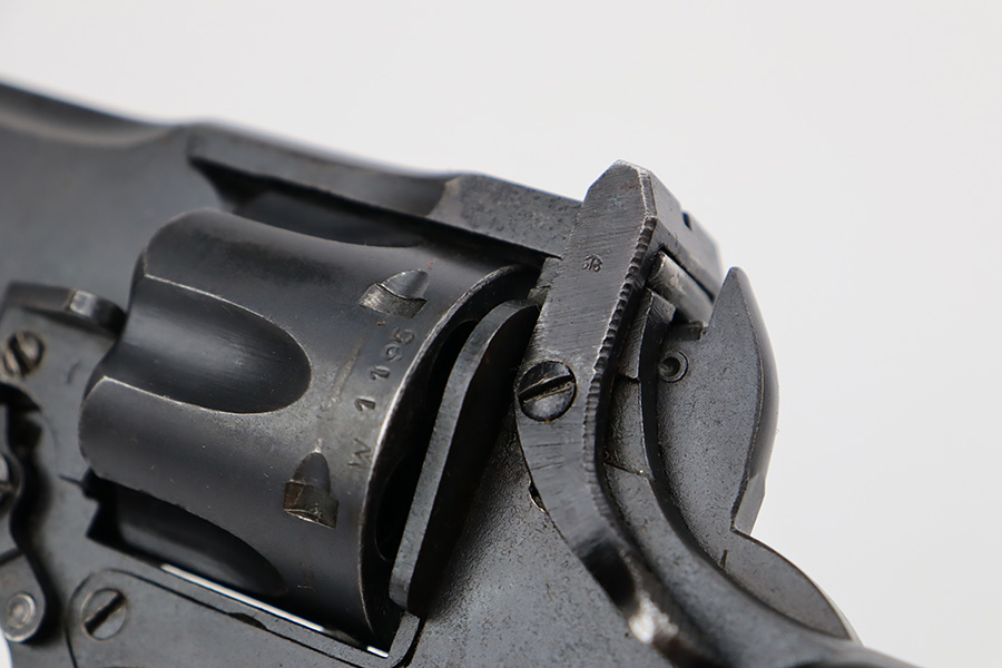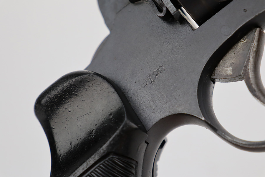 7/5/23 – This is an excellent example of an Enfield No 2 Mk 1 issued to the British military during WW2. It is all matching and has the proper British proofs throughout. It comes as a rig with a nice tan leather holster and lanyard. The inside of the holster has some hand-writing that appears to be dated with the soldier’s name. The gun itself has retained about 96-97% of its finish with very minor wear on some of the high edges and on the front strap. Some spots of dark discoloration on the right side of the gun. Fitted with nice, period-correct black bakelite grips – there are initials lightly scratched into the top of the left panel. The bore is mostly shiny with great rifling, but there is some light pin-pricking around the muzzle end.