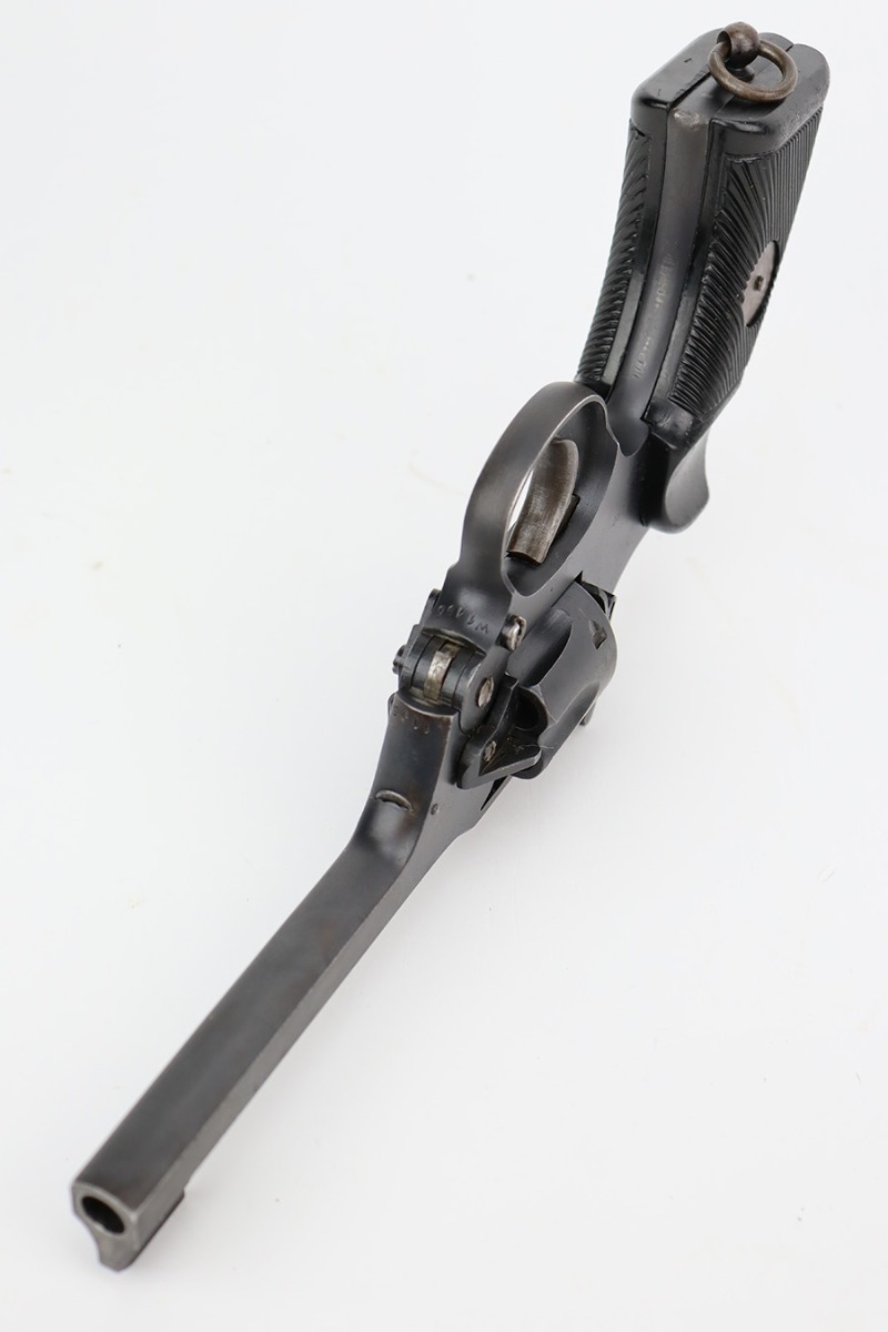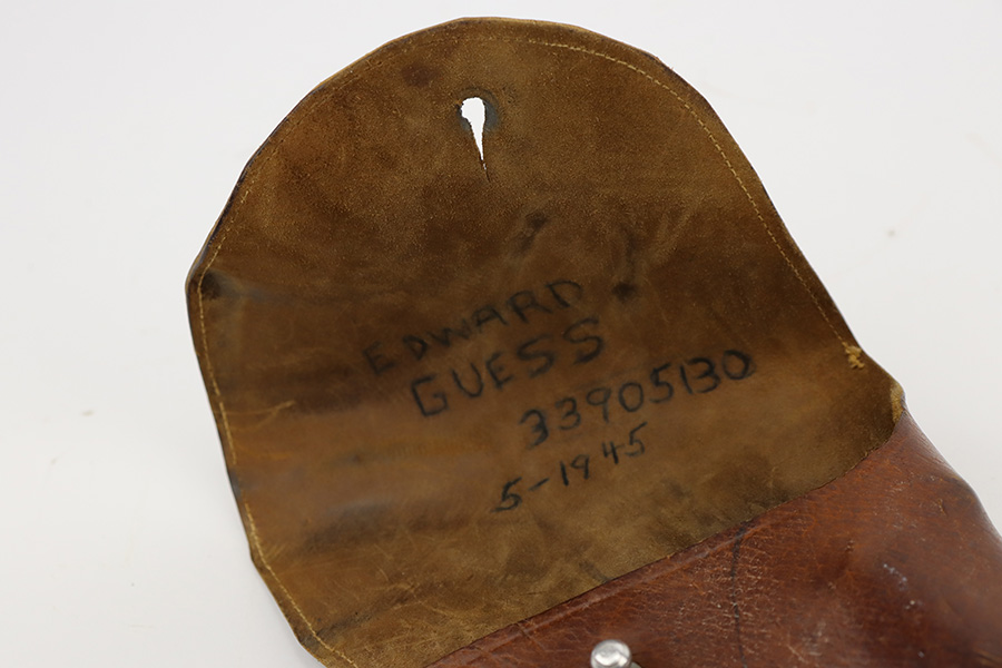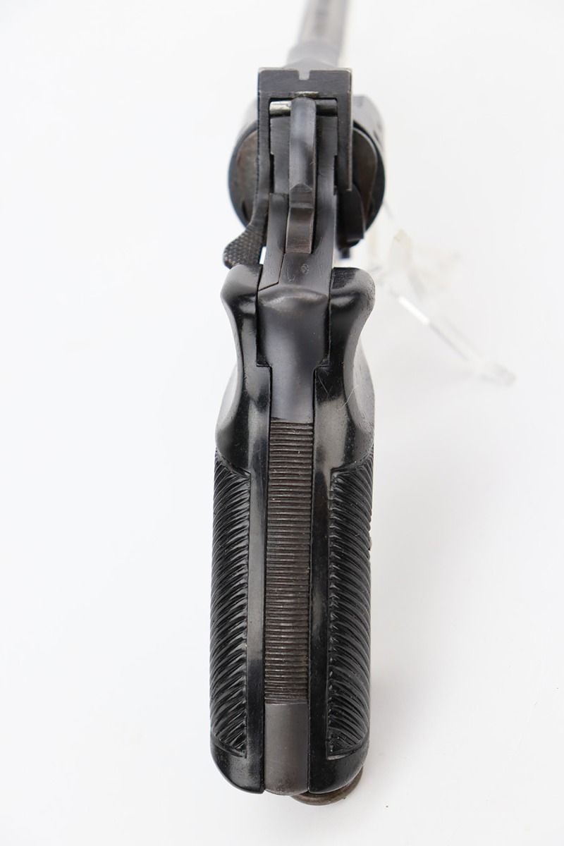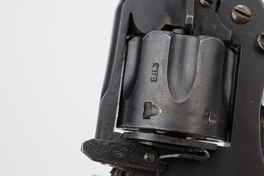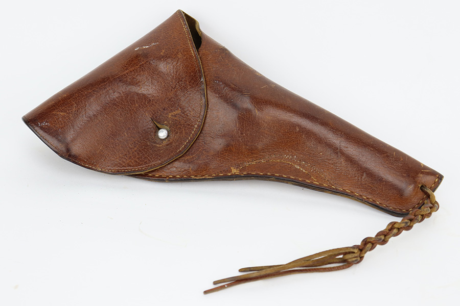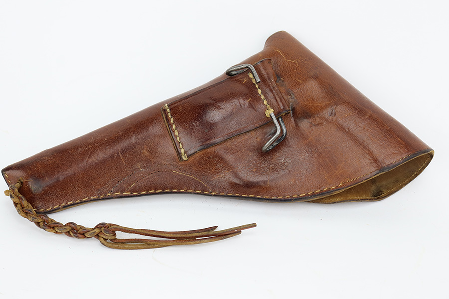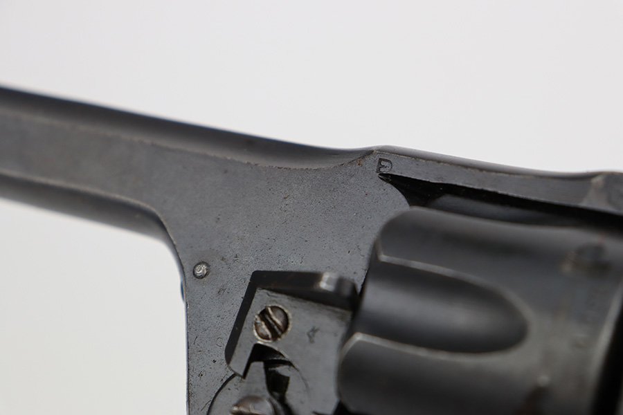 7/5/23 – This is an excellent example of an Enfield No 2 Mk 1 issued to the British military during WW2. It is all matching and has the proper British proofs throughout. It comes as a rig with a nice tan leather holster and lanyard. The inside of the holster has some hand-writing that appears to be dated with the soldier’s name. The gun itself has retained about 96-97% of its finish with very minor wear on some of the high edges and on the front strap. Some spots of dark discoloration on the right side of the gun. Fitted with nice, period-correct black bakelite grips – there are initials lightly scratched into the top of the left panel. The bore is mostly shiny with great rifling, but there is some light pin-pricking around the muzzle end.