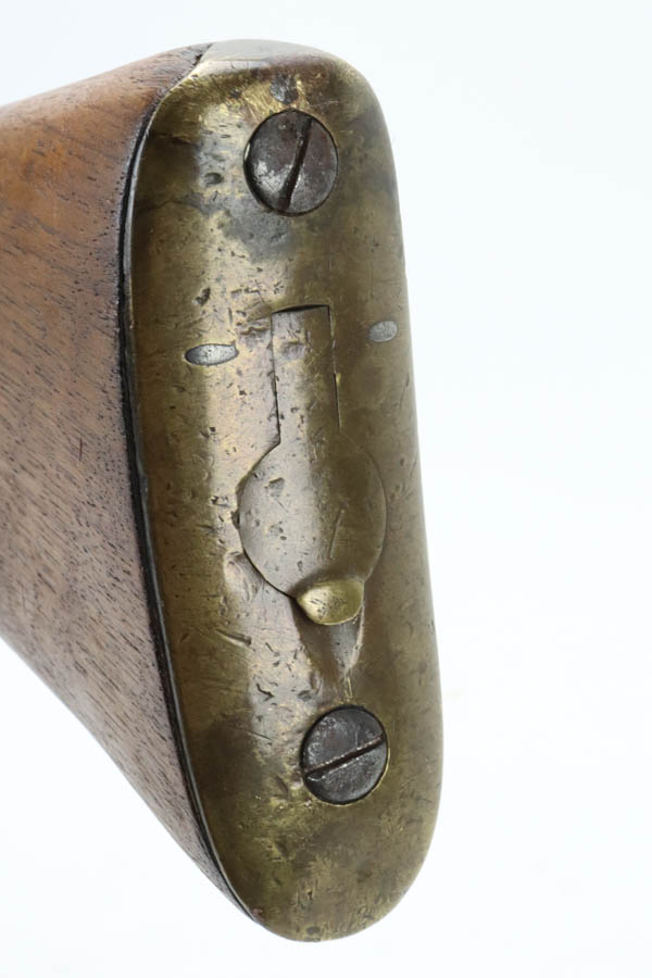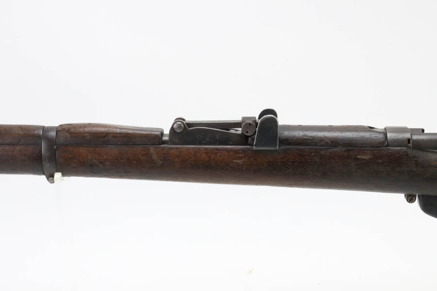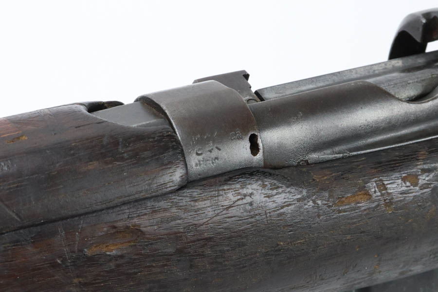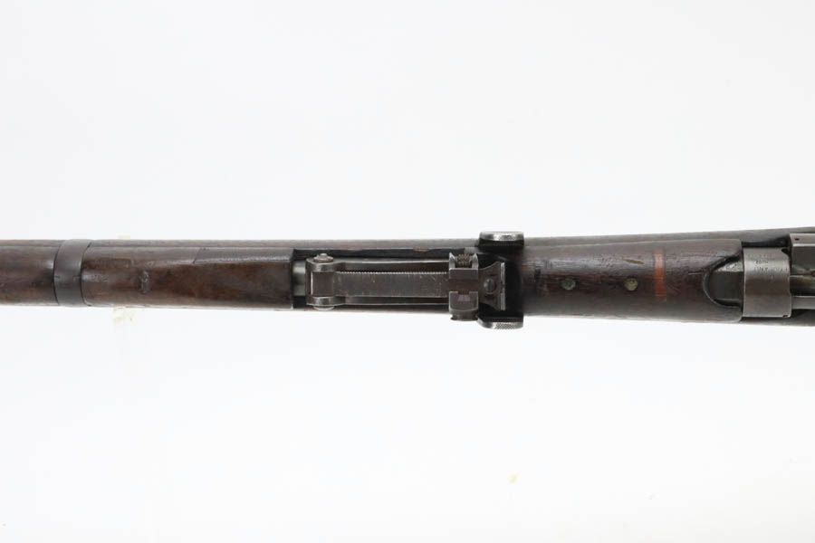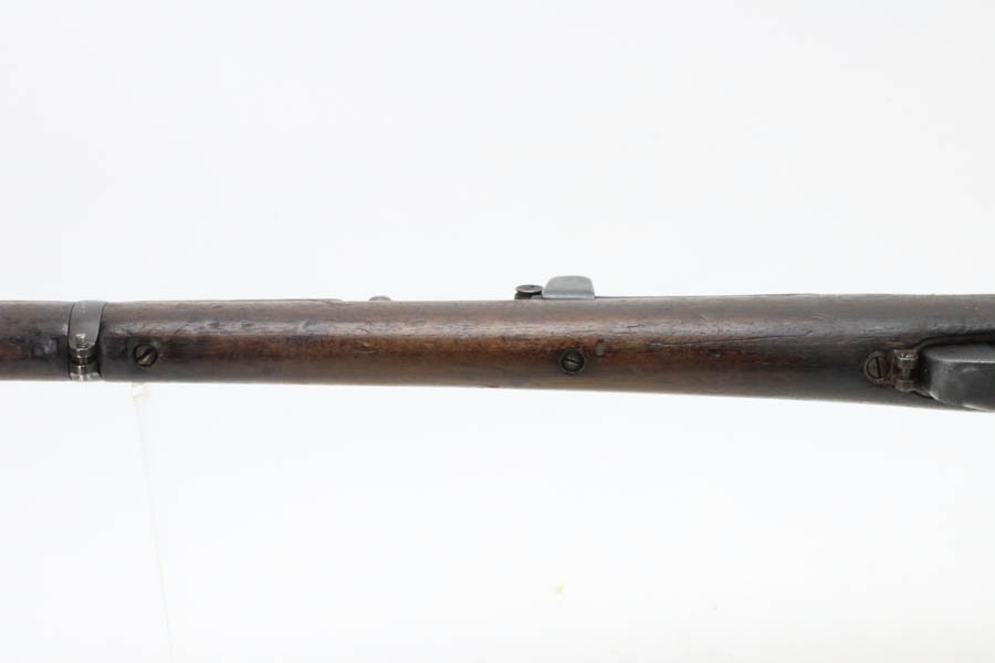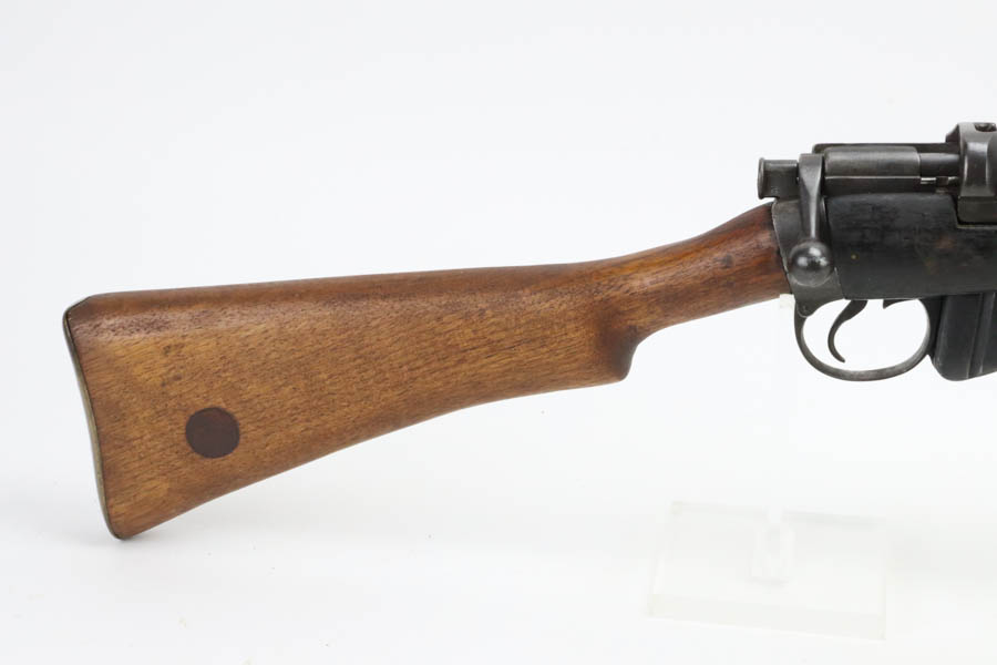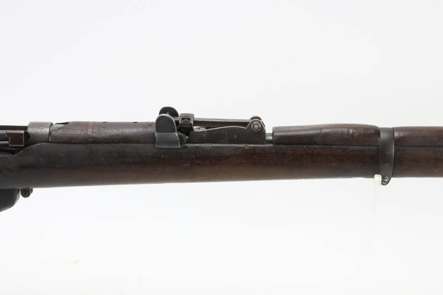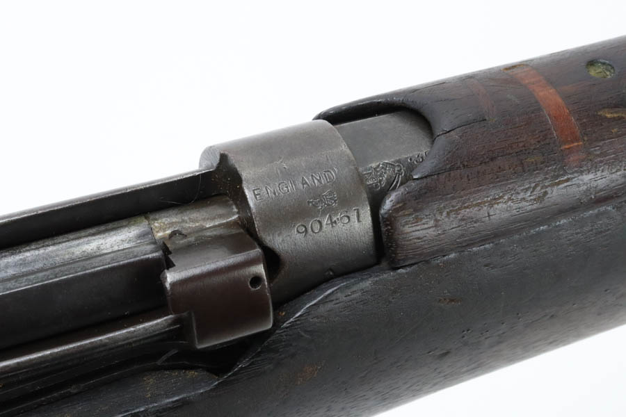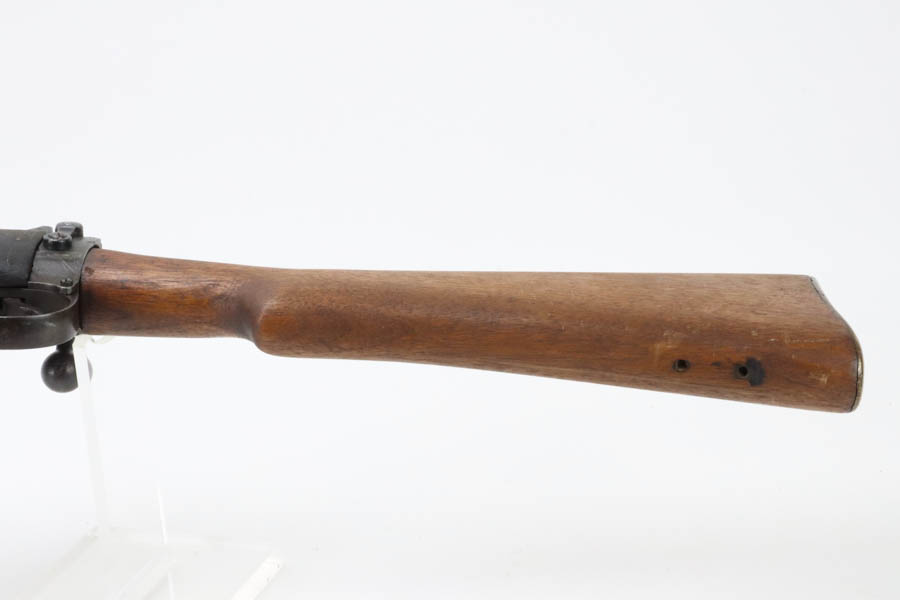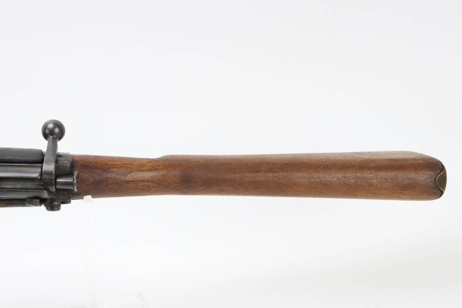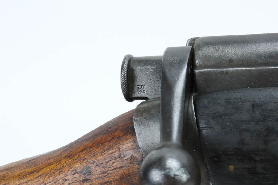 09/03/2024 – For sale is a No1 Mk3 SHTLE made by the Enfield Arsenal in 1915. This rifle is in decent condition overall and it looks like it has seen some heavy use. The metal retains a lot of its bluing but many spots are browning with age. There are also many spots of edge wear and some minor pitting visible on parts like the rear sight base. The rear stock has been replaced sometime in its life. The rifle has matching serial numbers on the receiver, bolt, and nose cap. The serial number on the foreend is not visible. The bore is bright with great rifling but it looks like either very shallow pitting about 1.5″ from the muzzle. There is a 1″ crack at the top of the wrist area where the stock meets the receiver and the front sling loop is missing.