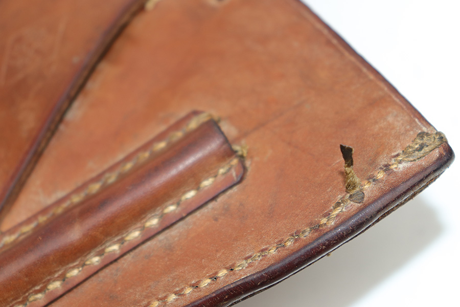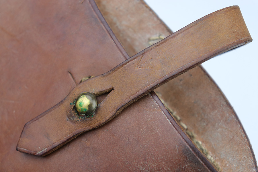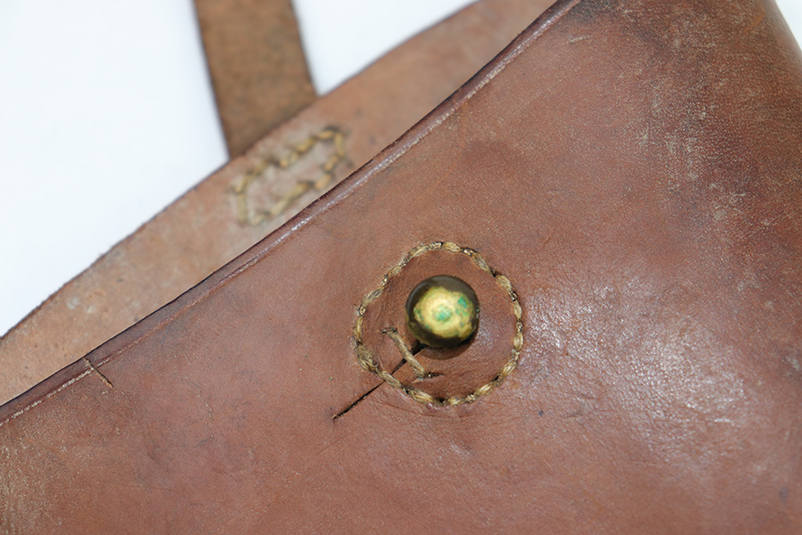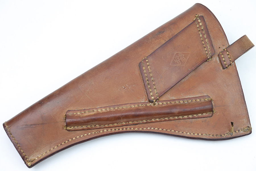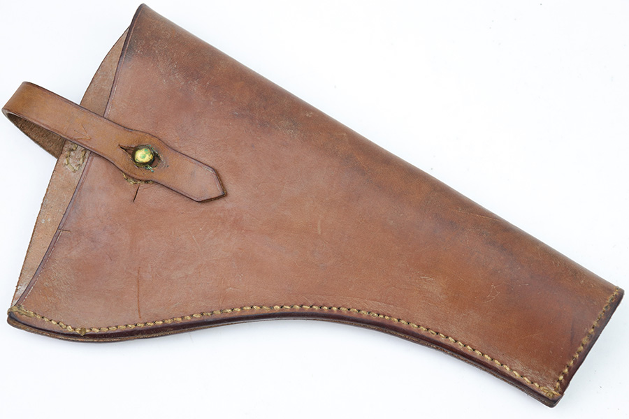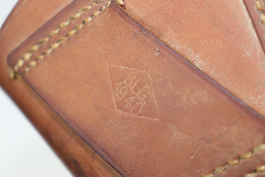 2/28/23 – This is a 1940 dated leather holster. We believe this holster is for an Enfield revolver. The holster measures 9.5 inches long and is just under 6 inches wide at the widest point. The back leather is maker stamped and dated, plus there’s a slot for a cleaning rod. The leather and stitching are in excellent condition with some mild aging and surface wear but no major issues.