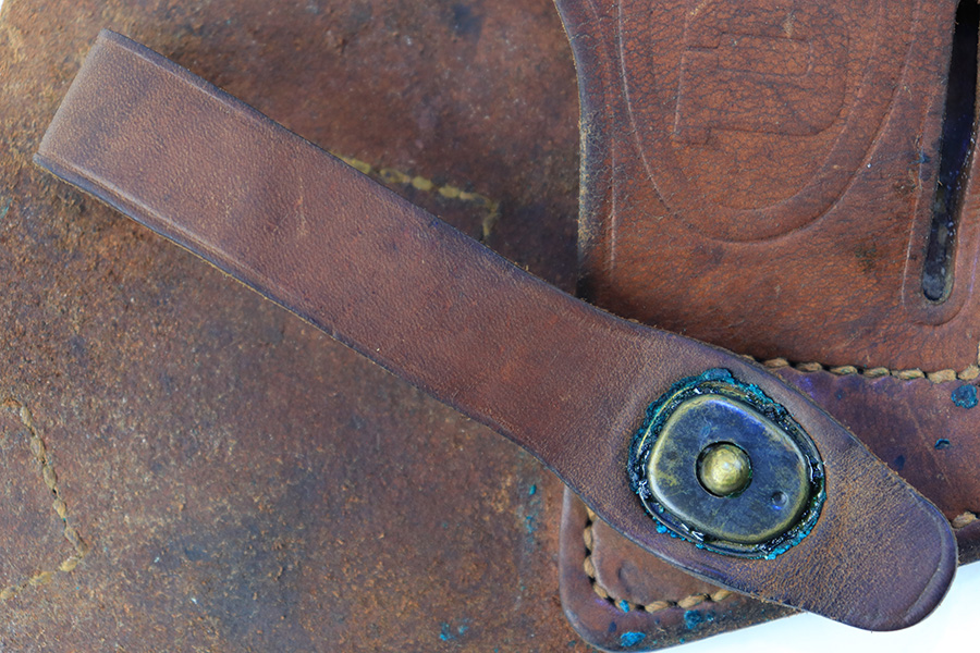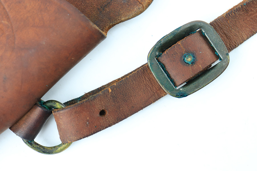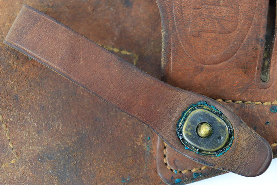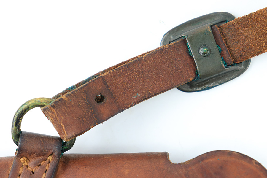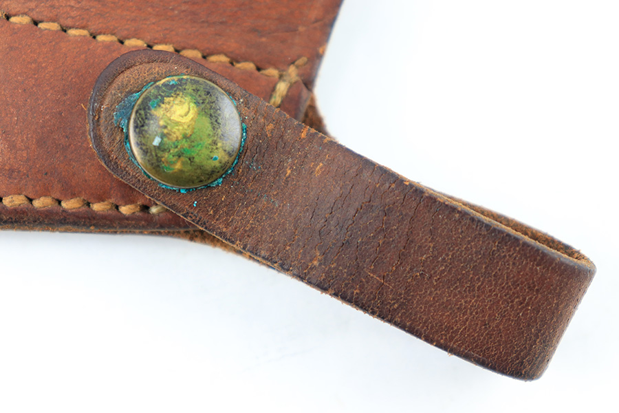 8/11/23 – This is an original WW2 era production US M7 shoulder holster. The holster is in great overall condition with all original leather and stitching. The leather has some mild surface wear and typical signs of aging but no excessive wear or damage. The front leather is “US” stamped, and the back leather is stamped “U.S. Enger-Kress”. The shoulder strap has some light surface wear but is completely intact.