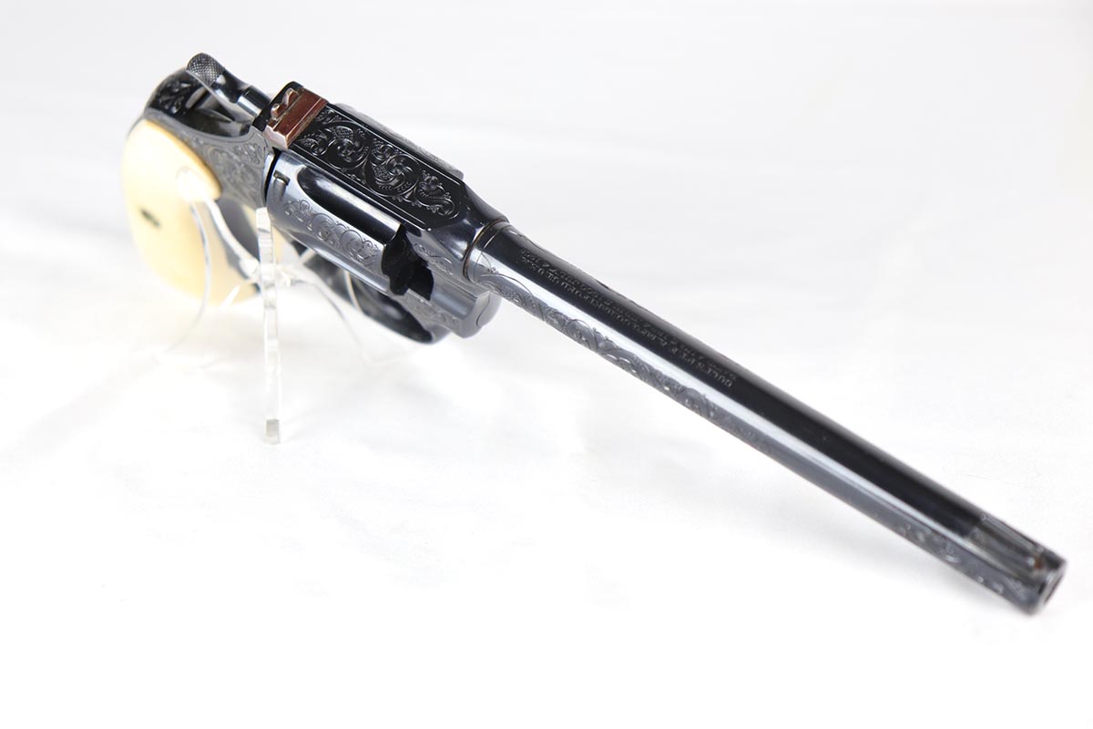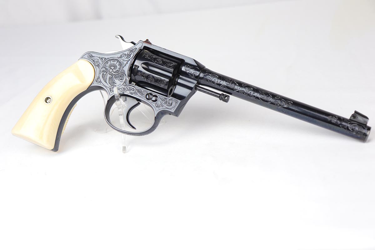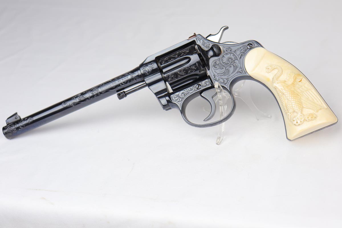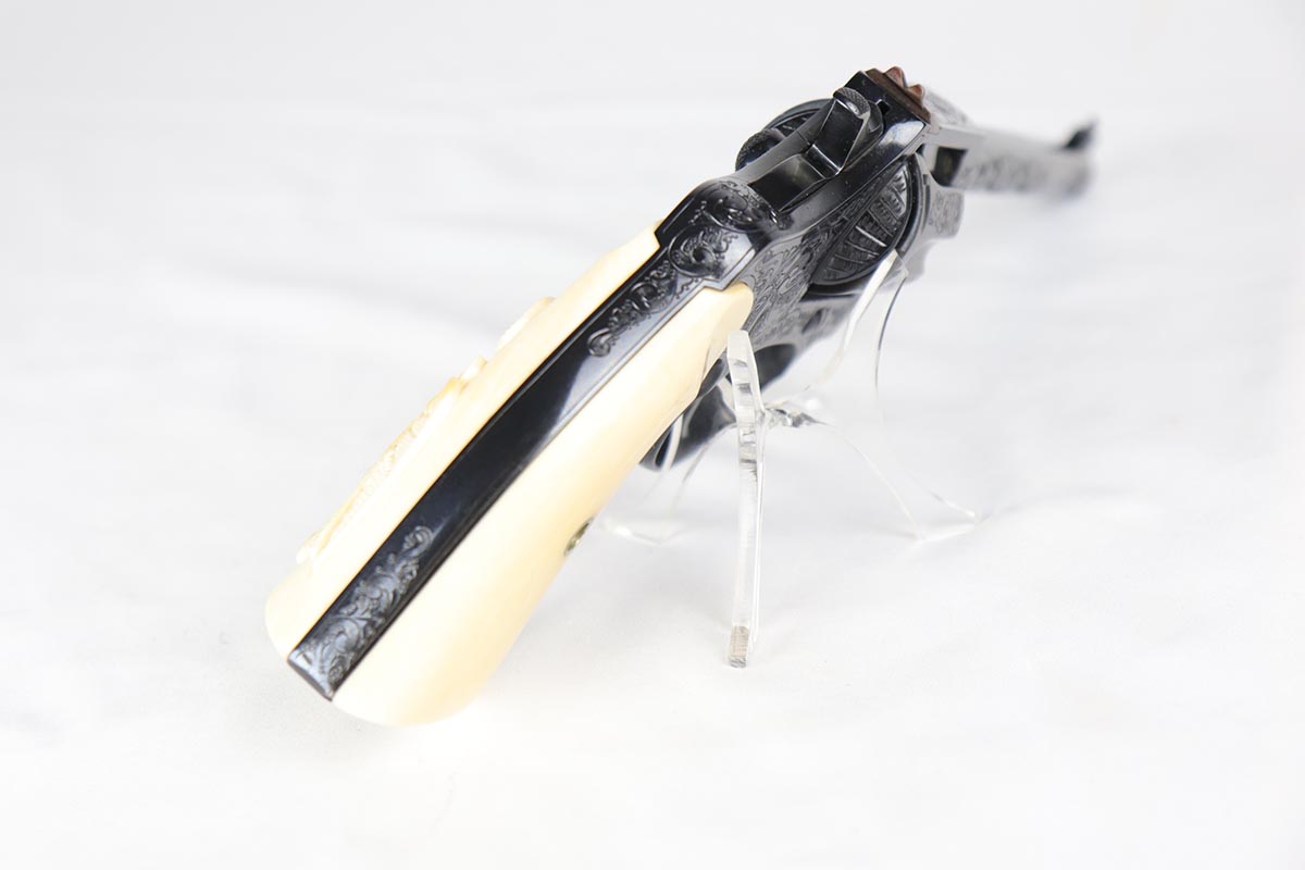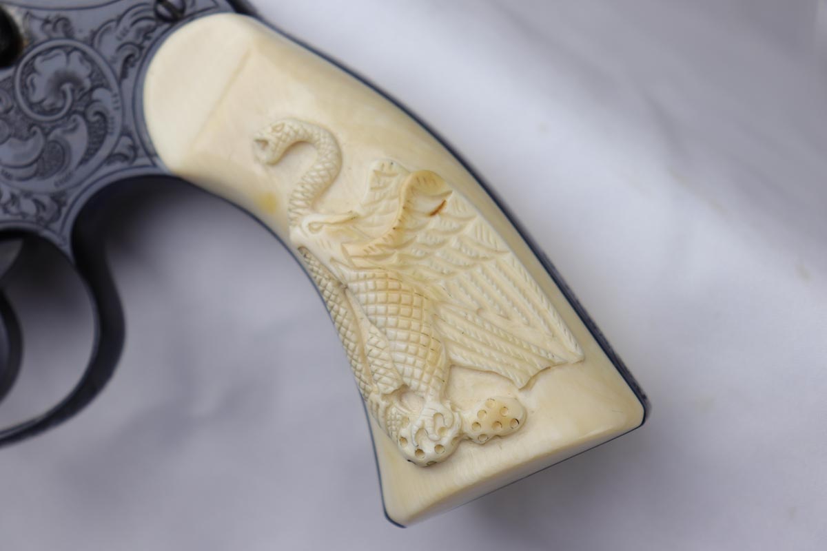 8/13/18 – This is an early and gorgeous Colt Police Positive (Target Model) revolver with fantastic custom engraving. The revolver shows little to no wear and the engraving is sharp throughout. This is a first issue Police Positive, made in 1910 and chambered in .22 WRF. Has gorgeous ivory grips carved with Mexican eagle and snake. There’s also an original Colt factory letter. The indexing does need slight adjustment. Bore has good rifling but does have some minor corrosion throughout.