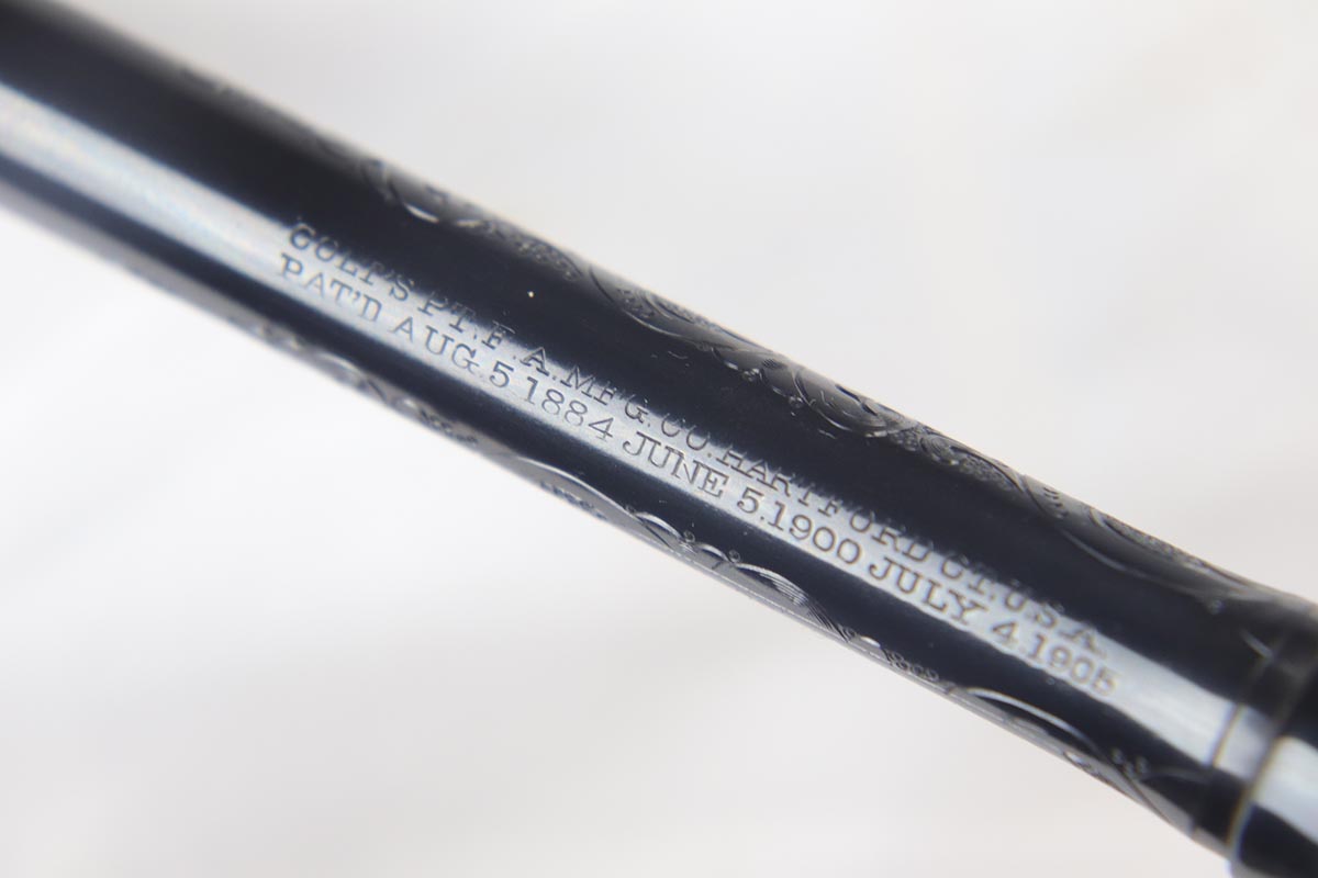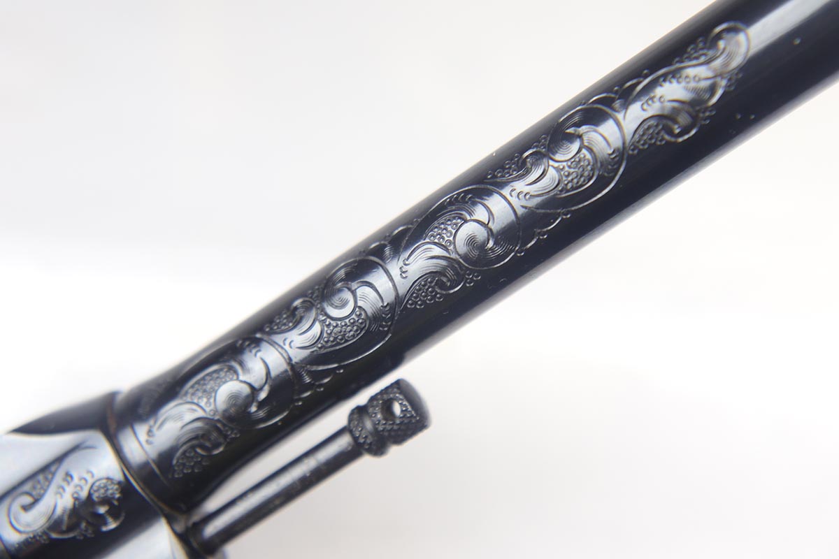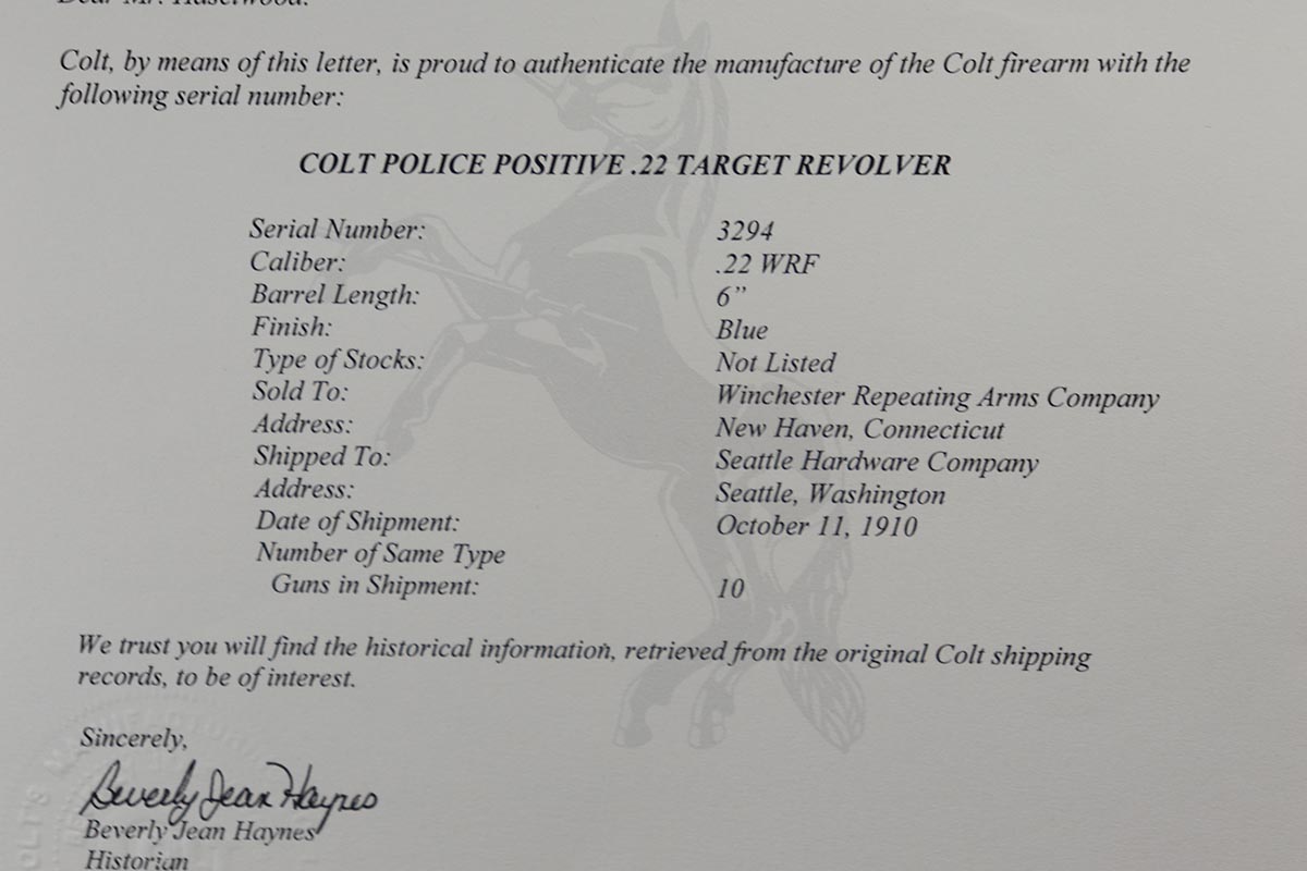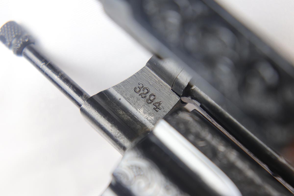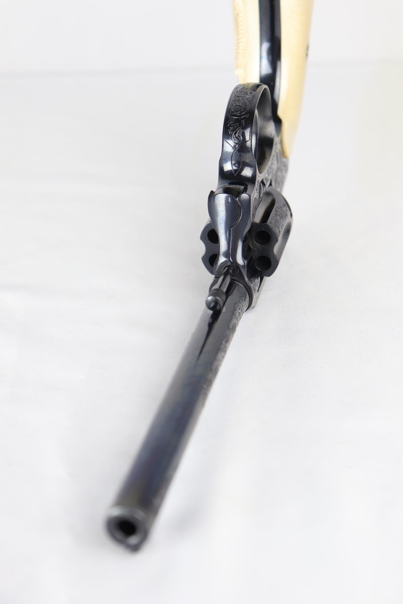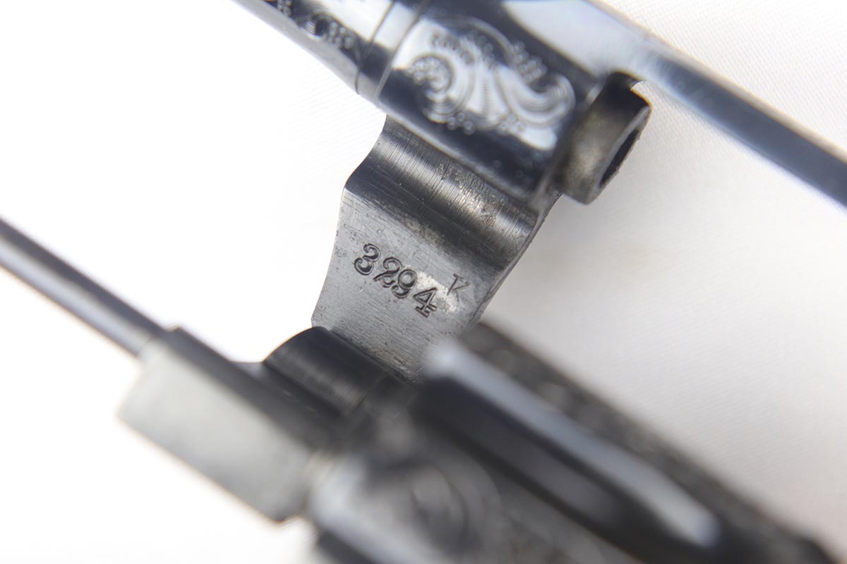 8/13/18 – This is an early and gorgeous Colt Police Positive (Target Model) revolver with fantastic custom engraving. The revolver shows little to no wear and the engraving is sharp throughout. This is a first issue Police Positive, made in 1910 and chambered in .22 WRF. Has gorgeous ivory grips carved with Mexican eagle and snake. There’s also an original Colt factory letter. The indexing does need slight adjustment. Bore has good rifling but does have some minor corrosion throughout.