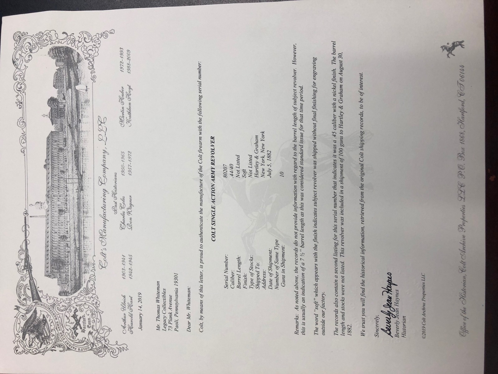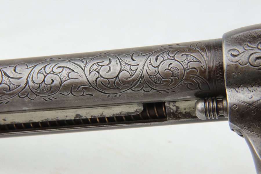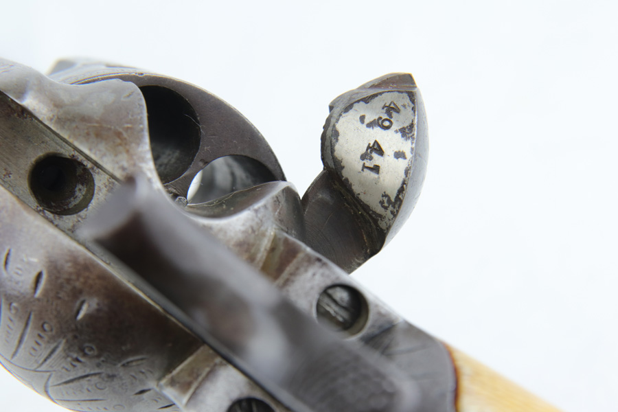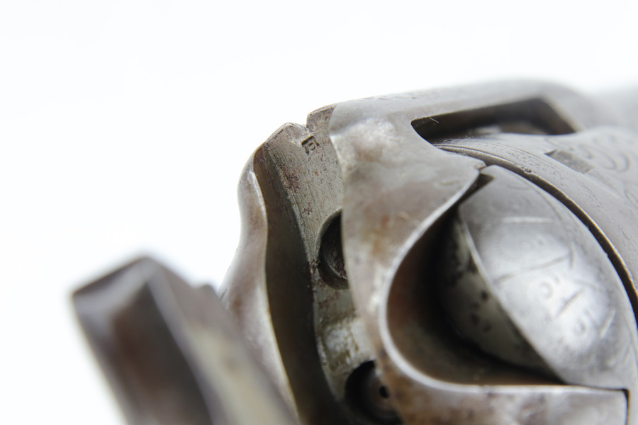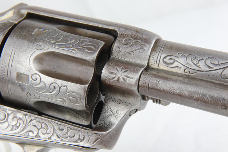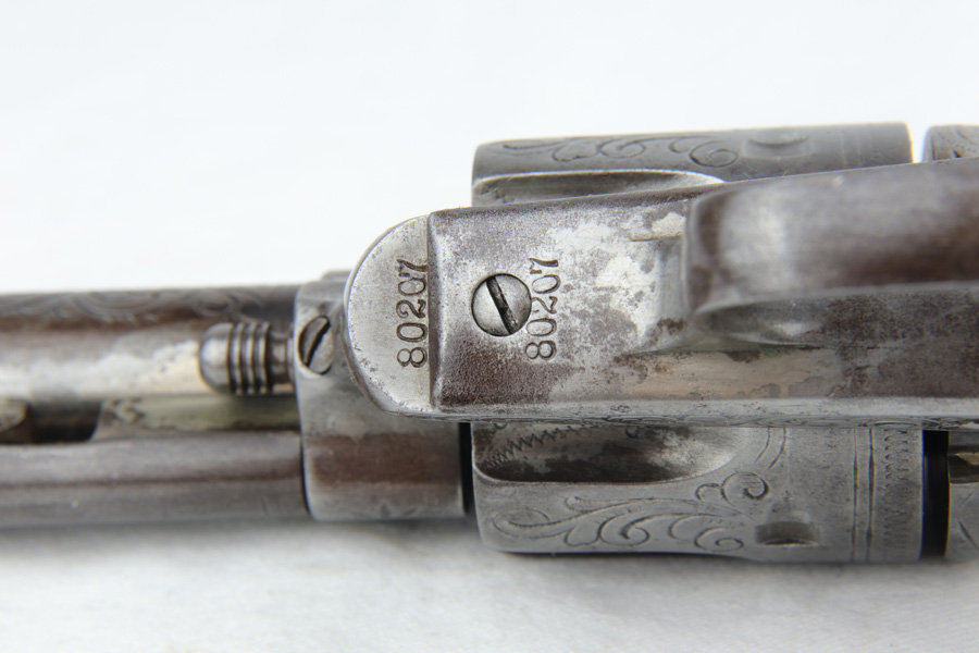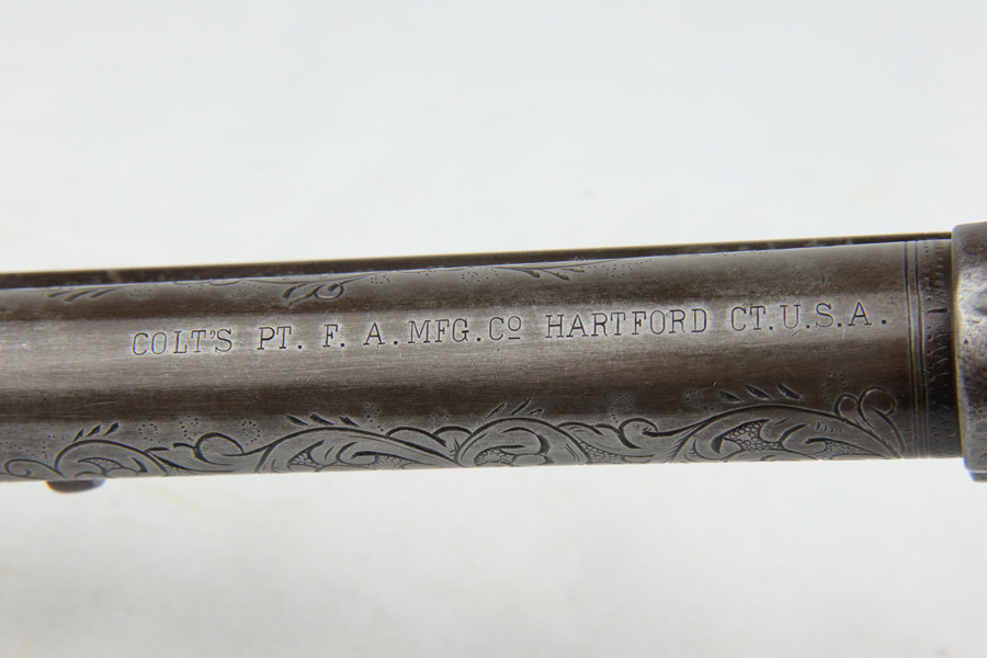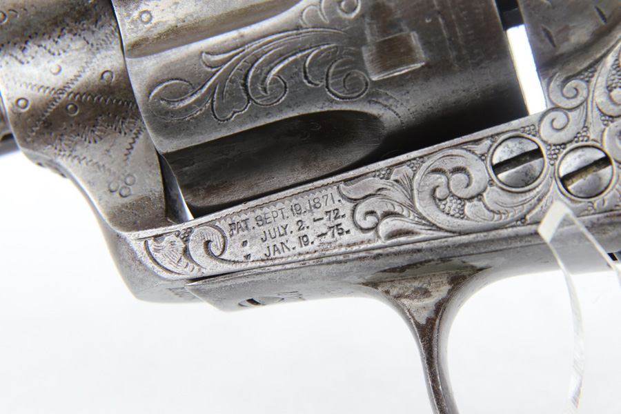 1/28/19 – This is an all original, nickel engraved Colt SAA made in 1882. We have a factory letter on the way and will post when it arrives but it will state that this Colt was shipped to Hartley and Graham in New York City on July 5, 1882. They were the largest firearms dealer in the US in 1860. They bought unfinished guns from Colt and then added custom features such as engraving and grips. This was one of 10 guns Colt shipped to them in July of 1882. The gun was shipped with “soft finish” which means it was sent as unhardened, bare metal. It was also most likely shipped with no grips. Hartley and Graham then engraved the gun, did the nickel plating and added the ivory grips. Therefore when we say original nickel and grips we must clarify that this was done after leaving the factory but was the first and only finish and grips on the gun. The engraving therefore was also not done in the factory but period correct as the work was all done by the retailer. An incredible find in this condition. The ivory grips show age discoloring and cracking (to be expected), and the nickel finish has flaking in several spots and brown patina throughout. The parts are all matching. The bore is very good with strong rifling. The action is tight and I’m sure the gun would shoot just fine. However, we don’t recommend shooting it due to the collector value. Comes in .44-40 with 7.5 inch barrel. On the bottom of the frame is the name J. Wright. The inscription appears to be original to the period and therefore he is likely the gentleman who ordered the Colt along with its custom features. Comes with Colt factory letter. If only it could talk…