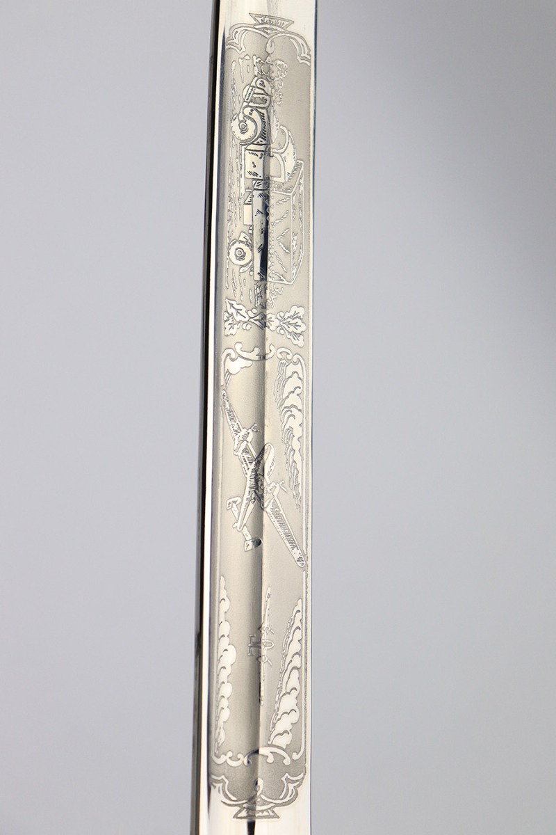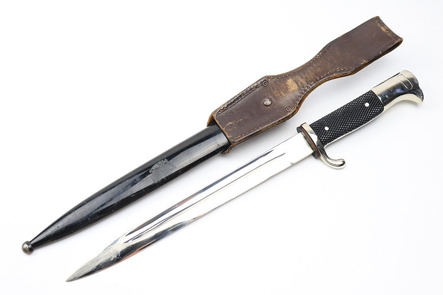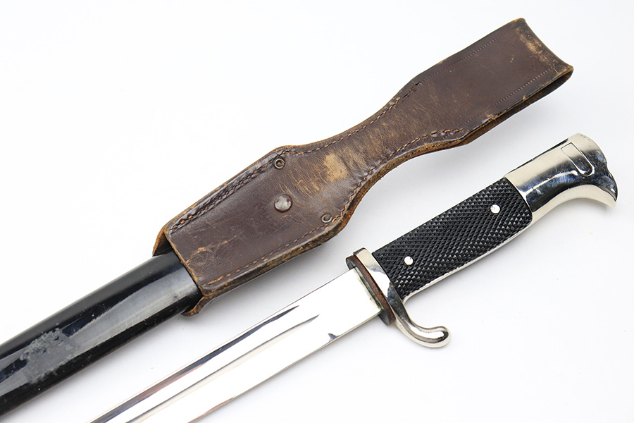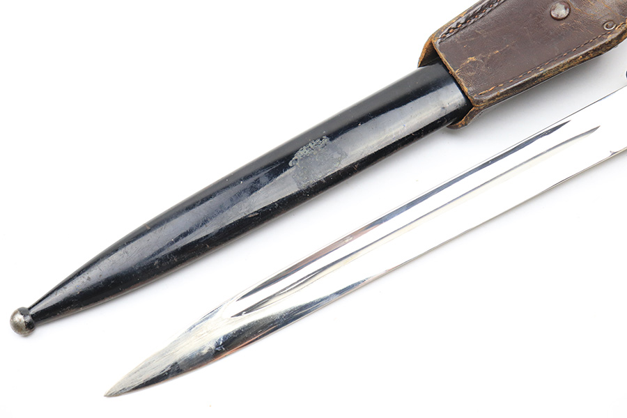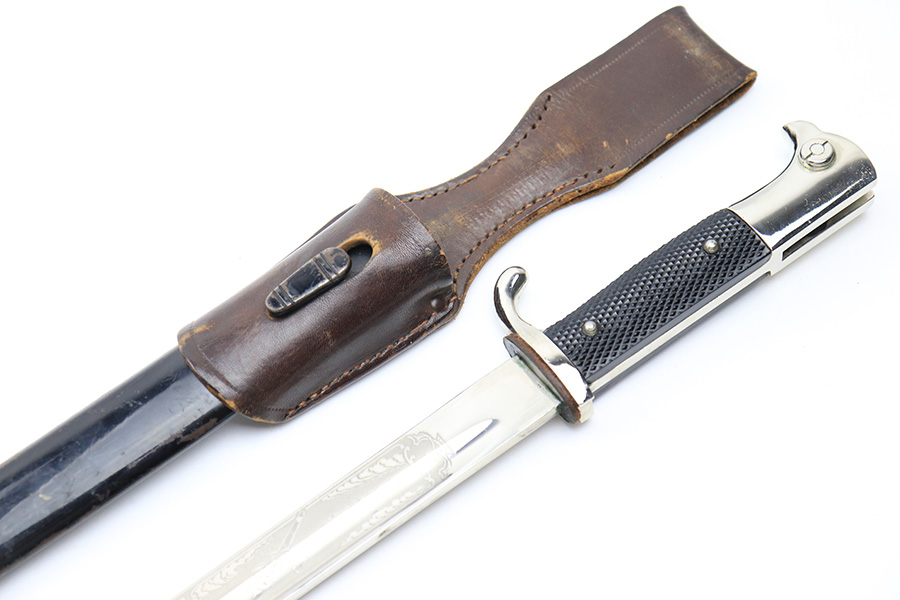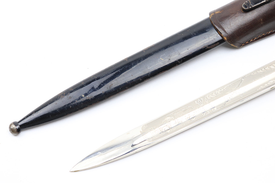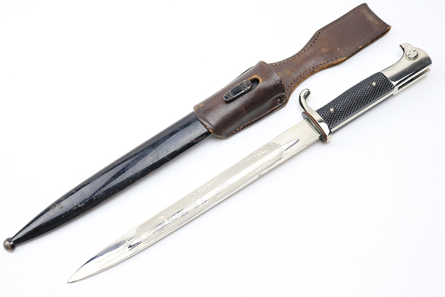 5/11/22 – This is an original WW2 production K98 Dress / Parade bayonet. The bayonet has been custom engraved or etched on one side. Likely given as a gift or presentation for a soldier / veteran during WW2. The engraving is beautiful depicting a transport truck and airplanes. Perhaps this was given to a member of the NSKK or Reichsbahn. The blade is in excellent condition throughout with some mild scabbard wear. The leather stopper is still intact. The handle & hilt is also excellent with a sharp diamond pattern and polished metal. Comes with an original scabbard that has some mild finish loss, and a brown leather frog.