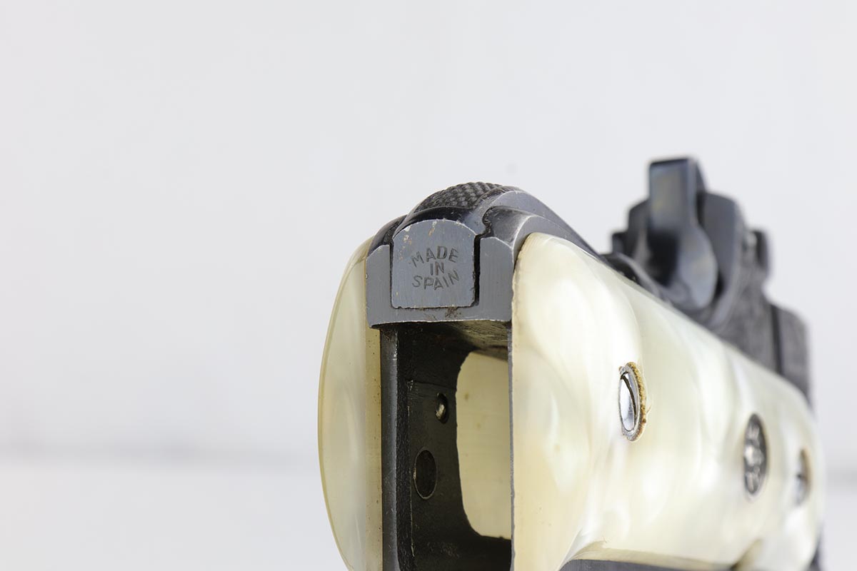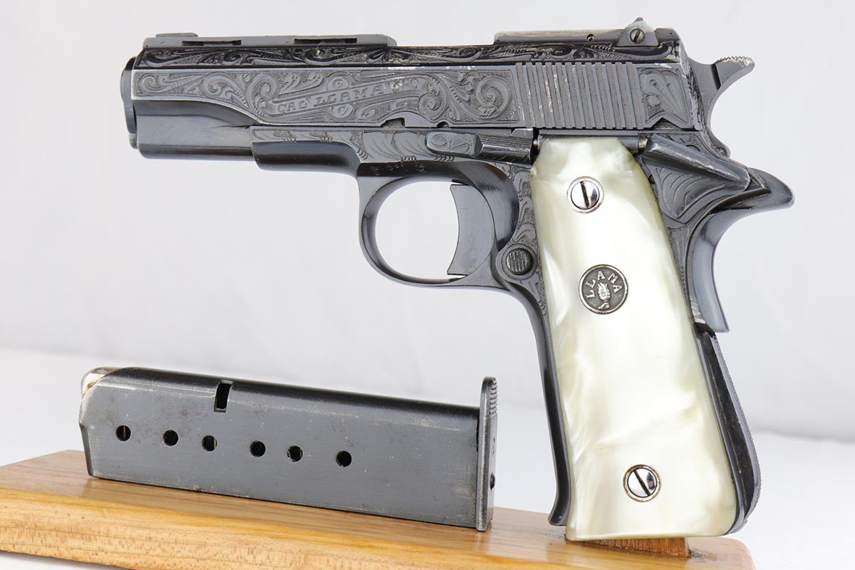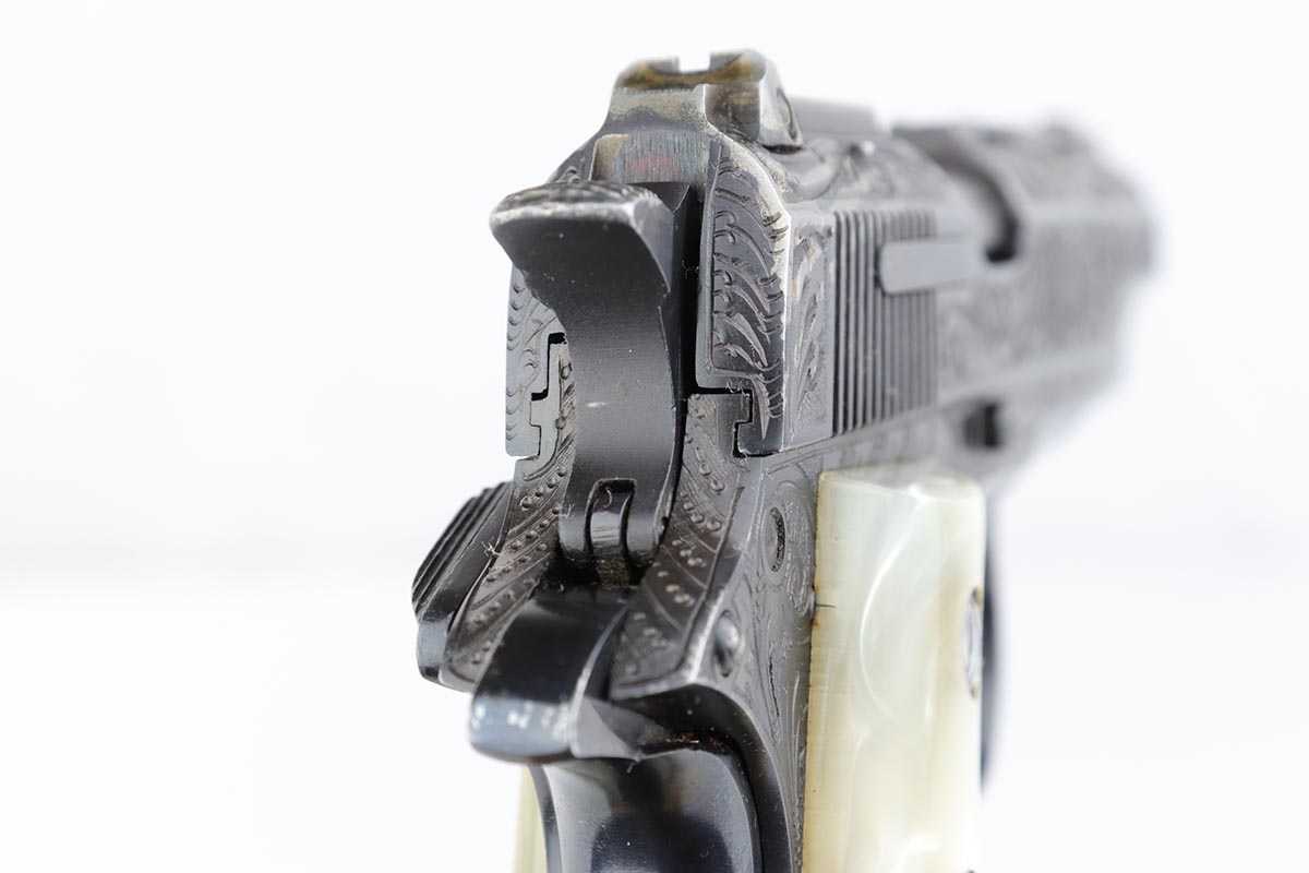 2/5/20 – This is a beautifully engraved LLama Mini 1911 in excellent, original condition. The bluing rates at 96-98% with minor edge slide wear on both sides. Beautifully engraved slide and frame. Exquisite mother of pearl grips. Minty bore.