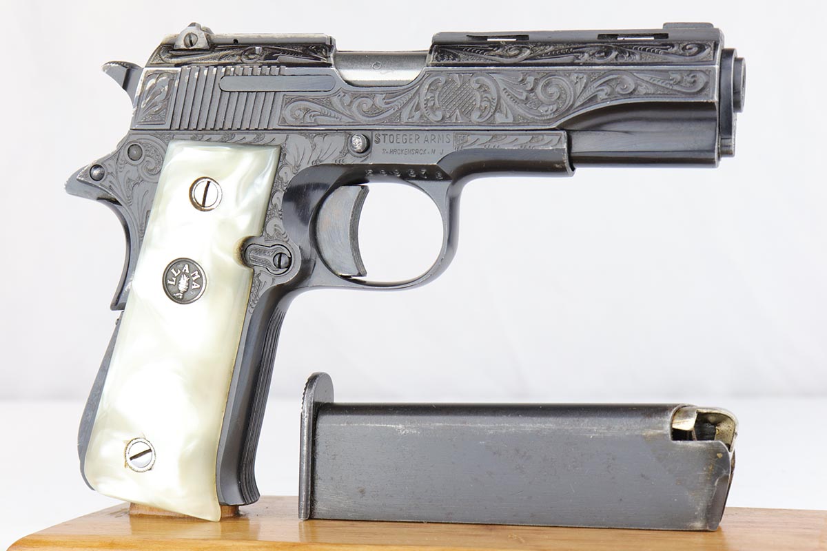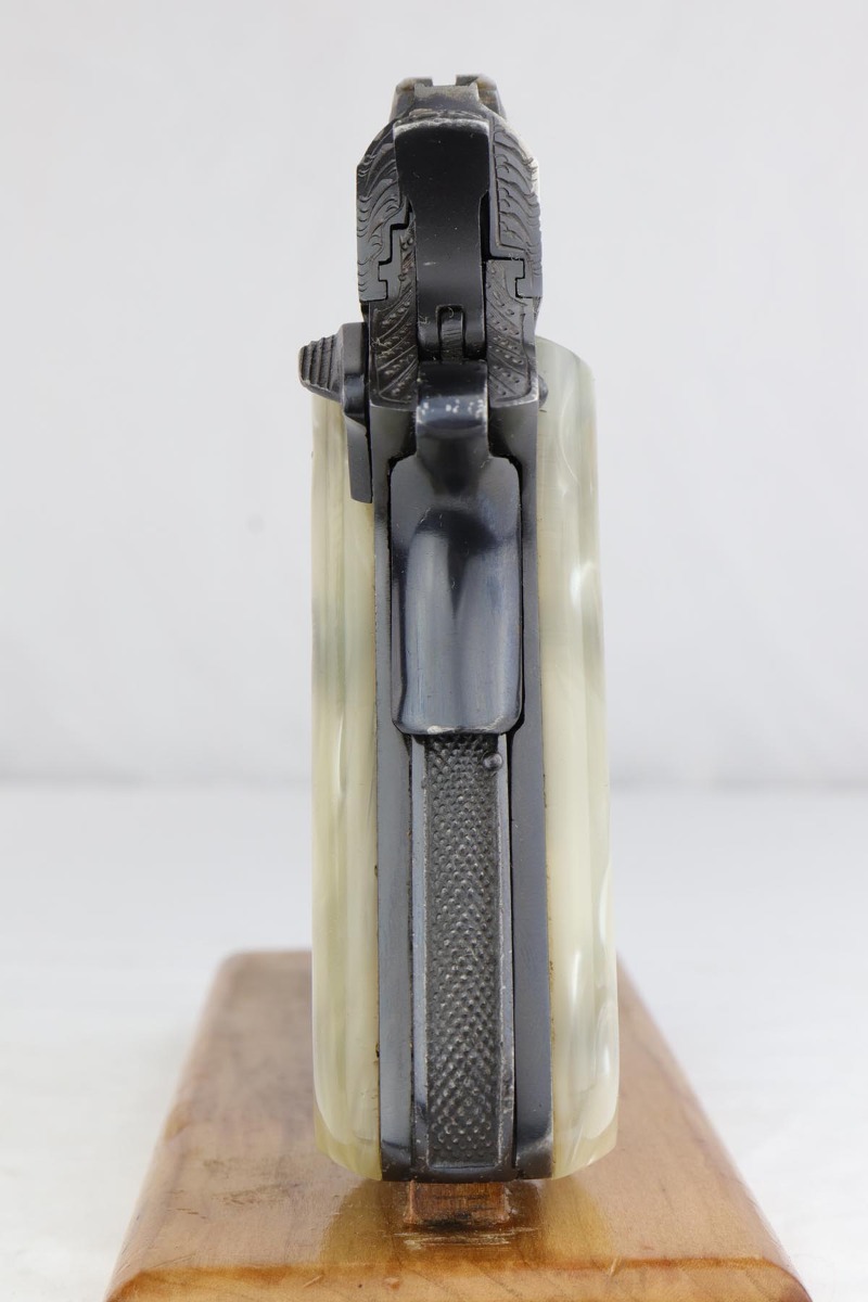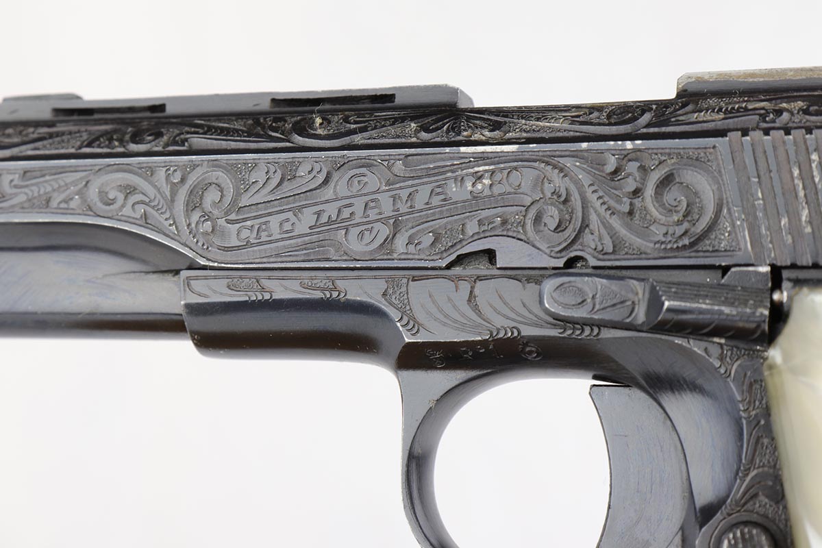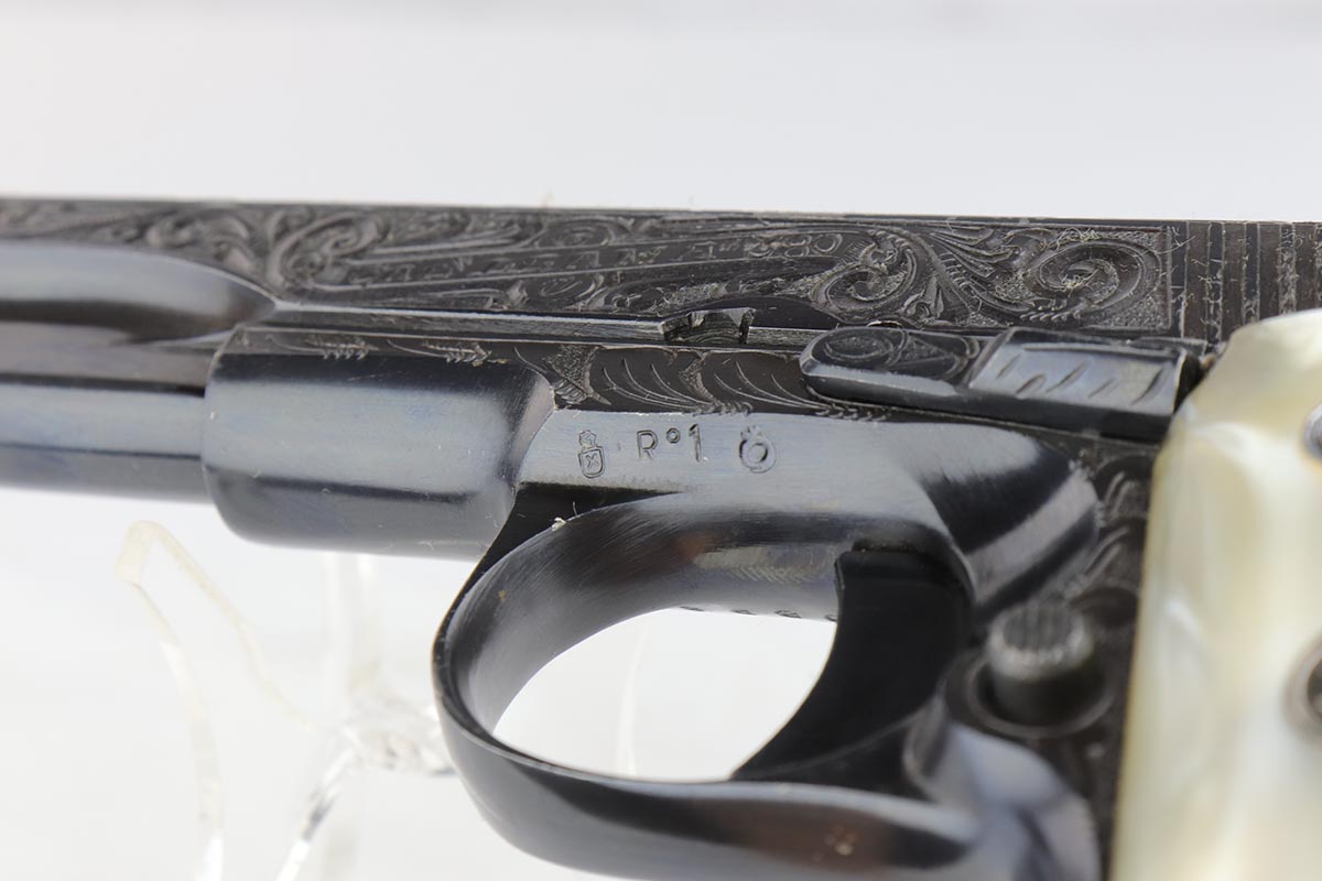 2/5/20 – This is a beautifully engraved LLama Mini 1911 in excellent, original condition. The bluing rates at 96-98% with minor edge slide wear on both sides. Beautifully engraved slide and frame. Exquisite mother of pearl grips. Minty bore.