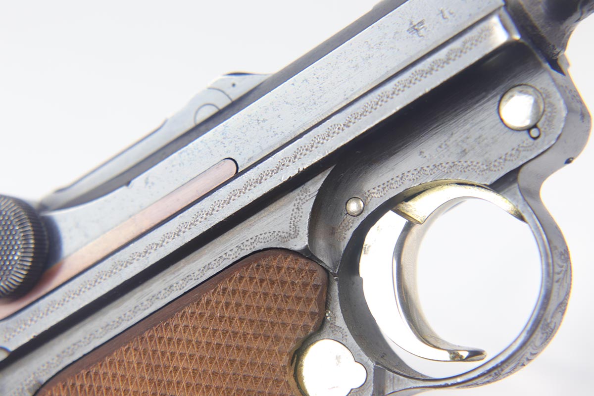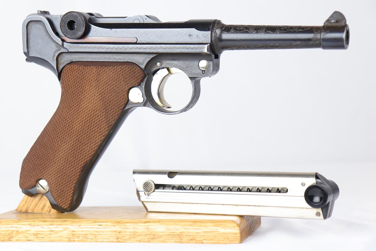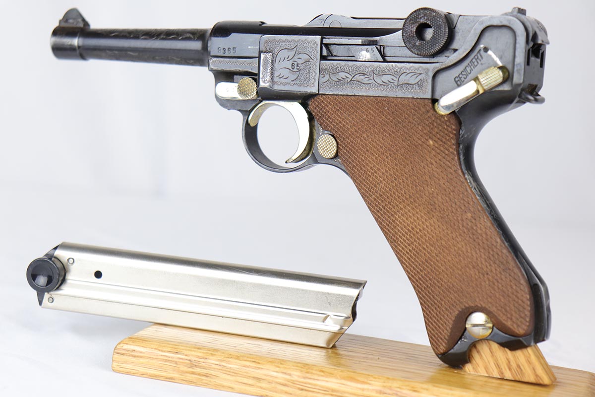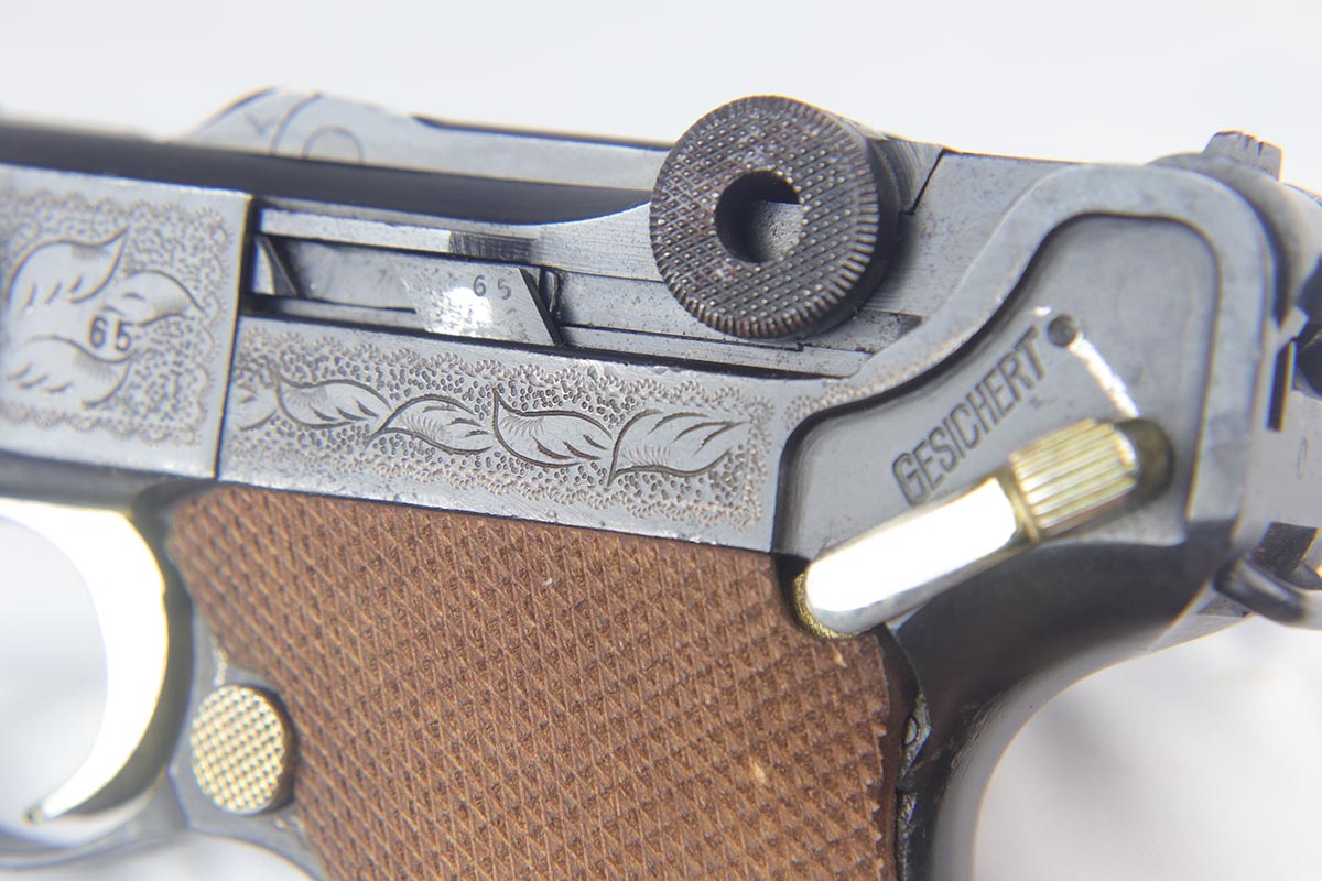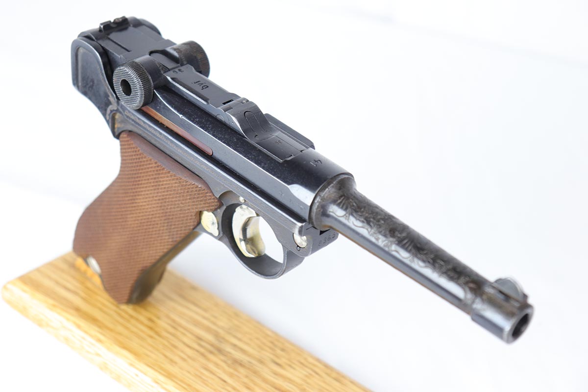 9/19/18 – This is an engraved Mauser Luger that was manufactured in 1941 for the Nazi Army. The pistol was then custom engraved following the war, likely ordered by the owner. There is also some gold wash on the small parts, that create a nice visual contrast. The bluing rates at about 95% with minor edge wear and some scratches/scuffs on the straps. The grips and magazine are post-war productions. Fantastic bore. The pistol is not fully matching, as parts of the toggle/slide assembly are mismatched from frame.