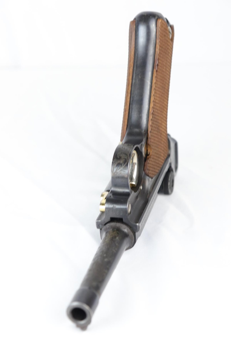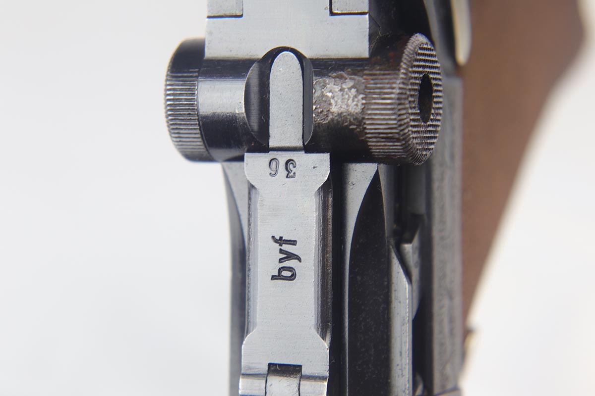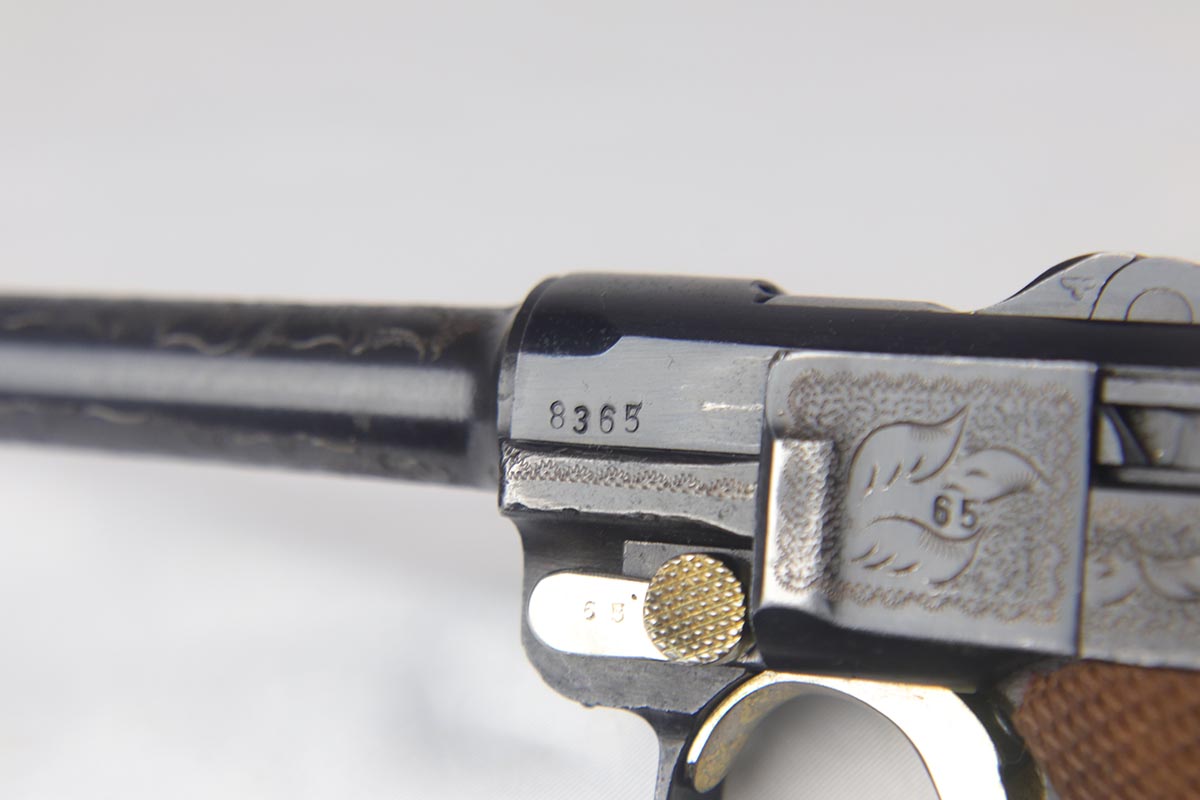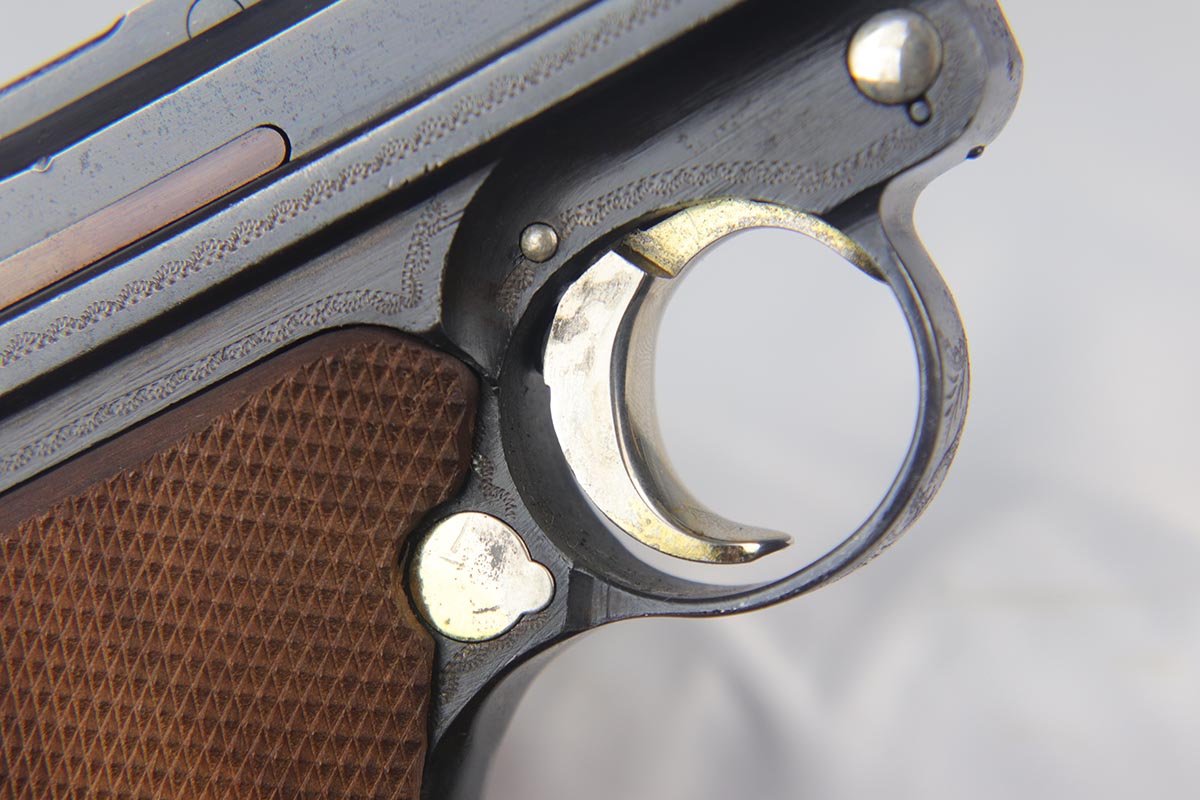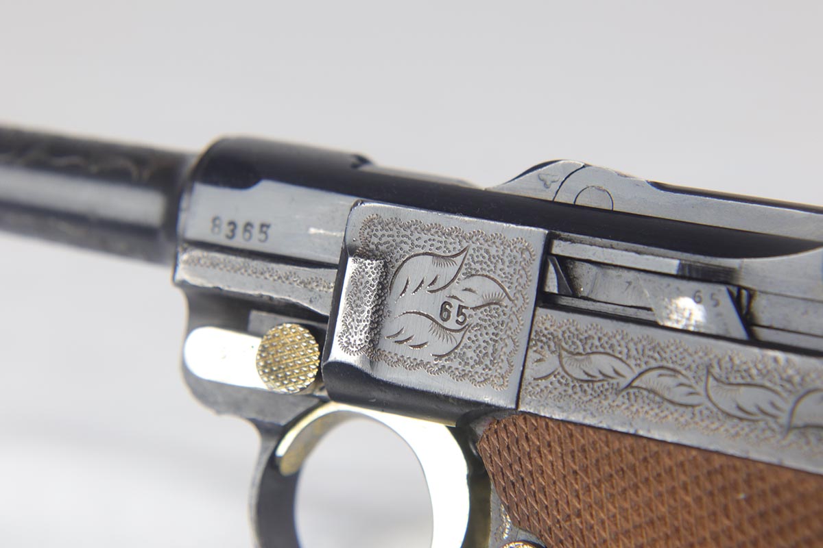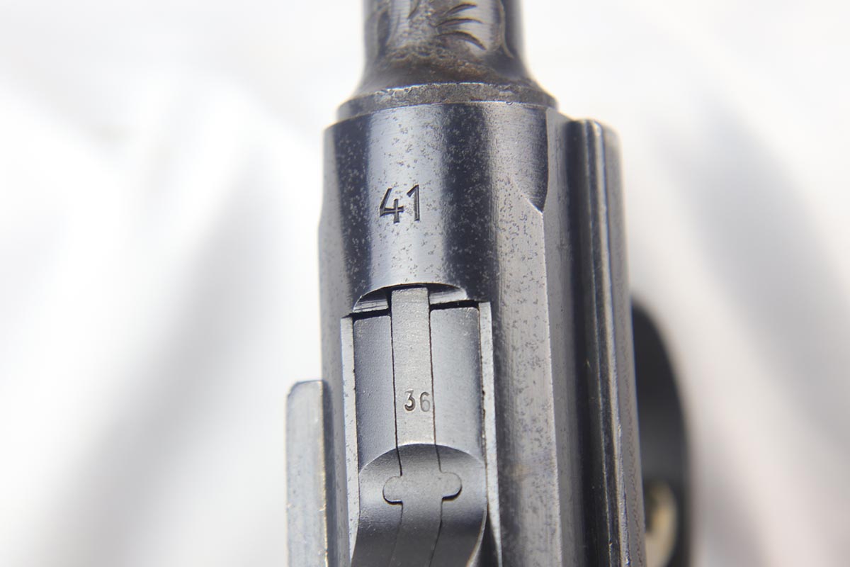 9/19/18 – This is an engraved Mauser Luger that was manufactured in 1941 for the Nazi Army. The pistol was then custom engraved following the war, likely ordered by the owner. There is also some gold wash on the small parts, that create a nice visual contrast. The bluing rates at about 95% with minor edge wear and some scratches/scuffs on the straps. The grips and magazine are post-war productions. Fantastic bore. The pistol is not fully matching, as parts of the toggle/slide assembly are mismatched from frame.