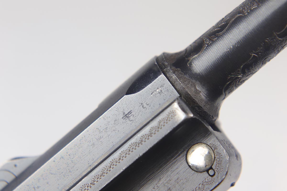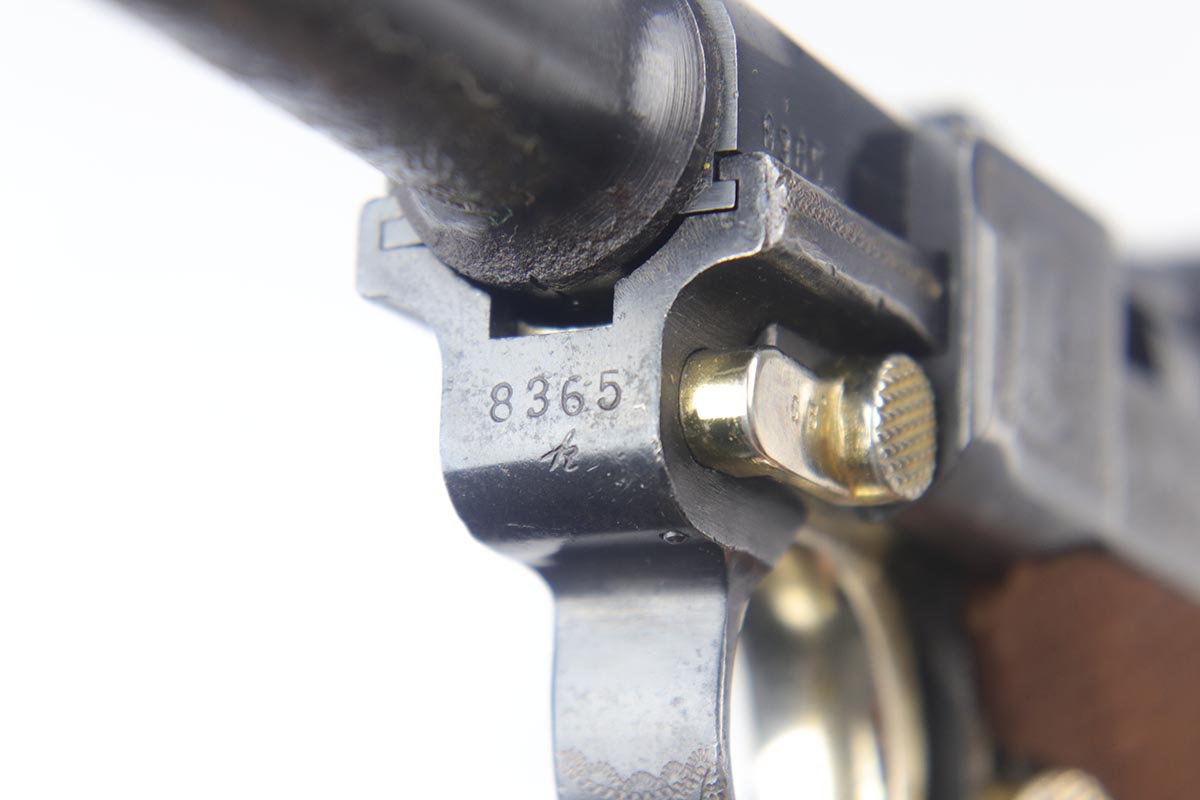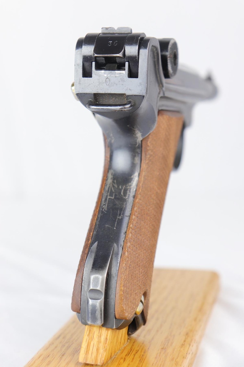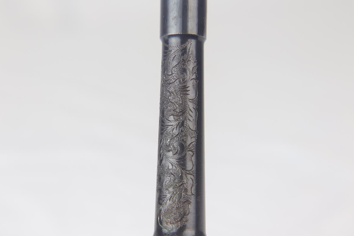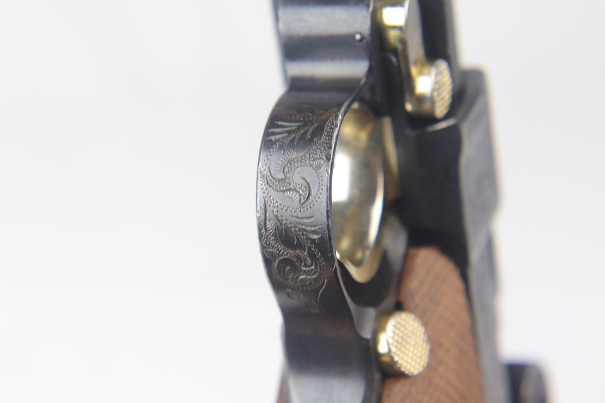 9/19/18 – This is an engraved Mauser Luger that was manufactured in 1941 for the Nazi Army. The pistol was then custom engraved following the war, likely ordered by the owner. There is also some gold wash on the small parts, that create a nice visual contrast. The bluing rates at about 95% with minor edge wear and some scratches/scuffs on the straps. The grips and magazine are post-war productions. Fantastic bore. The pistol is not fully matching, as parts of the toggle/slide assembly are mismatched from frame.