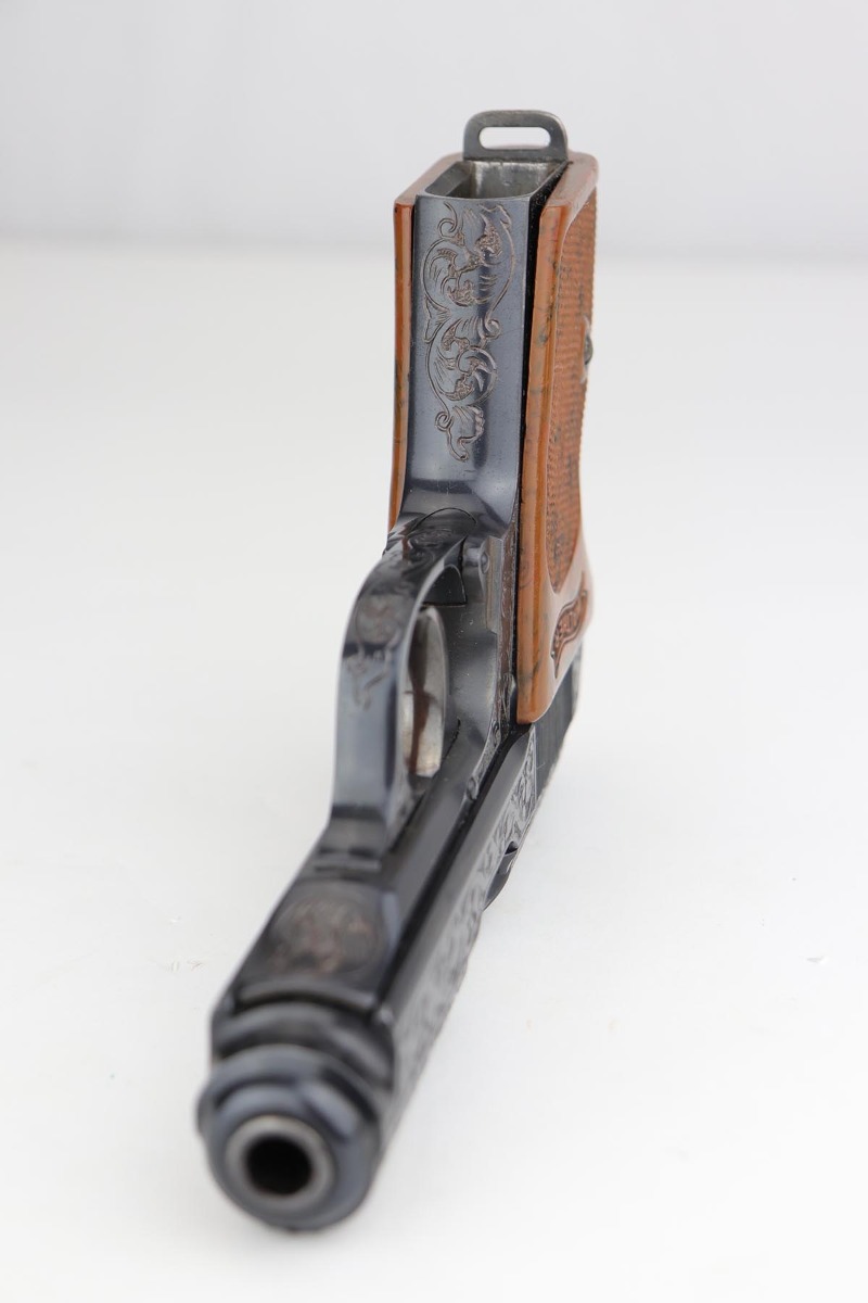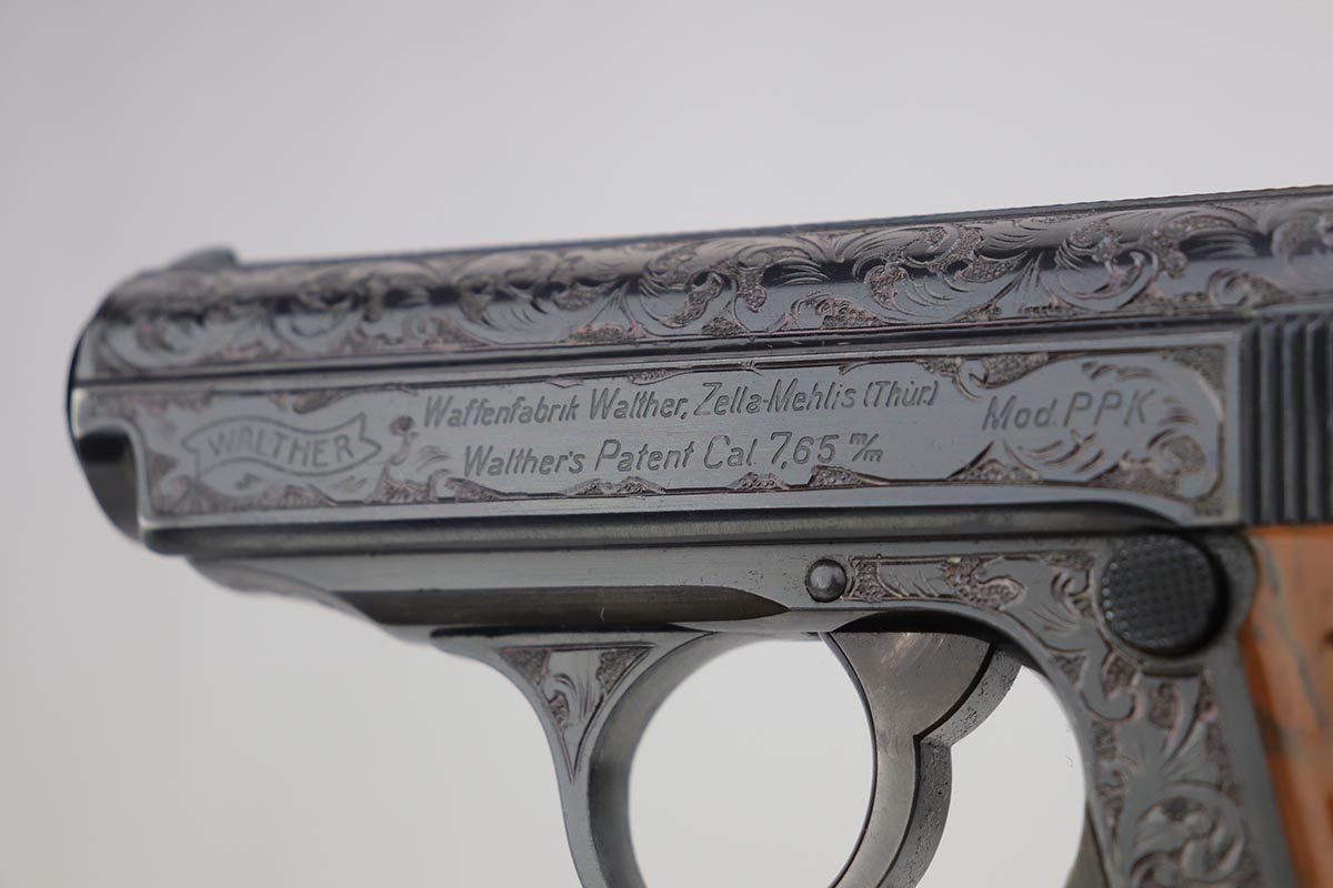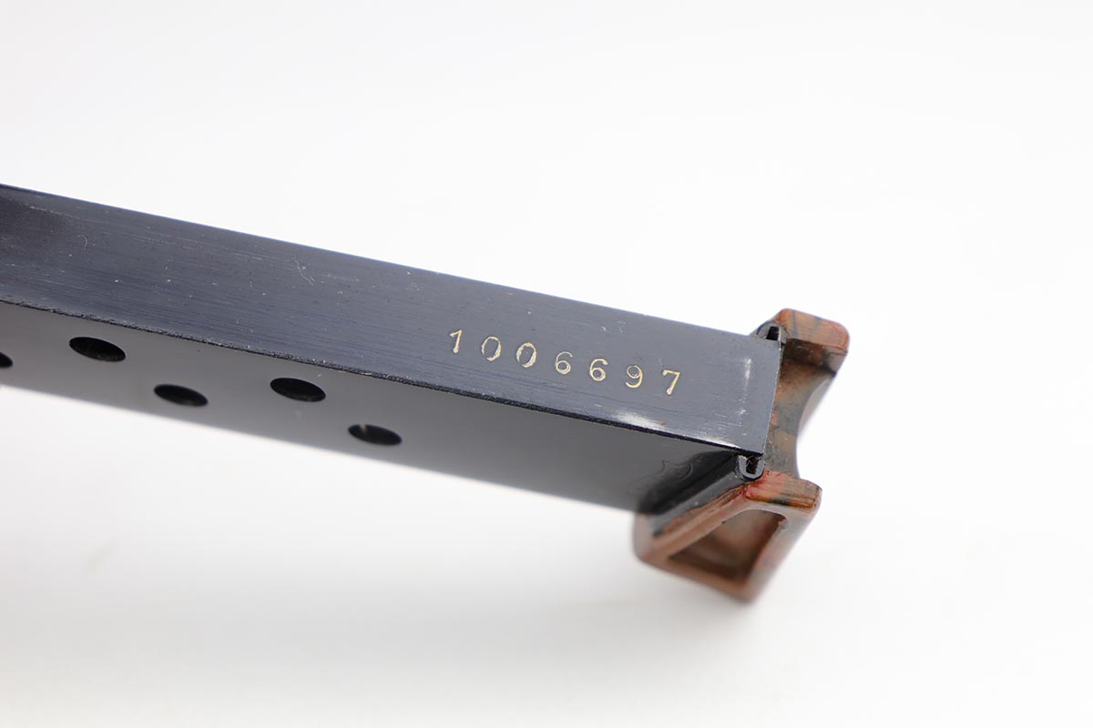 9/25/19 – This is a nearly one-of-a-kind pistol to have come through the office. Firstly, it is a very rare Police Walther PPK with million series serial number. In 1939, serial numbers began rolling over into seven digits until the Germans changed their mind and went back to six digits with a K-suffix. There were only about 7,000 such serials used, and only about 1,000 of them were Police marked and issued like this one. Secondly, the pistol was professionally engraved at some point following the war. This pistol has all of the polished blue remaining but would’ve been restored during the engraving process. The pistol has a correct, rare magazine with Police-style numbering that matches the serial number of the pistol. Bore is mint. Excellent grip and finger extension magazine.