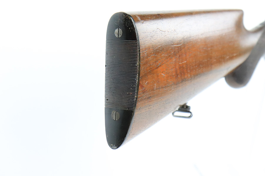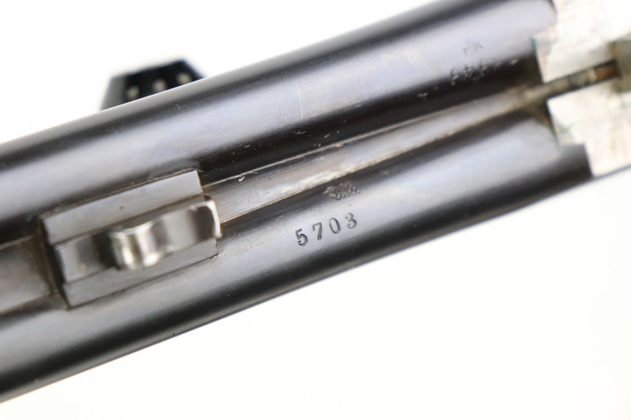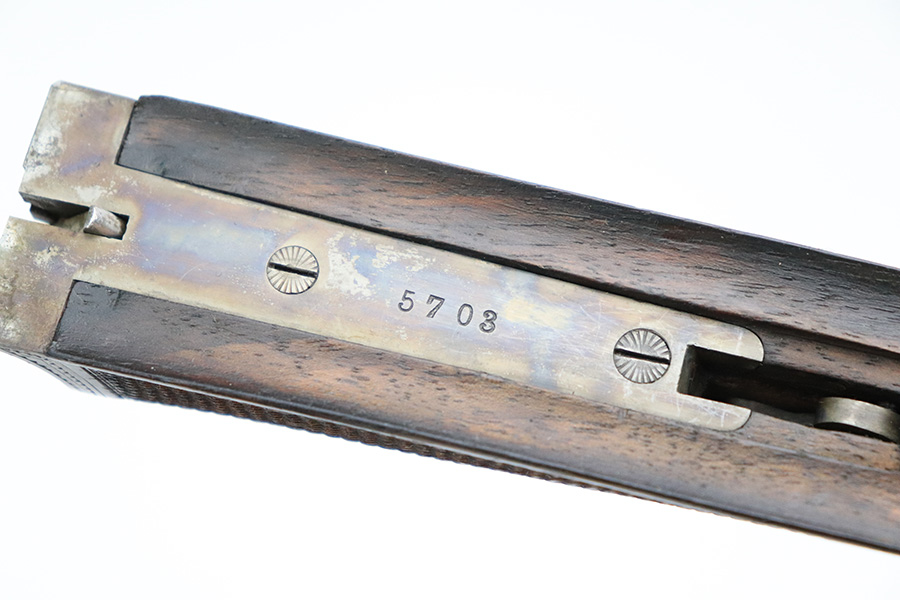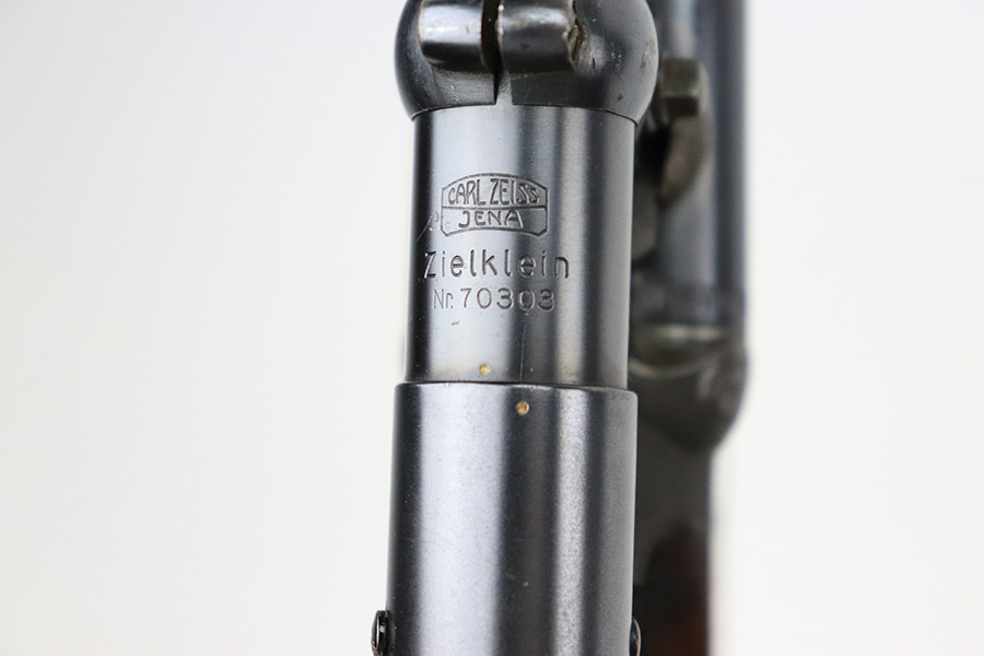 8/19/22 – This is a very nice example of a Pre-WW2 German Side-by-Side hunting rifle made by Otto Bock. The gun is all matching and has the proper German proofs throughout. The caliber on the underside of the barrel reads 6.3mm. The gun comes equipped with a very nice Carl Zeiss scope (good optics). The receiver features a very nice floral engraving pattern. There is virtually no finish loss along the barrels, but most of the case-hardening on the receiver has worn away, and there is some light spotty oxidation. It comes with an original horn trigger guard – some light scratches on the underside. The wood stock is very nice with only minor bruises and handling marks here and there. There are a few tiny bore holes in the butt plate. Excellent bores with strong rifling.
