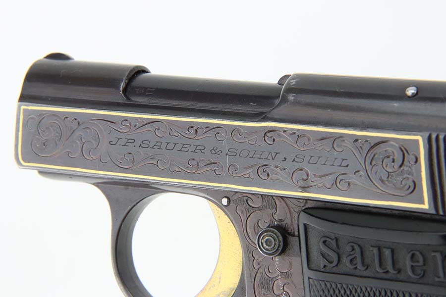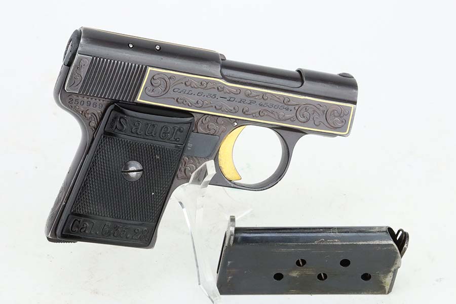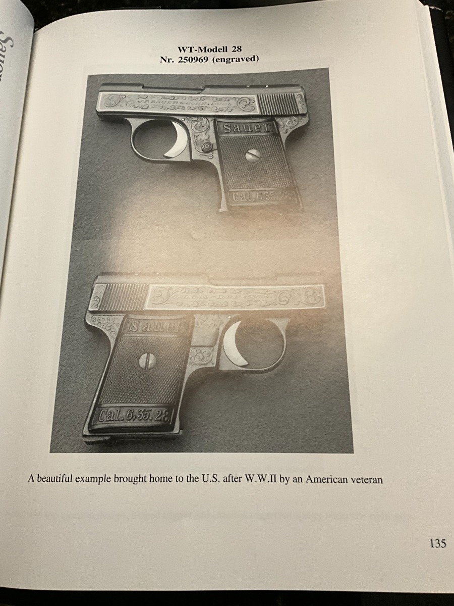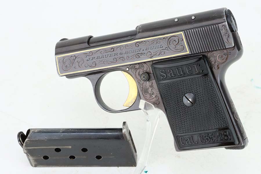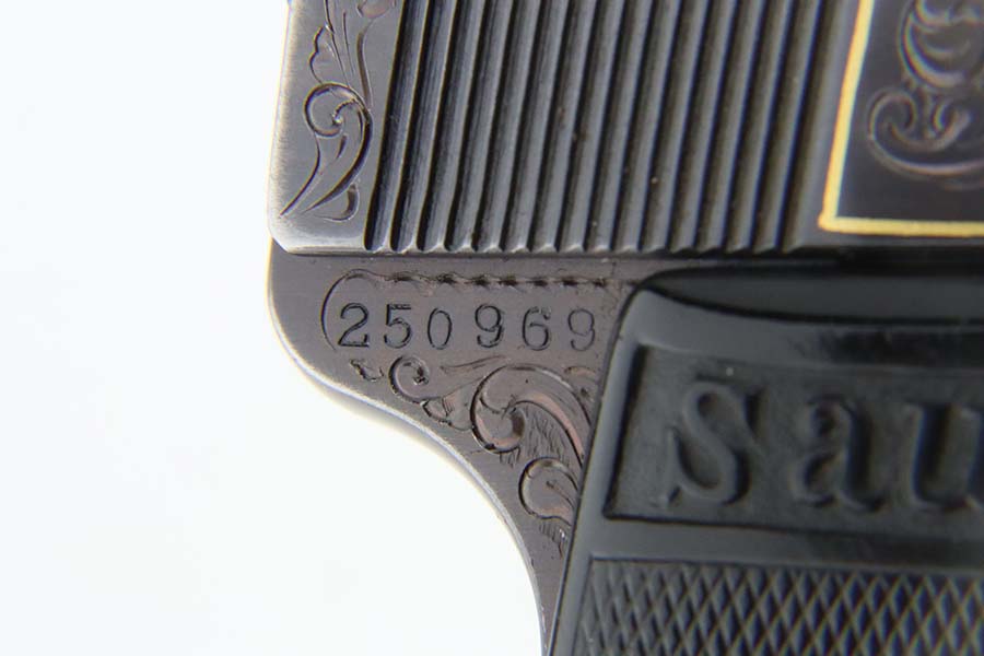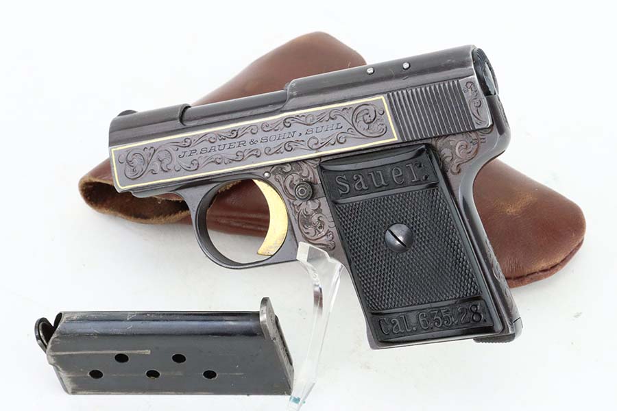 7/10/24 – This is a terrific example of a scarce Sauer pistol from the late 1920s. This is a WTM 28, second variant, one of only about 3,000 produced. In 1928 Sauer & Sohn introduced a new WTM which was named Model 28. The thrust of the new design was to simplify manufacture and thereby reduce production costs. The WTM 28 is 6mm shorter than its predecessor, not as tall or as thick, and 40 grams (1.4 ounces) lighter than the WTM 24. It is nearly identical in size to the Walther Model 9. The new design reduced the number of small parts that could fall out of the gun when it was disassembled, but required S&S to invent a new method of locking the slide to the frame. The cocking indicator pin is eliminated, as is the button to hold the grip plates and the full-length recoil spring guide rod. The grip plates on the WTM 28 are held in place by a screw in the center. The new design also incorporates a magazine safety. This one has a beautiful filigree engraving pattern and has some gold highlights. Comes with a proper magazine and a nice leather pocket holster. This exact gun is featured in Cate and Krause’s JP Sauer book (see photos).