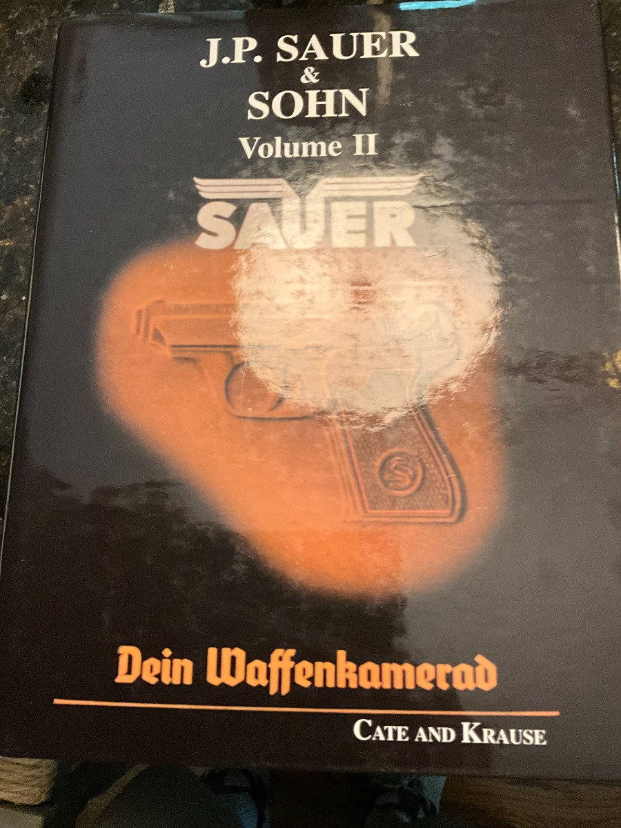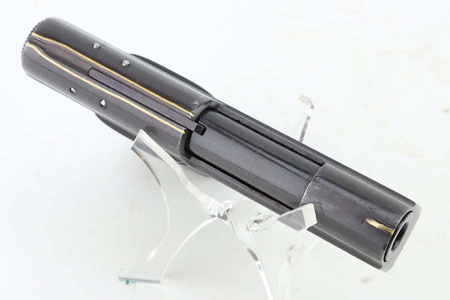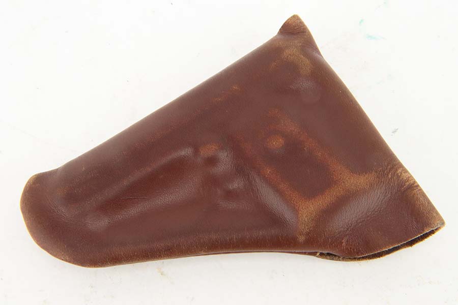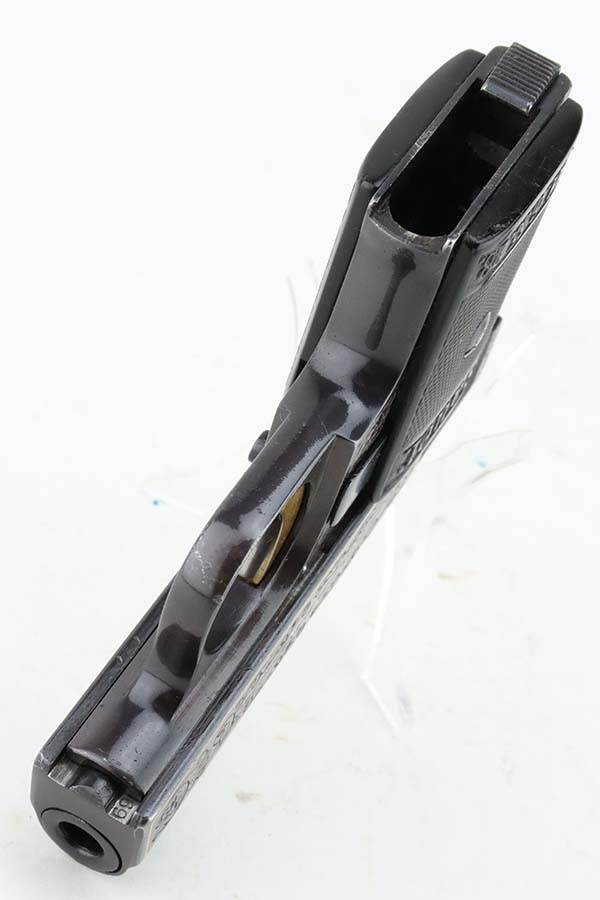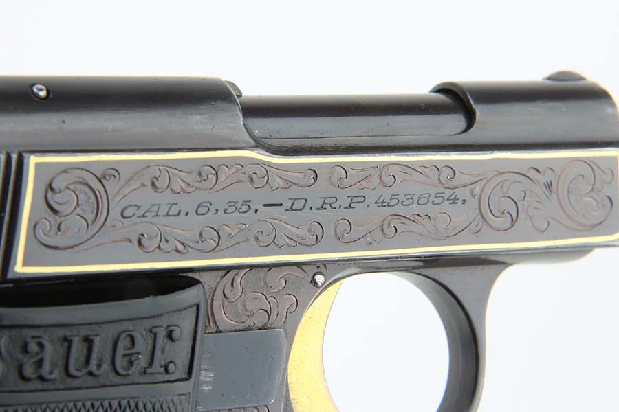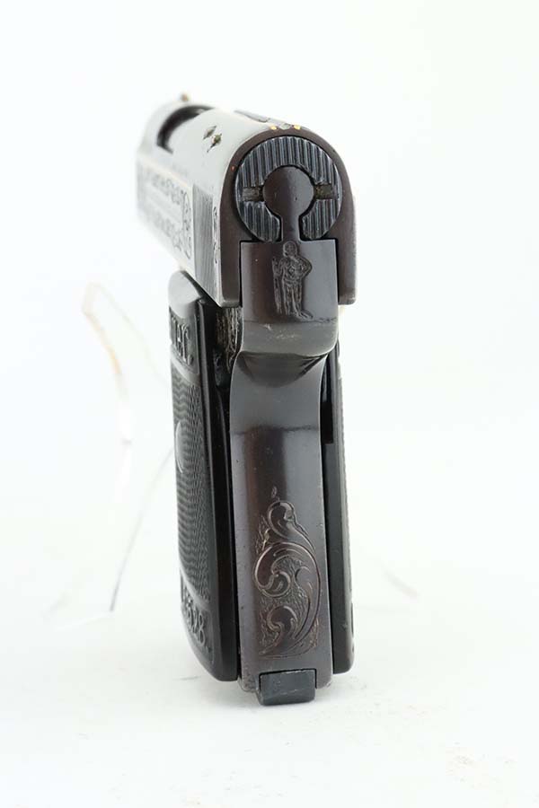 7/10/24 – This is a terrific example of a scarce Sauer pistol from the late 1920s. This is a WTM 28, second variant, one of only about 3,000 produced. In 1928 Sauer & Sohn introduced a new WTM which was named Model 28. The thrust of the new design was to simplify manufacture and thereby reduce production costs. The WTM 28 is 6mm shorter than its predecessor, not as tall or as thick, and 40 grams (1.4 ounces) lighter than the WTM 24. It is nearly identical in size to the Walther Model 9. The new design reduced the number of small parts that could fall out of the gun when it was disassembled, but required S&S to invent a new method of locking the slide to the frame. The cocking indicator pin is eliminated, as is the button to hold the grip plates and the full-length recoil spring guide rod. The grip plates on the WTM 28 are held in place by a screw in the center. The new design also incorporates a magazine safety. This one has a beautiful filigree engraving pattern and has some gold highlights. Comes with a proper magazine and a nice leather pocket holster. This exact gun is featured in Cate and Krause’s JP Sauer book (see photos).