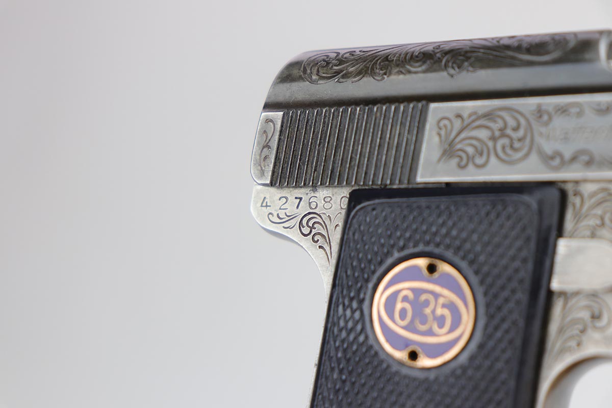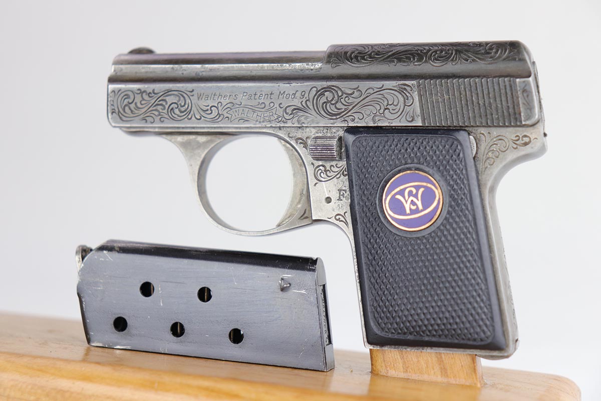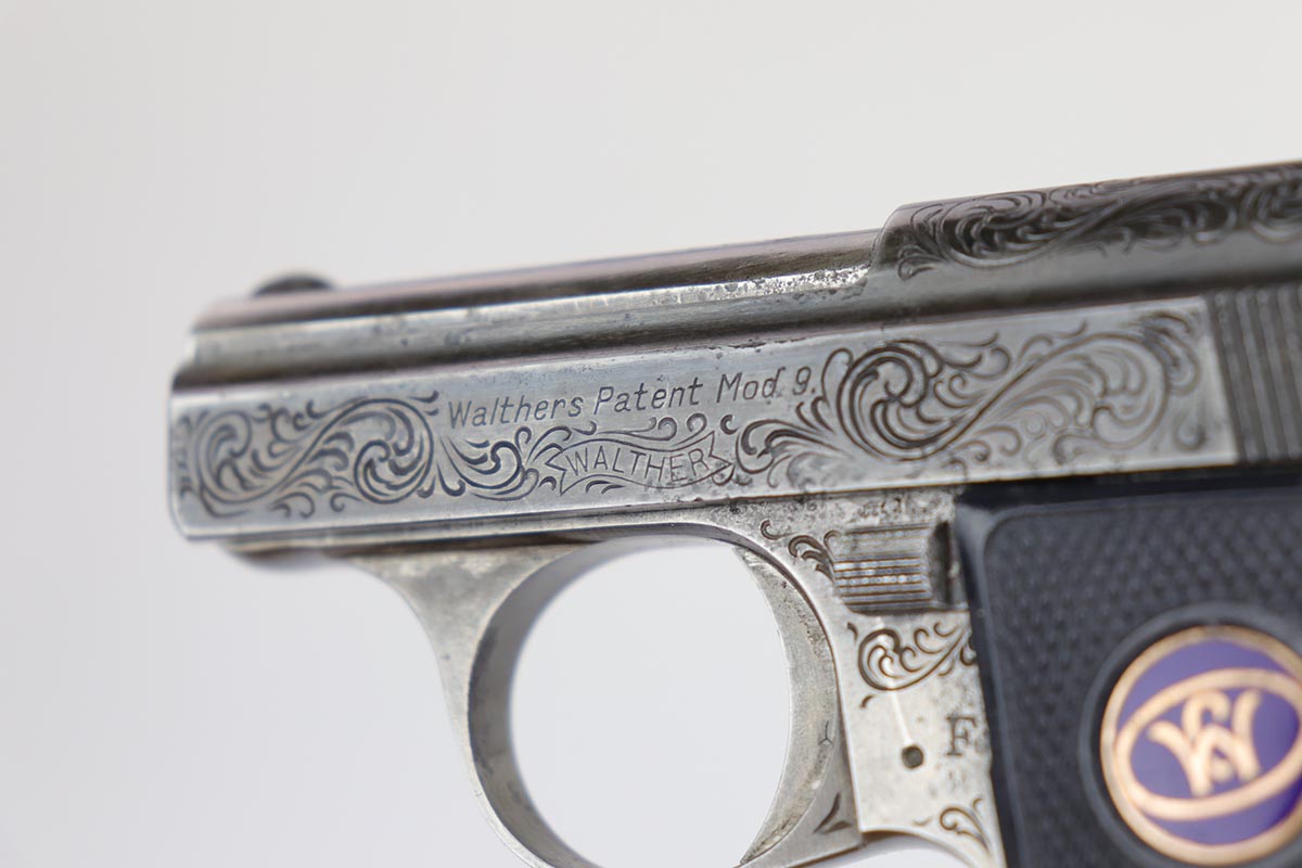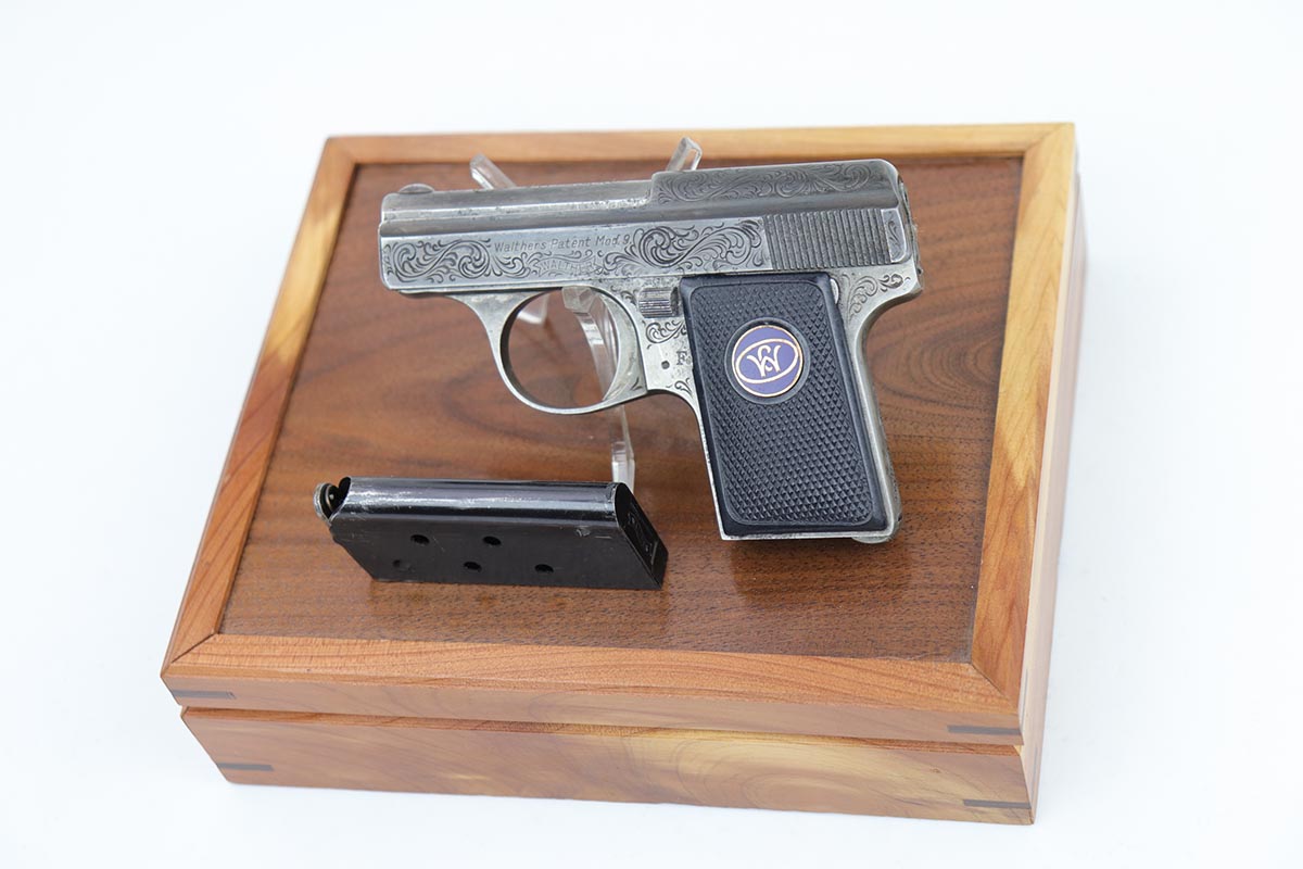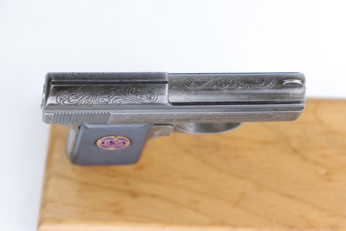 3/4/20 – This is a very nicely engraved Walther Model 9 in a custom presentation case. The pistol is a type one example, made in the early 1920s, and was post-factory engraved at some point. It’s very nice engraving work with smooth, clean lines. The finish has thinned over time, especially on the frame. Nice grips with only minor handling wear. Bore has some clear signs of use and pitting in the grooves.