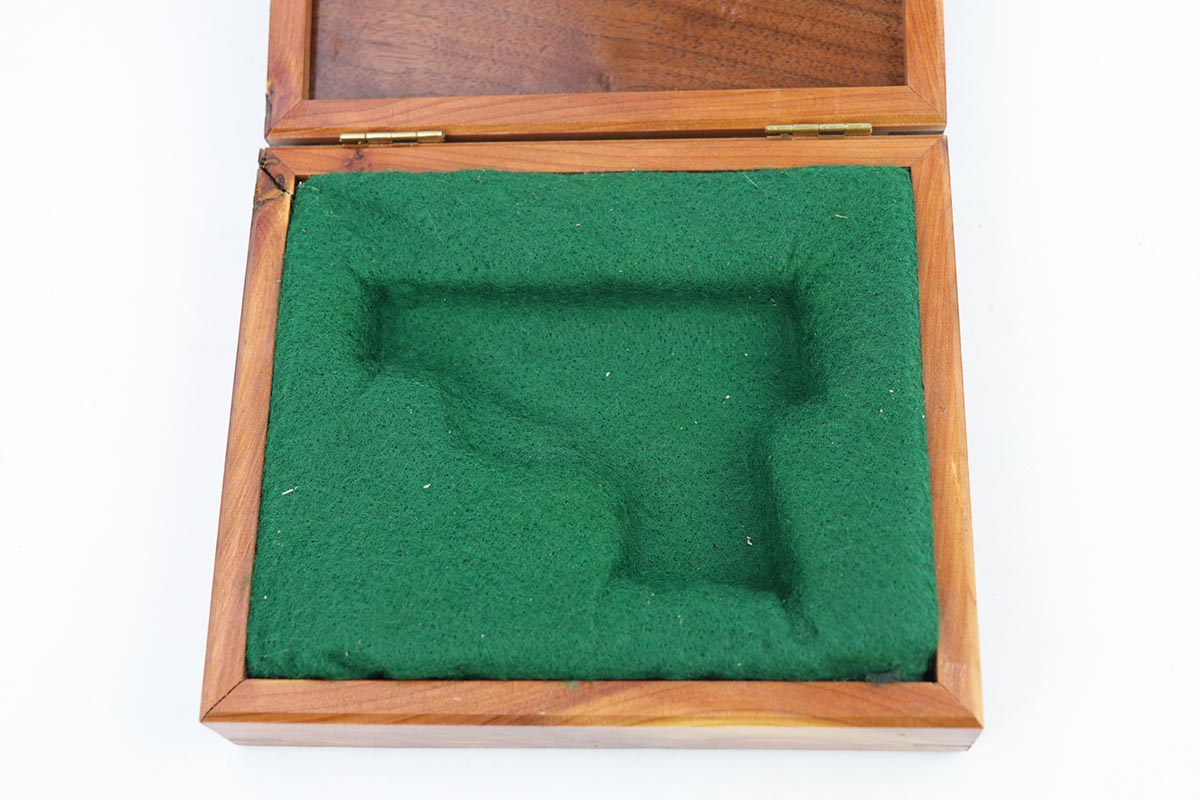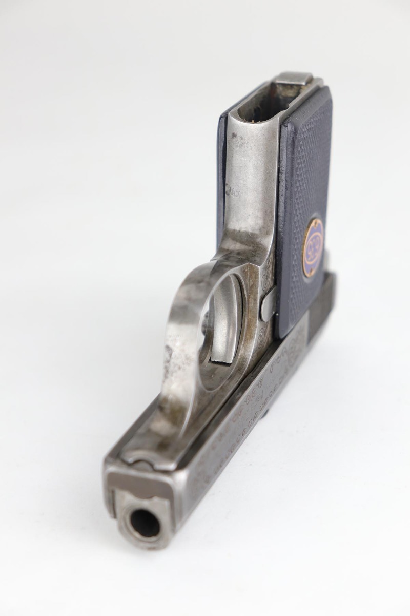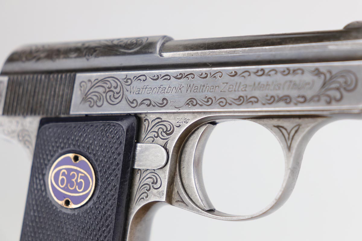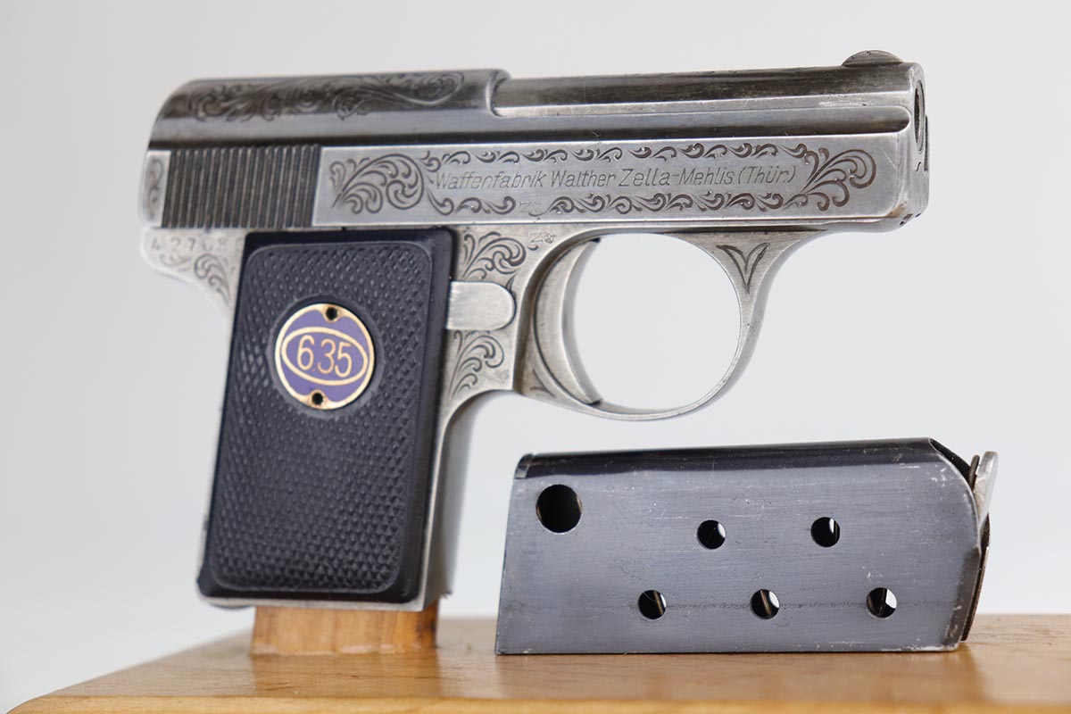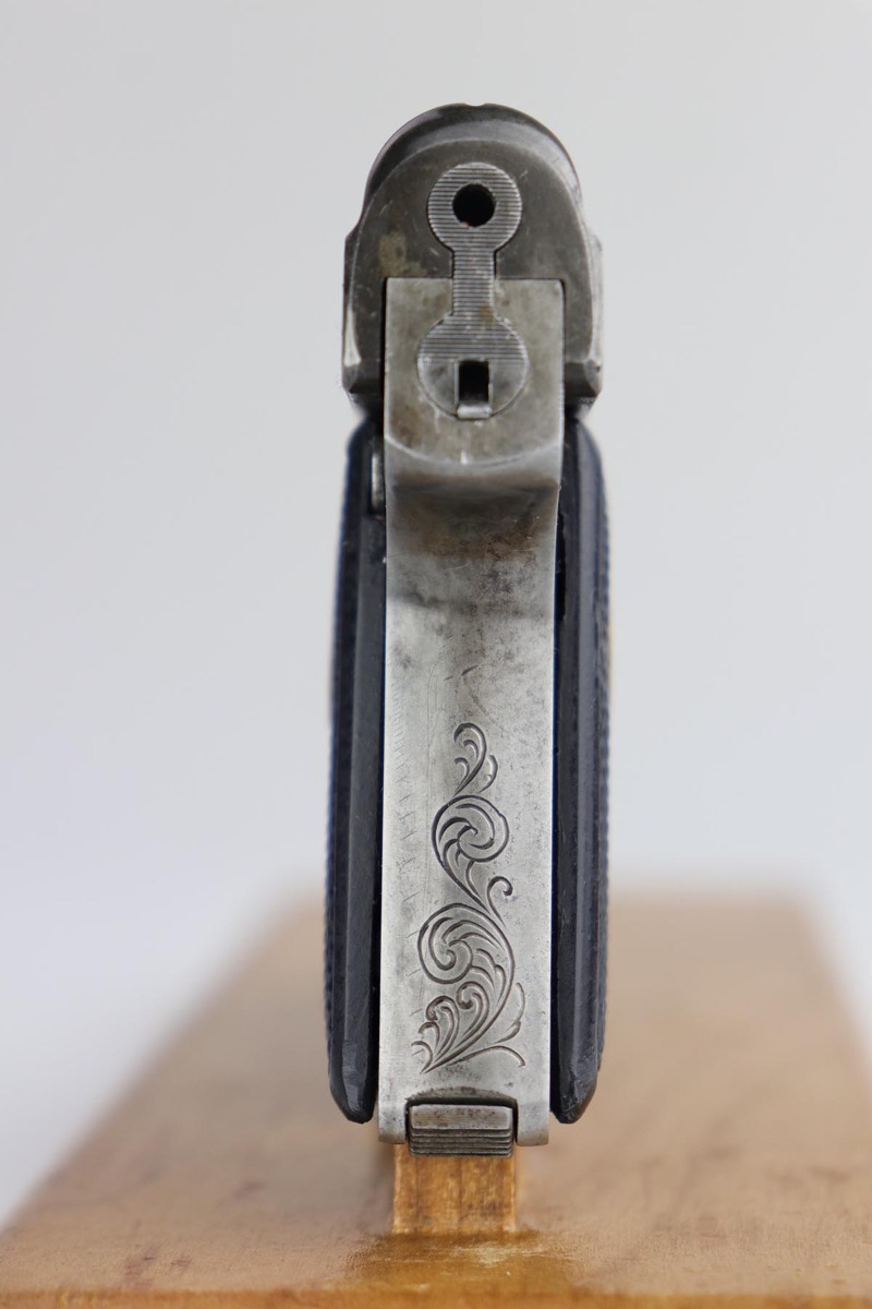 3/4/20 – This is a very nicely engraved Walther Model 9 in a custom presentation case. The pistol is a type one example, made in the early 1920s, and was post-factory engraved at some point. It’s very nice engraving work with smooth, clean lines. The finish has thinned over time, especially on the frame. Nice grips with only minor handling wear. Bore has some clear signs of use and pitting in the grooves.