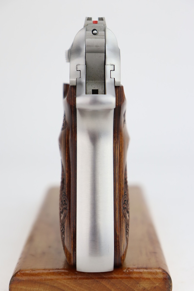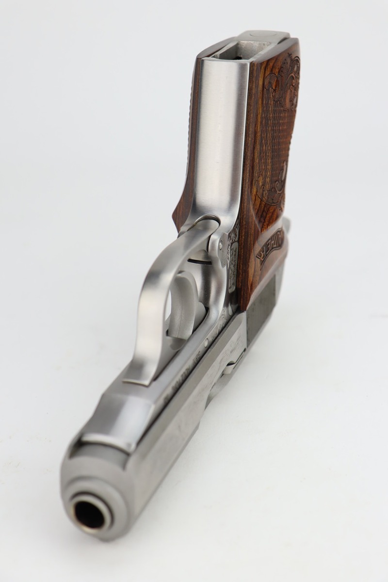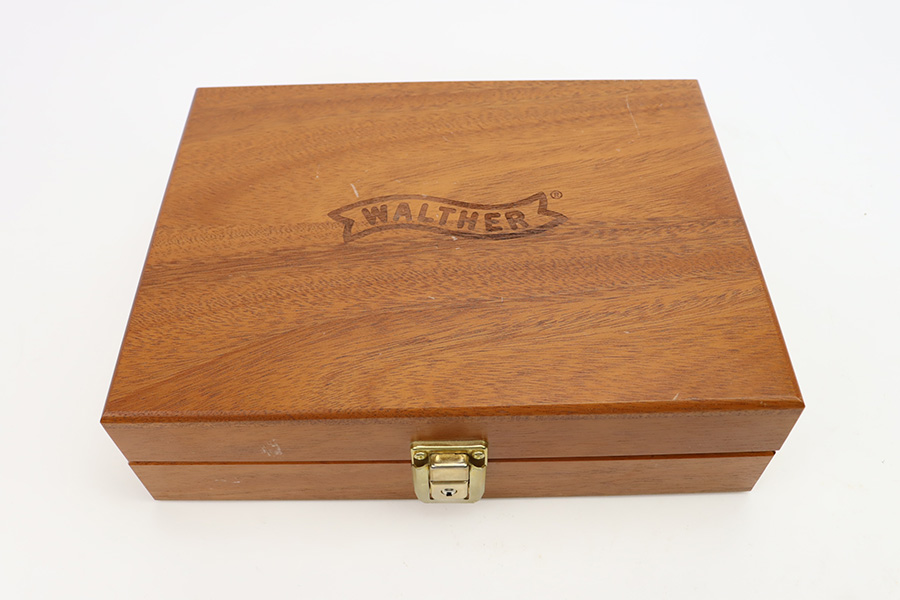 12/5/23 – This is a near-mint Walther PPK/S-1 that was produced under license by Smith & Wesson. It appears to be in unfired condition but there is a single surface scuff/scratch on the front strap. Classic configuration in .380 ACP with ergonomically sculpted walnut grips with laser cut checkering and acanthus scroll, with “WALTHER” in iconic banner at top of grips. Sparse laser engraving of acanthus scroll. Factory red paint used to simulate i-dot sights. Mint bore. Comes with the original presentation box. FFL required.