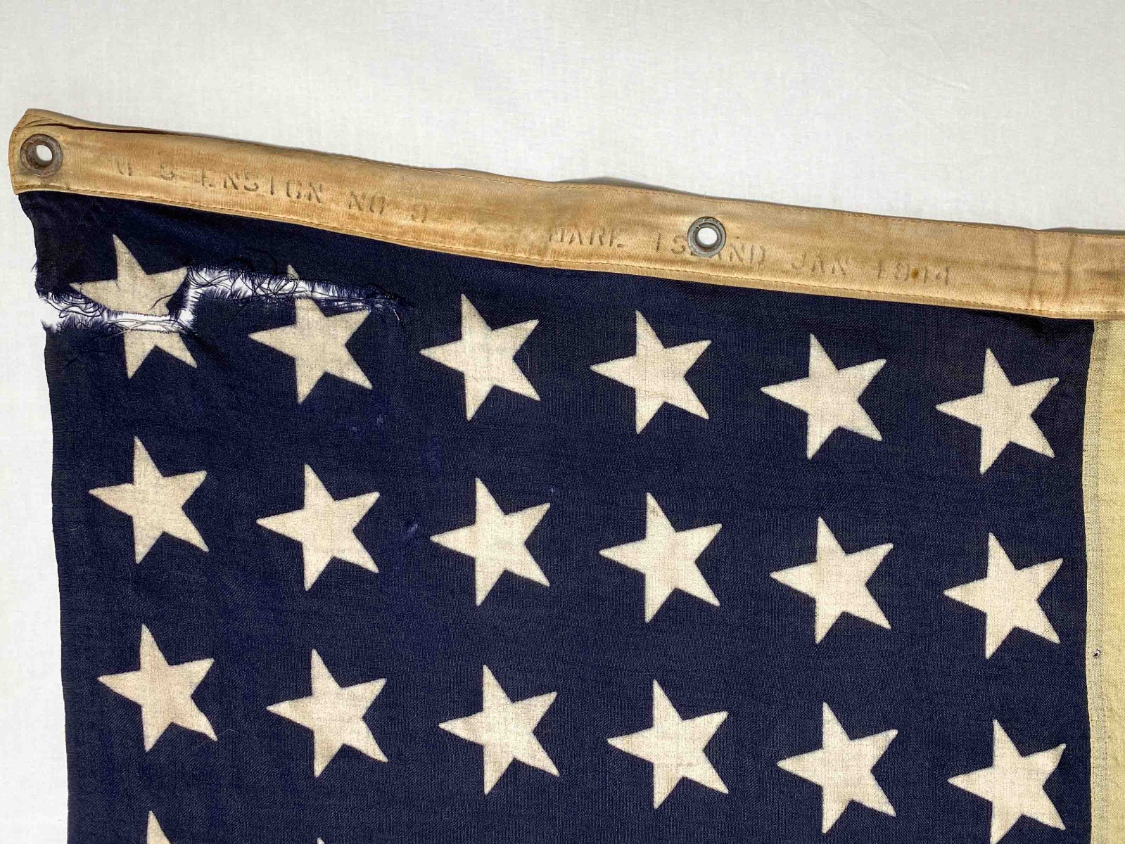 2/5/20 – This is a unique and fairly rare WW2 U.S. Ensign No 9 Mare Island flag. The flag is also dated Jan 1944. The Ensign flags were designated for the navy, and based on the photos you can see that this flag was flown during the war. Although tattered and worn, the flag still holds together and is one piece. Overall size is 44in x 58in. The flag is ink stamped as shown in photos. A very cool piece of US history.