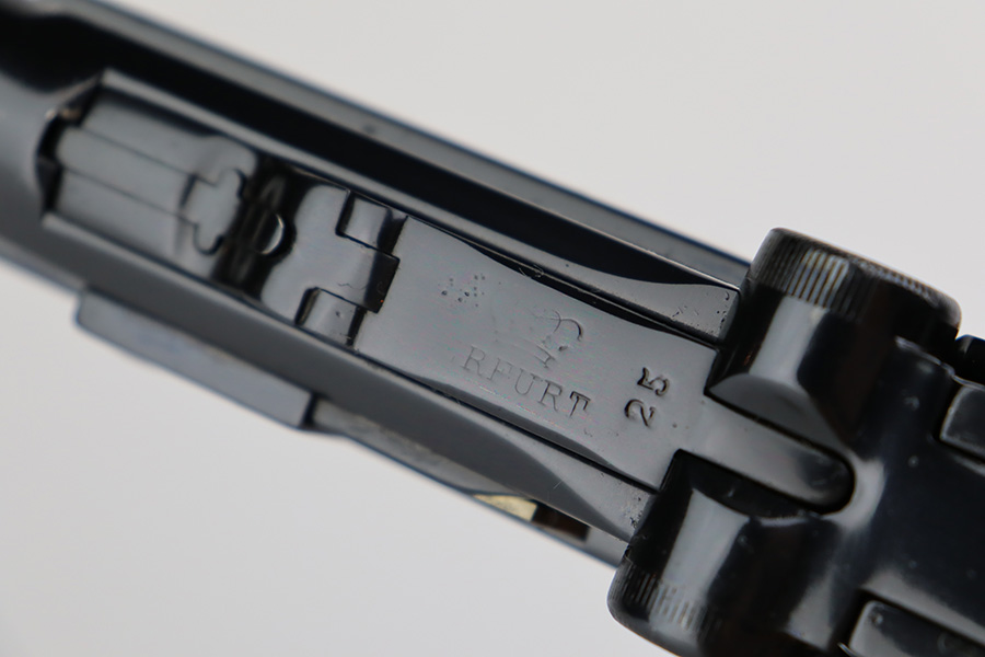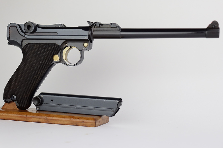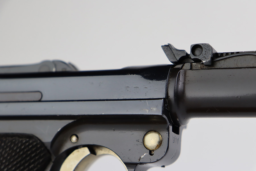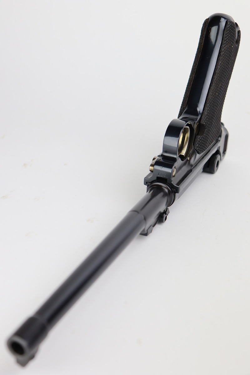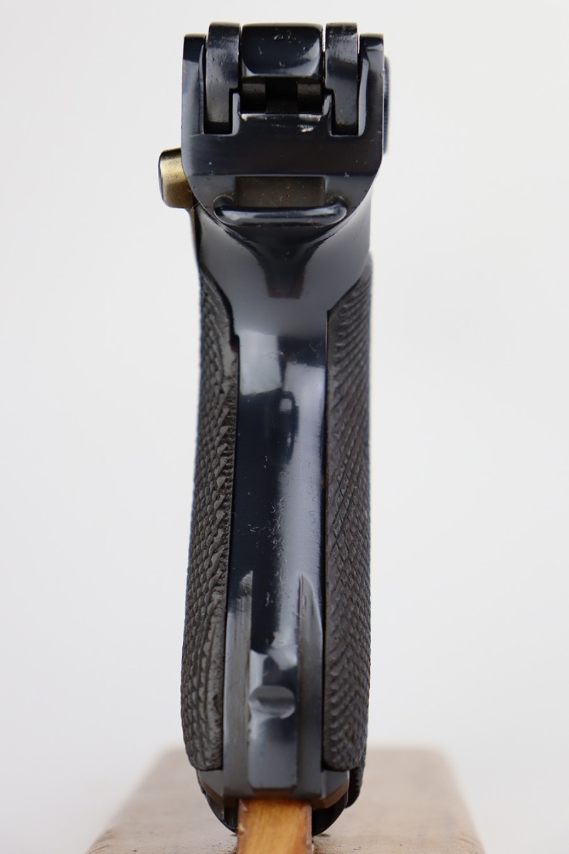 7/12/23 – This is a nice example of a “shooter” Erfurt Artillery Luger. The entire gun has been refinished, and it is mismatched. Un-numbered barrel. There is very little finish loss, just a small area of light scratchy wear on the left side of the frame. Fitted with nice wood grips and comes with one reproduction magazine. The bore has strong rifling with some light freckling in the grooves.