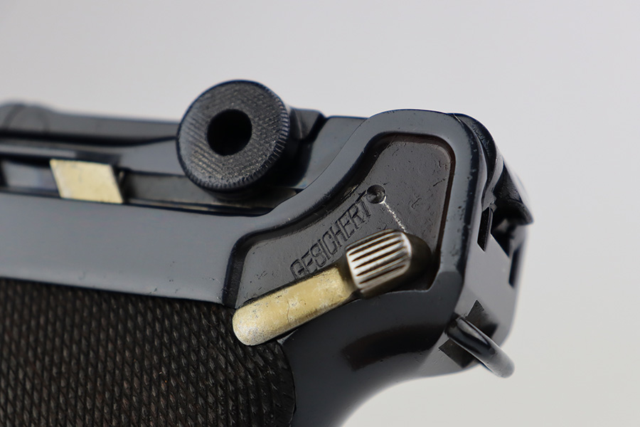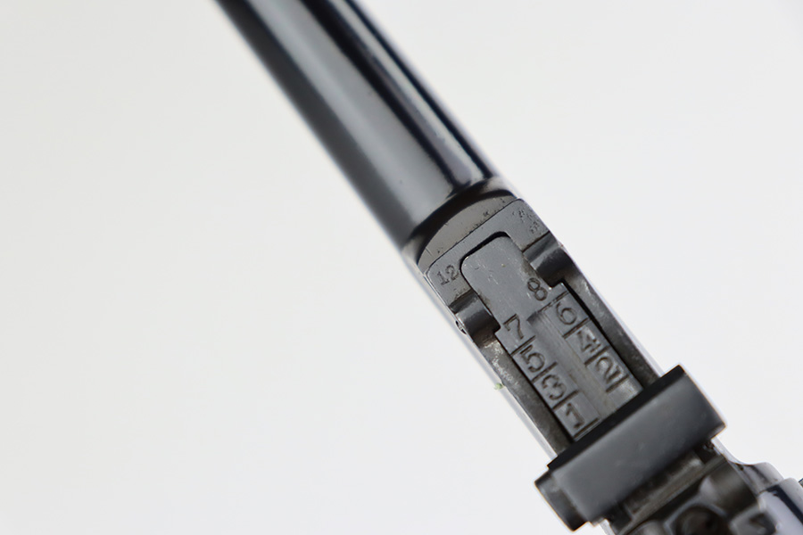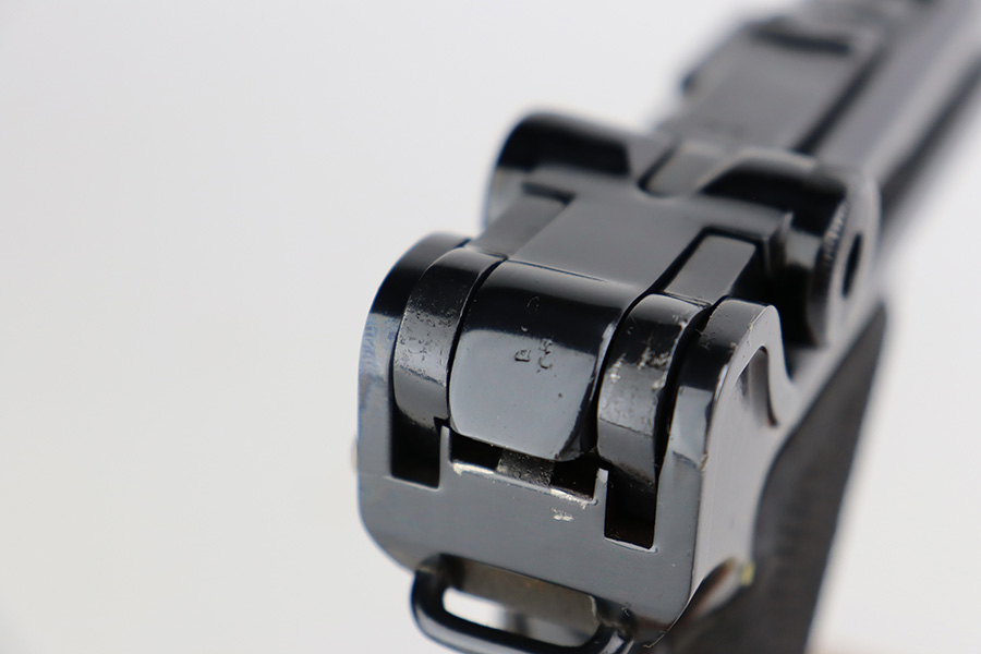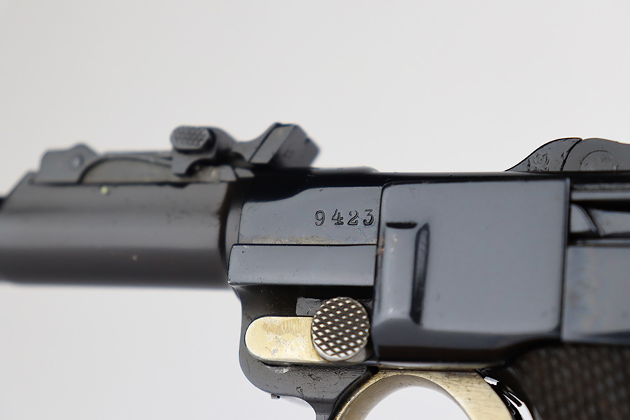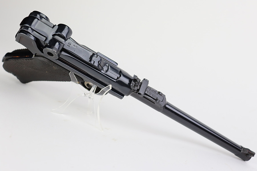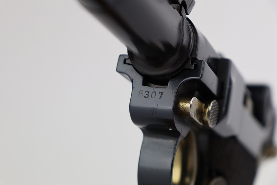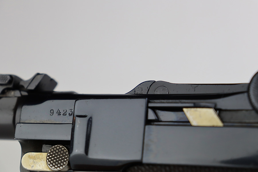 7/12/23 – This is a nice example of a “shooter” Erfurt Artillery Luger. The entire gun has been refinished, and it is mismatched. Un-numbered barrel. There is very little finish loss, just a small area of light scratchy wear on the left side of the frame. Fitted with nice wood grips and comes with one reproduction magazine. The bore has strong rifling with some light freckling in the grooves.
