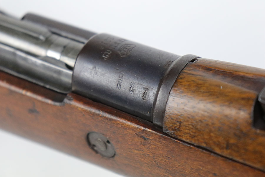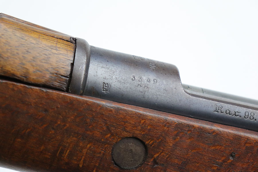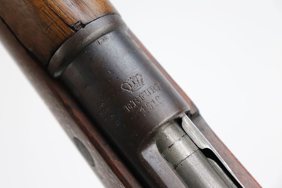 8/17/20 – This is an all matching and original Erfurt Kar98 from 1916. The bluing is a little tough to rate on this one as there isn’t much finish loss but there is patina throughout. All numbered parts are matching, including the front sight, bayo lug, bands, bolt assembly, stock, trigger group, adjustable rear sight, etc. There’s also Imperial proofs all over the rifle, with several clear stamps on the stock. The stock is in great shape with standard nicks and dings but no major defects. Bore has very strong rifling but some pitting in the grooves.