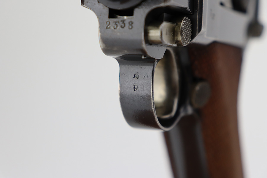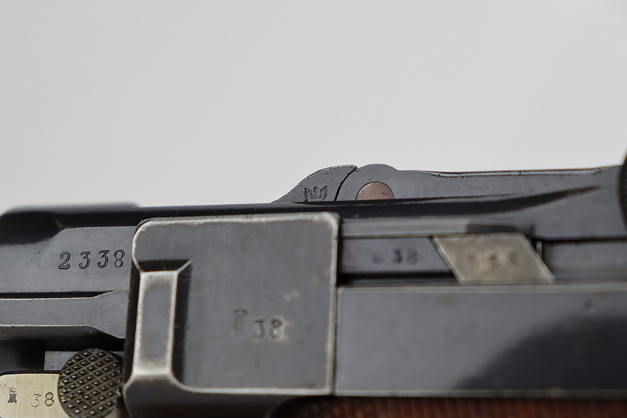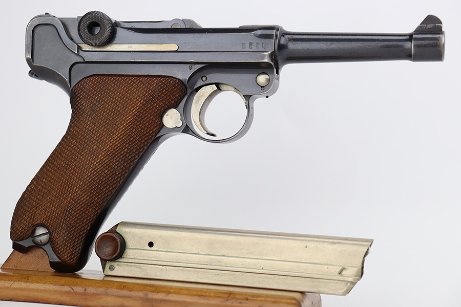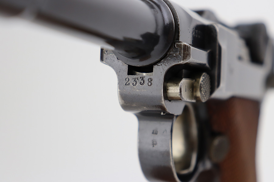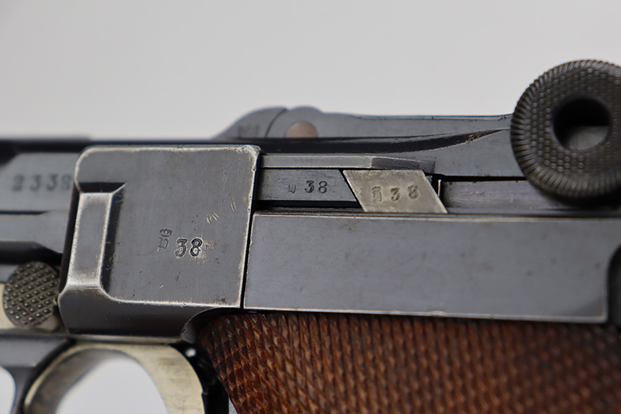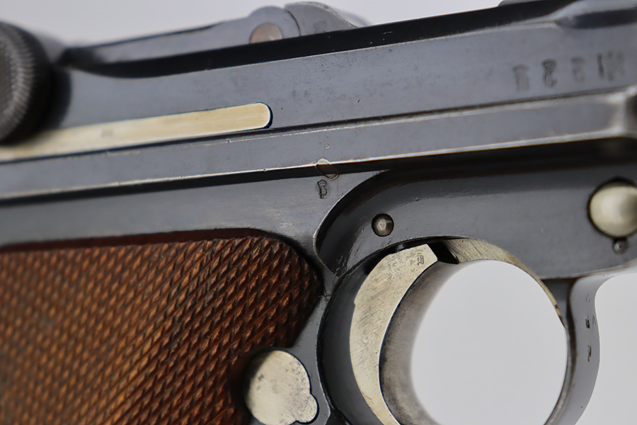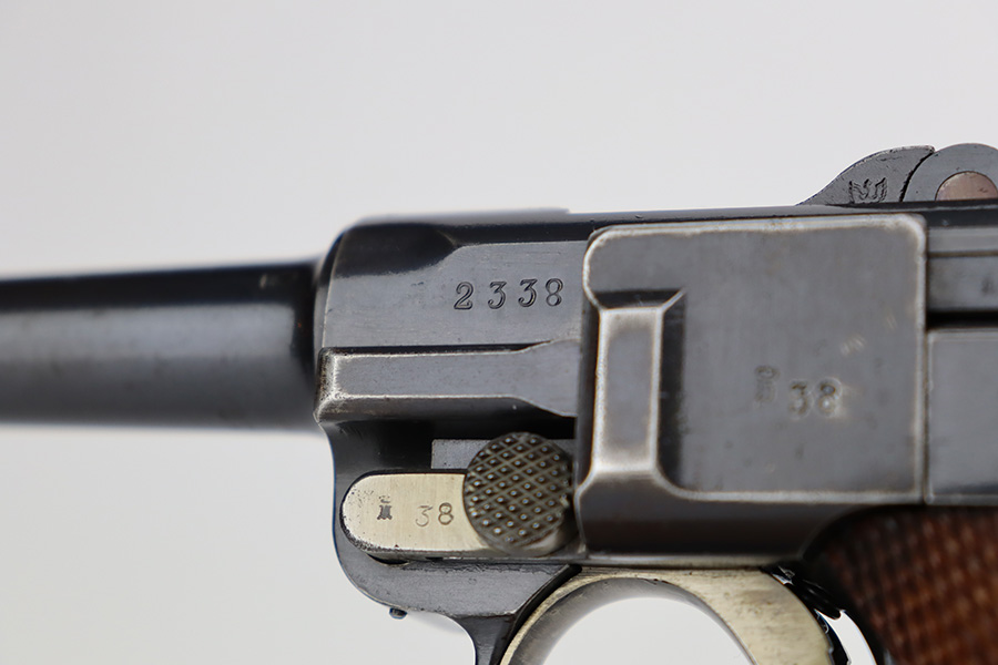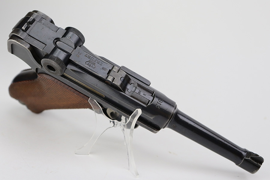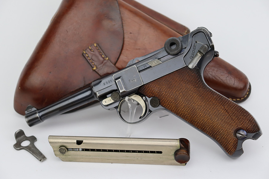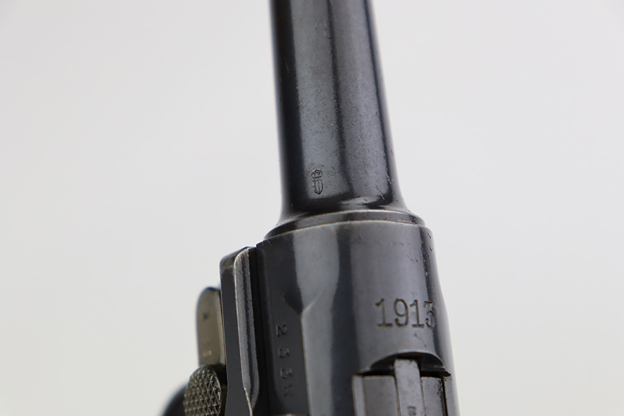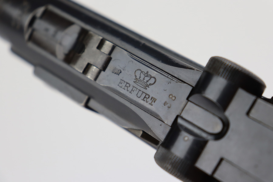 7/7/23 – This is a nice, early example of a military Erfurt Luger from 1913, before the introduction of the stock lug on the frame. All matching numbers throughout, including the original grips. Period original but mismatched magazine. Finish loss on the muzzle, sideplate, ears and general thinning on the straps. Bore has strong rifling but some frost throughout. Grips are in excellent condition with no cracks or chips. Original grip screws are present with Erfurt proofs on each. Listing includes an original Imperial-marked tool and a rare holster with ’13 date. The holster is in excellent condition with minor cracking of the closure strap but no notable defects otherwise.