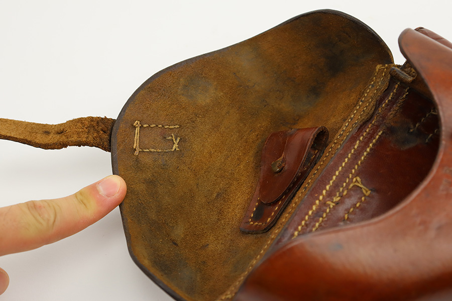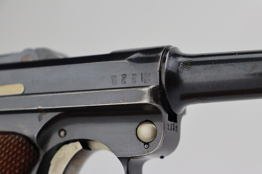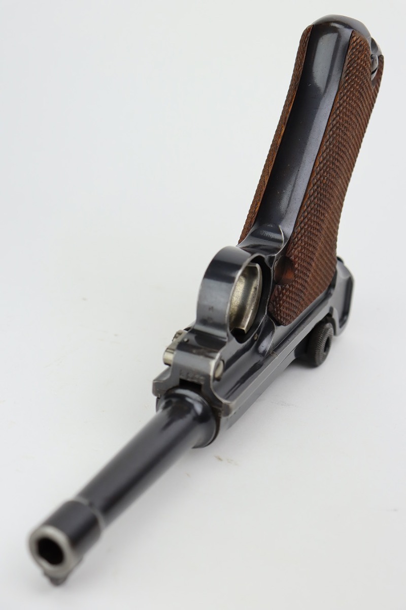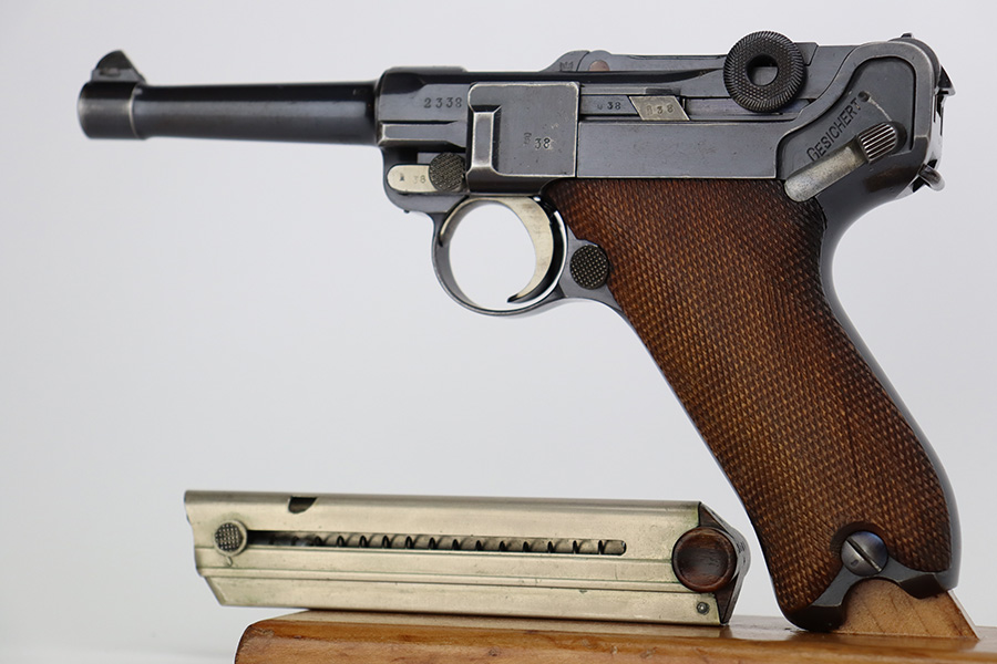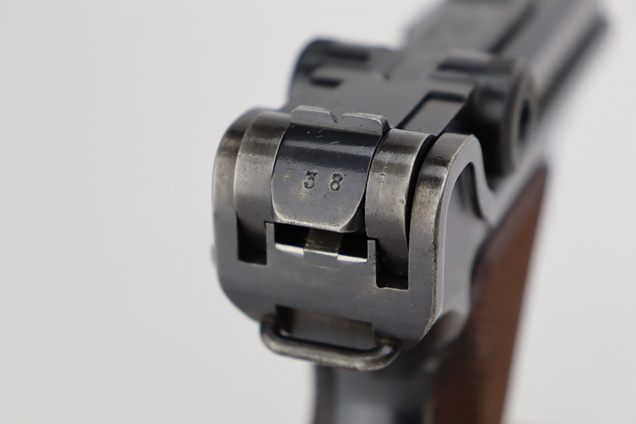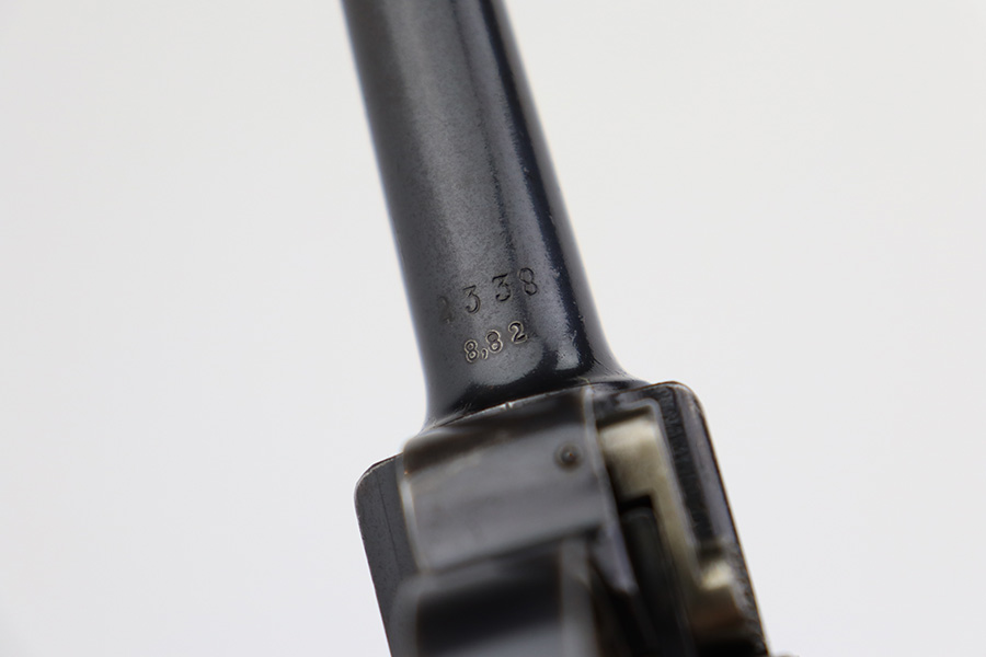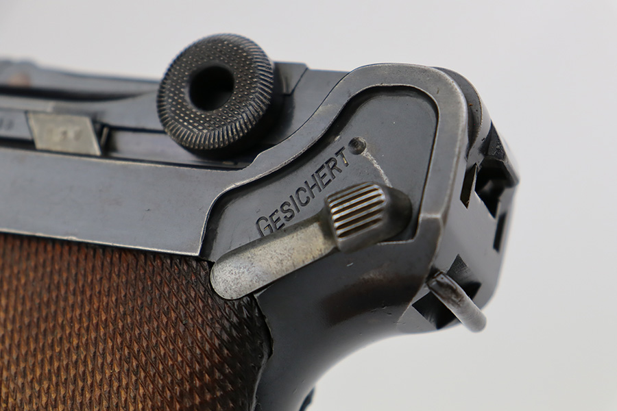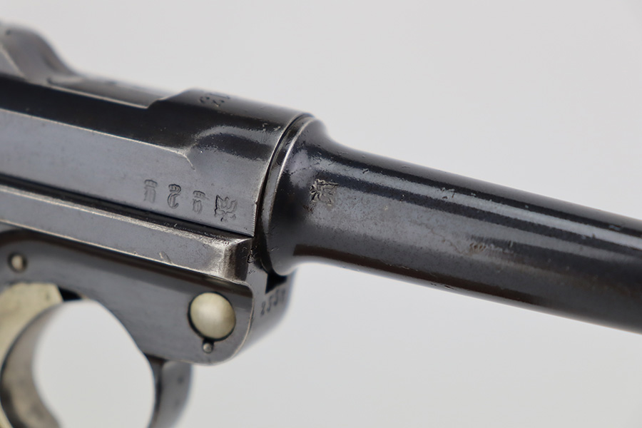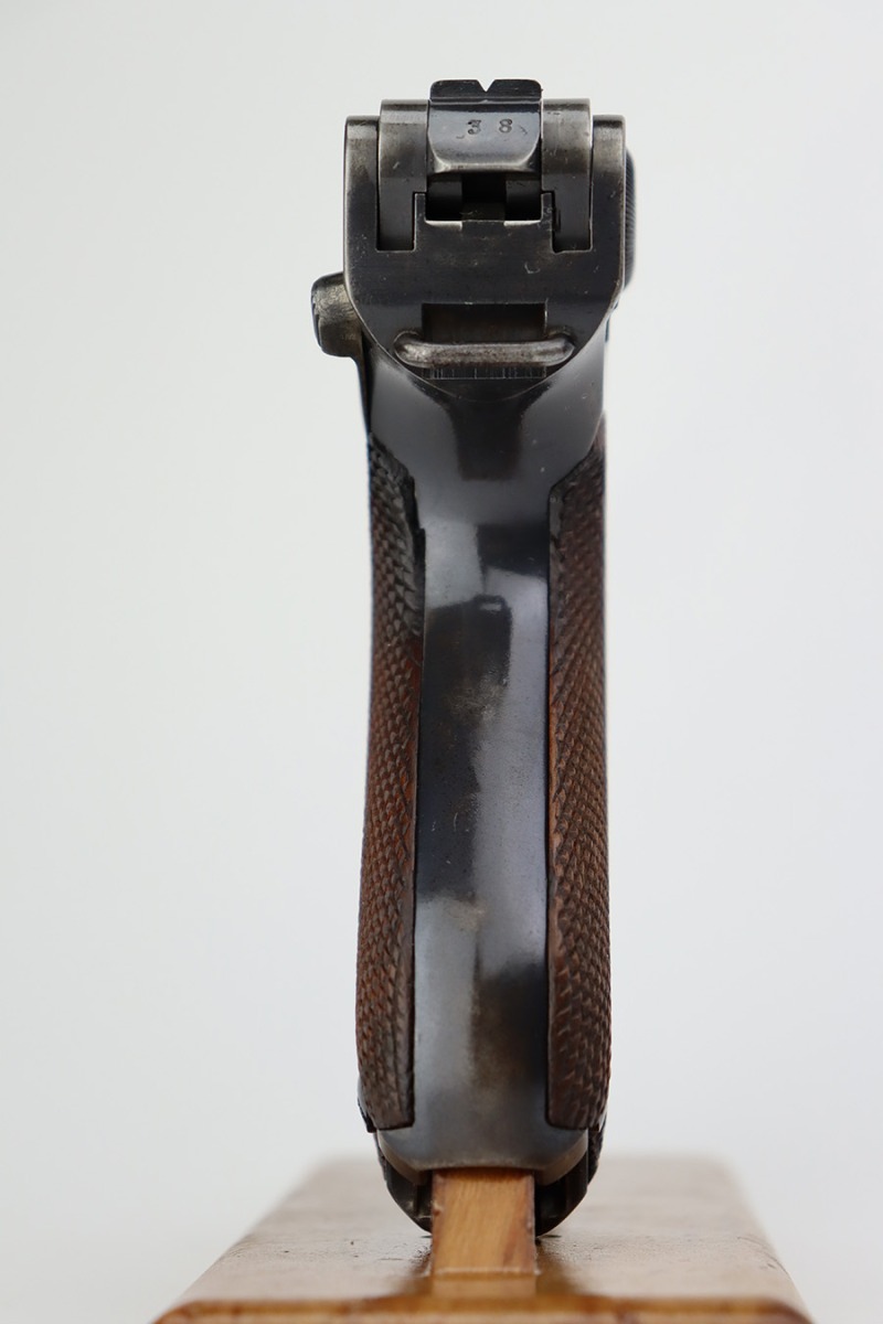 7/7/23 – This is a nice, early example of a military Erfurt Luger from 1913, before the introduction of the stock lug on the frame. All matching numbers throughout, including the original grips. Period original but mismatched magazine. Finish loss on the muzzle, sideplate, ears and general thinning on the straps. Bore has strong rifling but some frost throughout. Grips are in excellent condition with no cracks or chips. Original grip screws are present with Erfurt proofs on each. Listing includes an original Imperial-marked tool and a rare holster with ’13 date. The holster is in excellent condition with minor cracking of the closure strap but no notable defects otherwise.